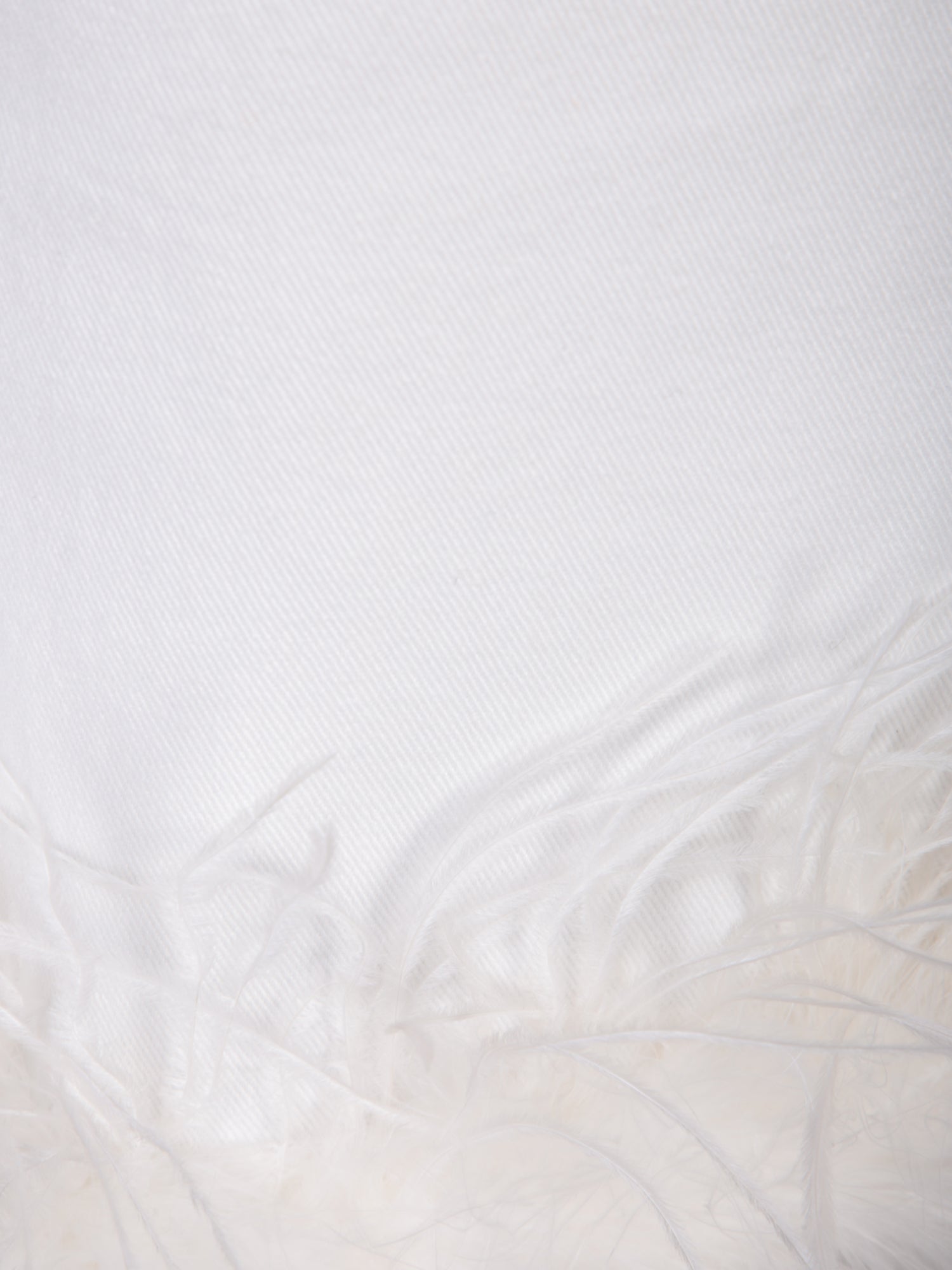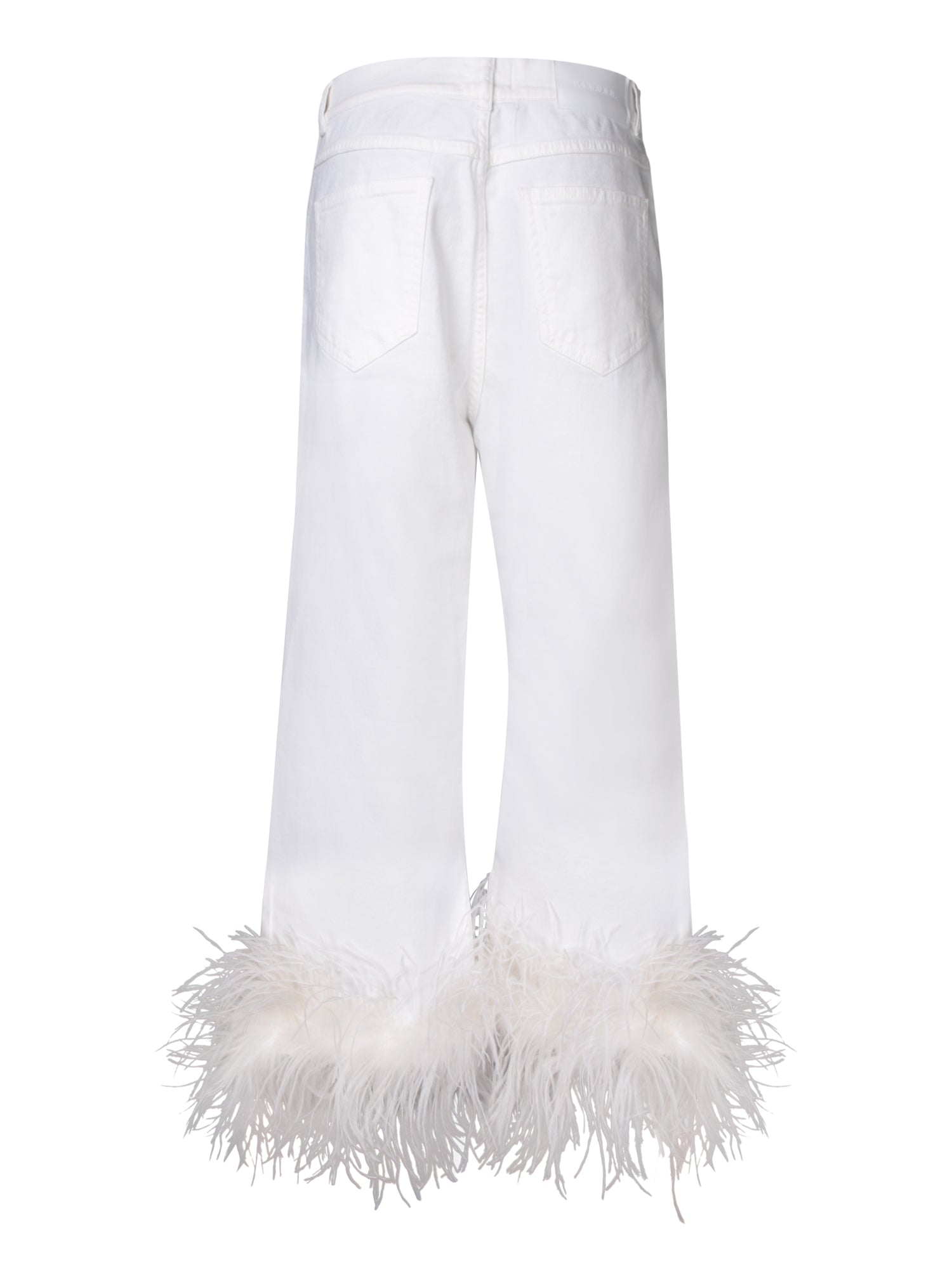 Wide-leg jeans. Feather trim at hem. Zip and button closure.