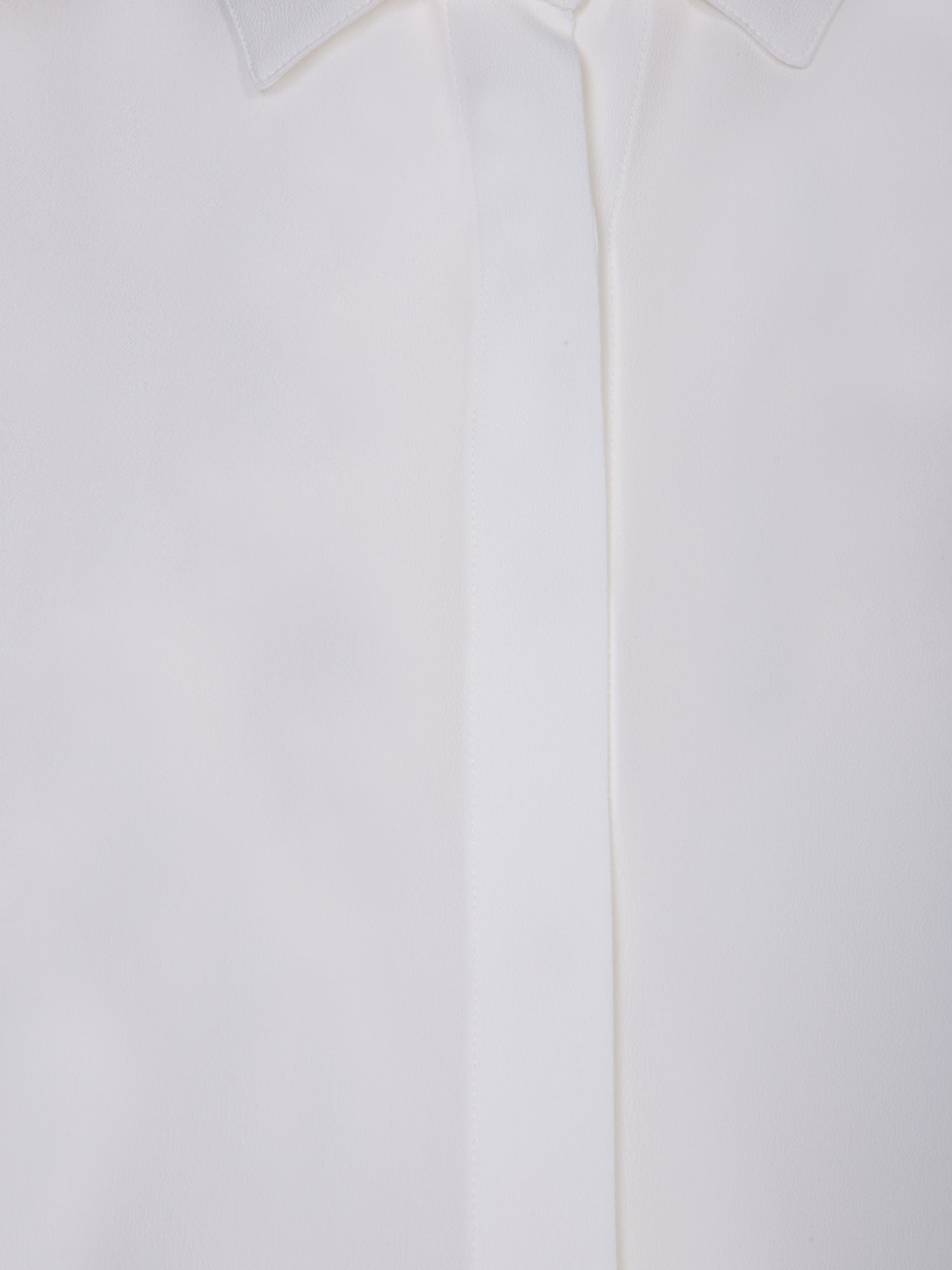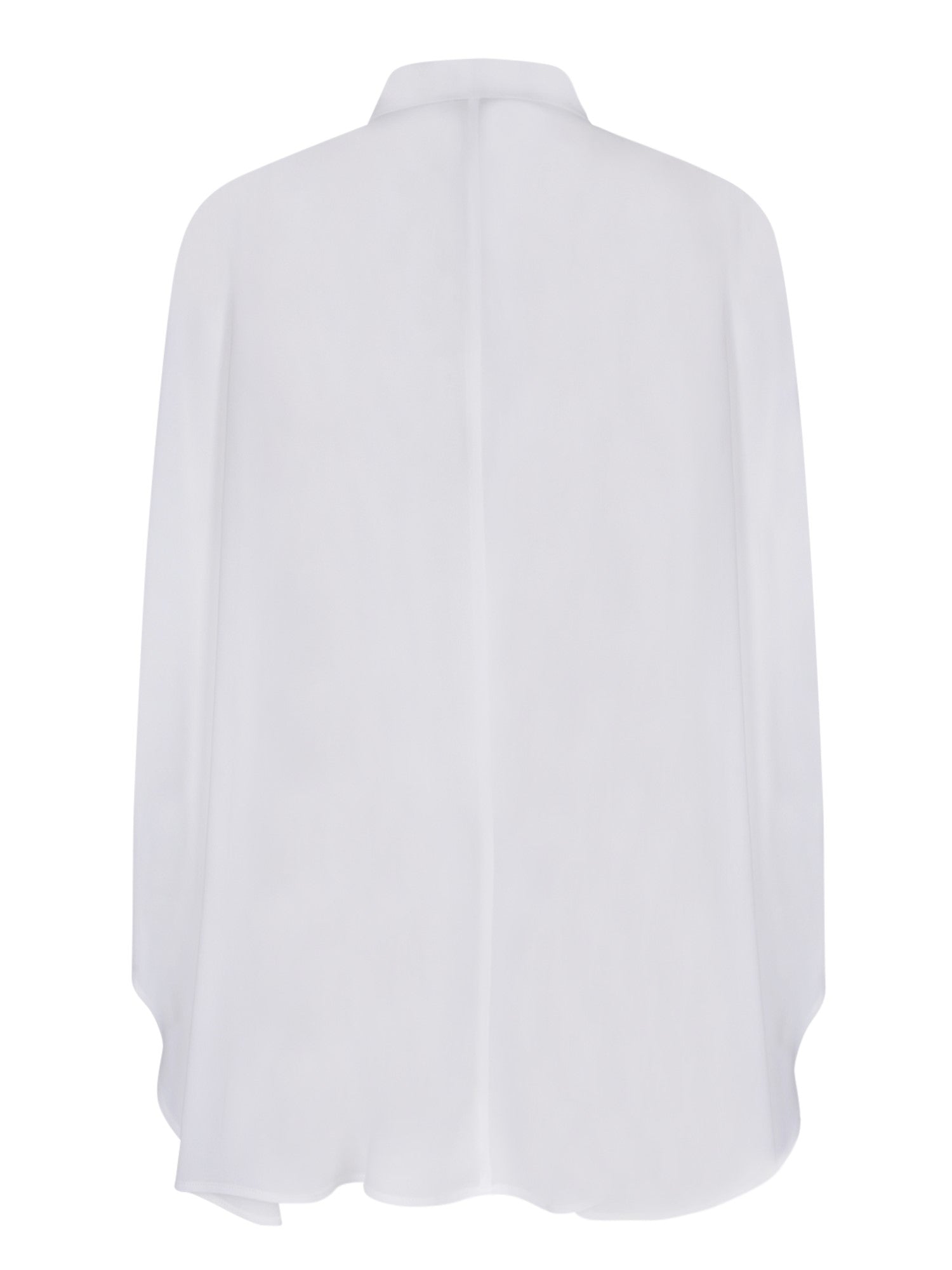 Pointed collar. Front button opening. Three-quarter sleeves. Asymmetric hem.