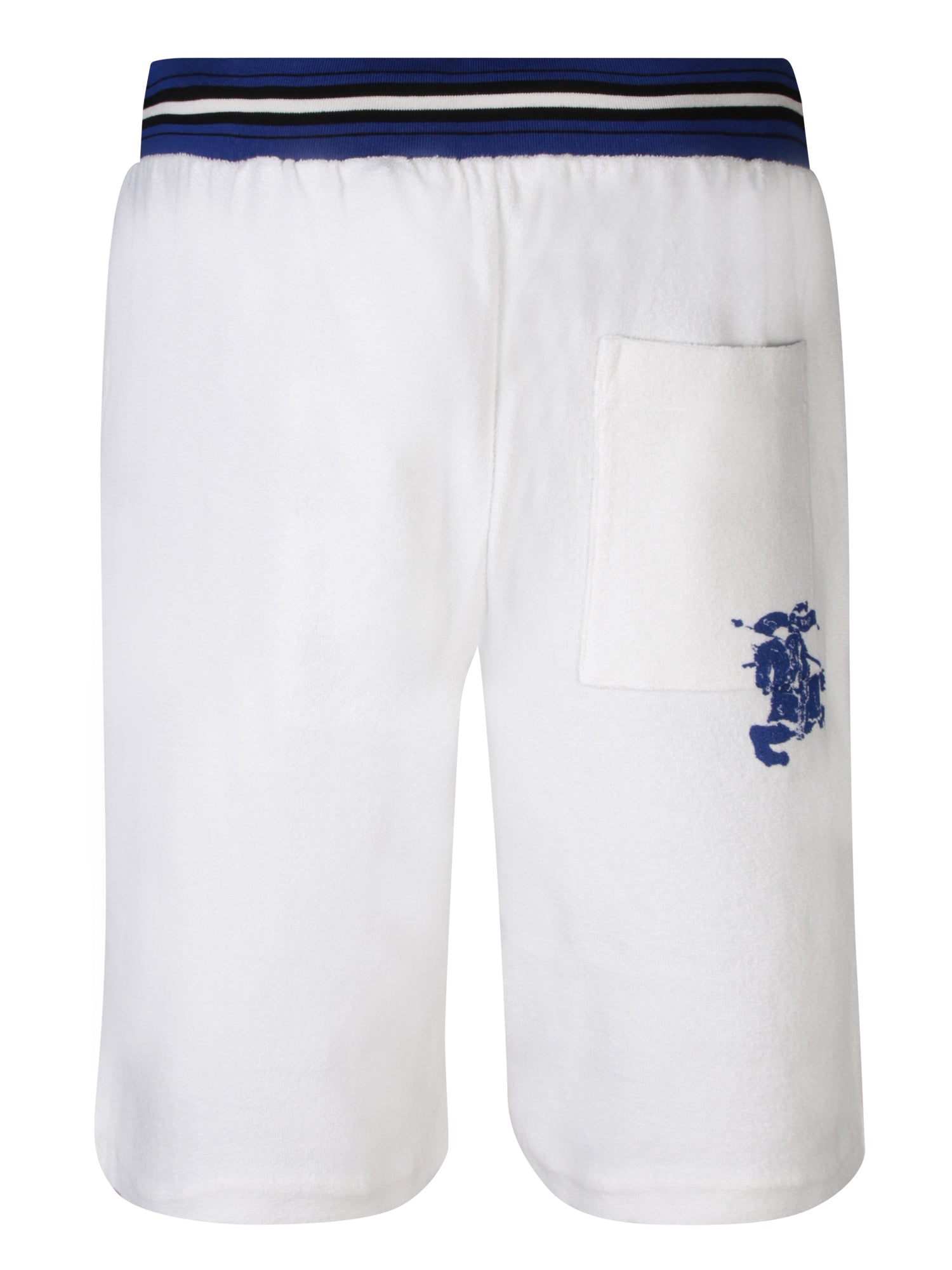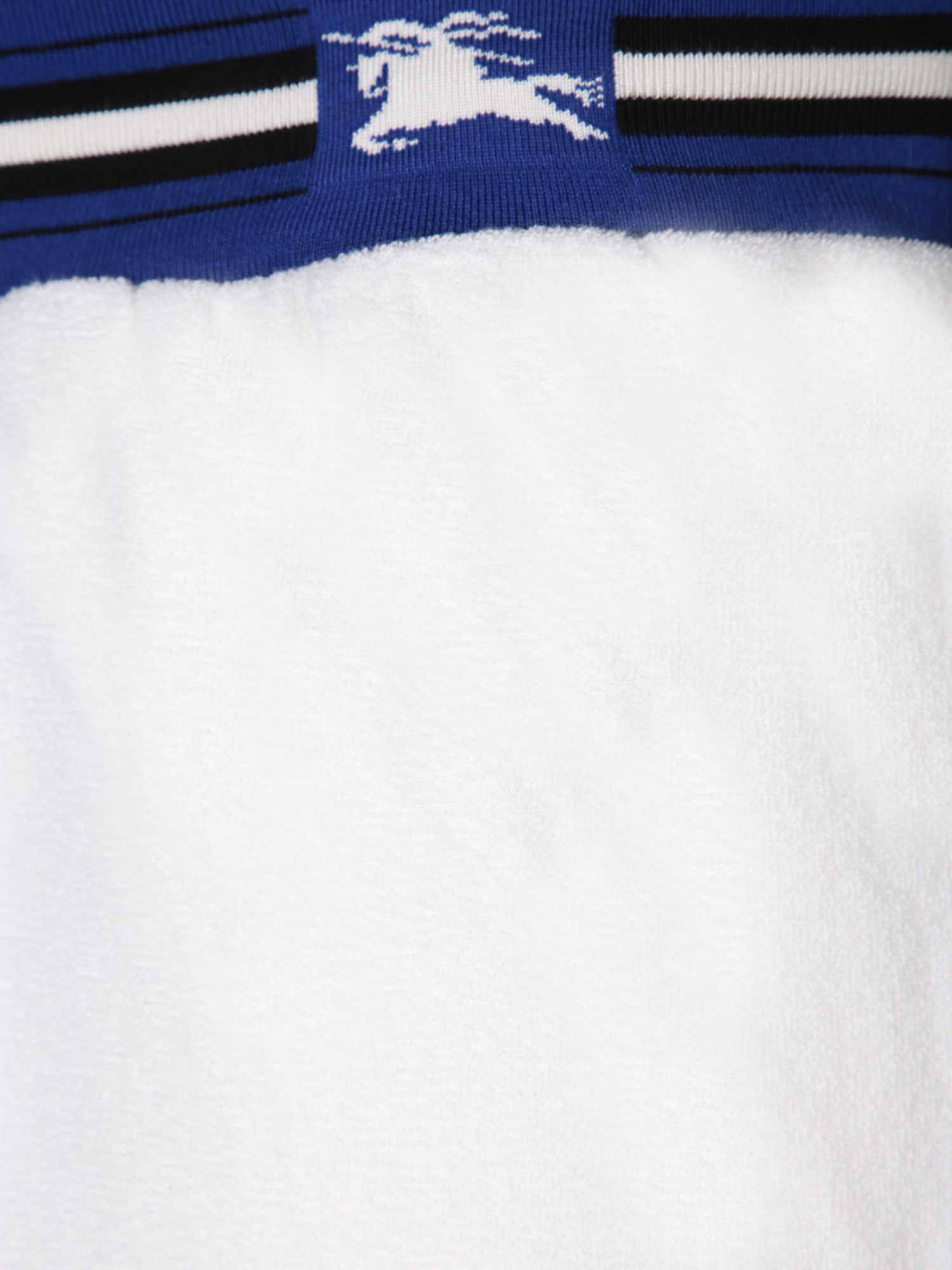 Towelling fabric shorts with embroidered logo. Elastic waistband with blue and white stripes.