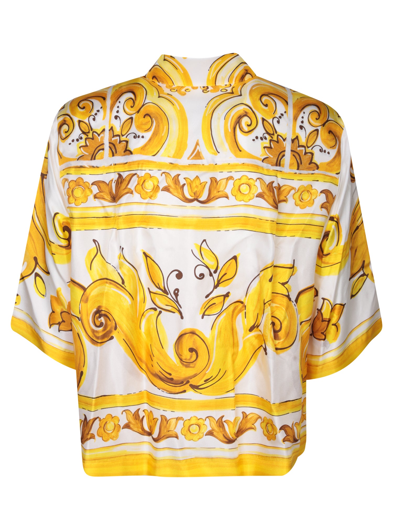 Short sleeve silk shirt. Classic collar with frontal button closure. Vibrant Maiolica print.
