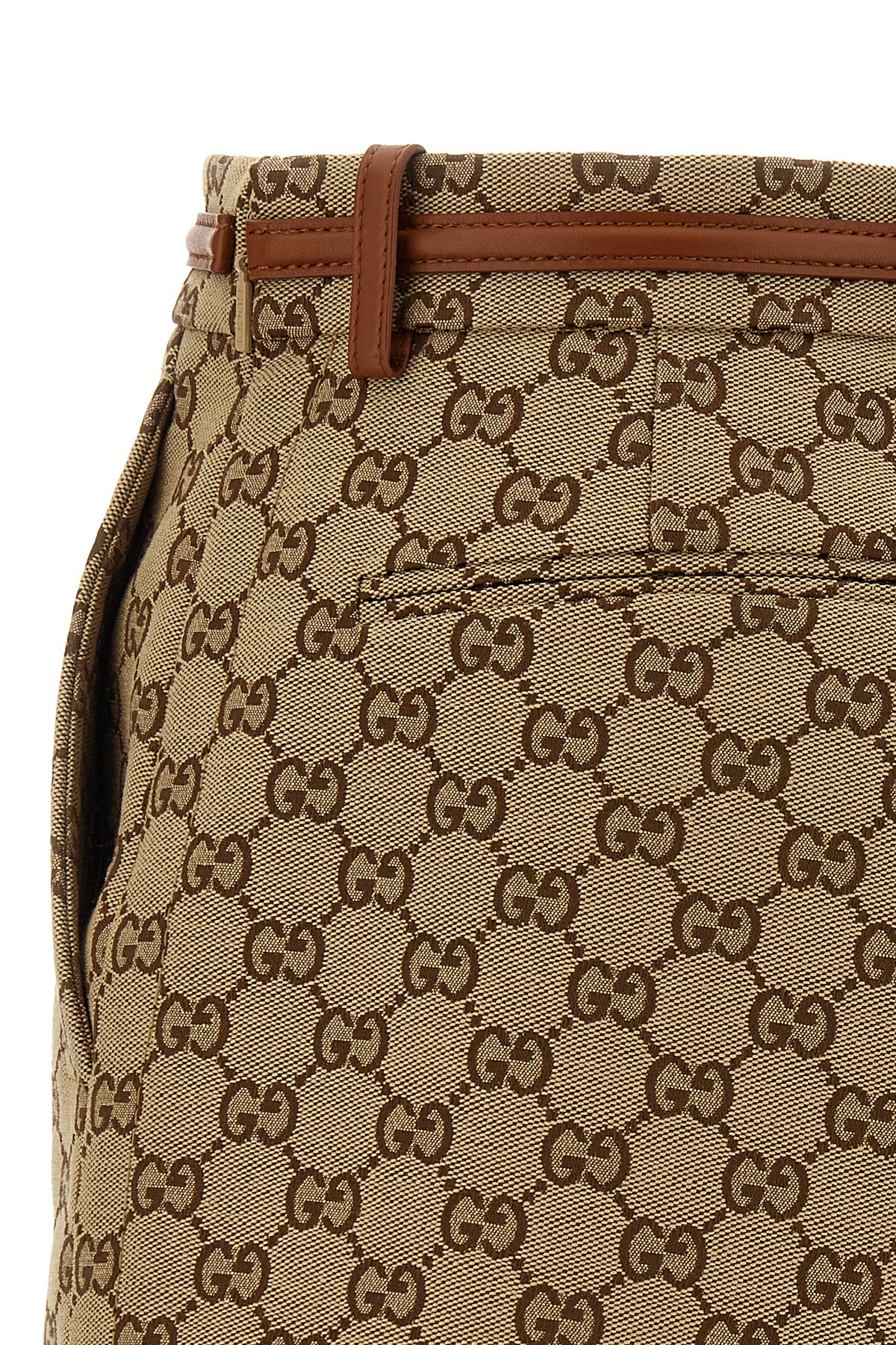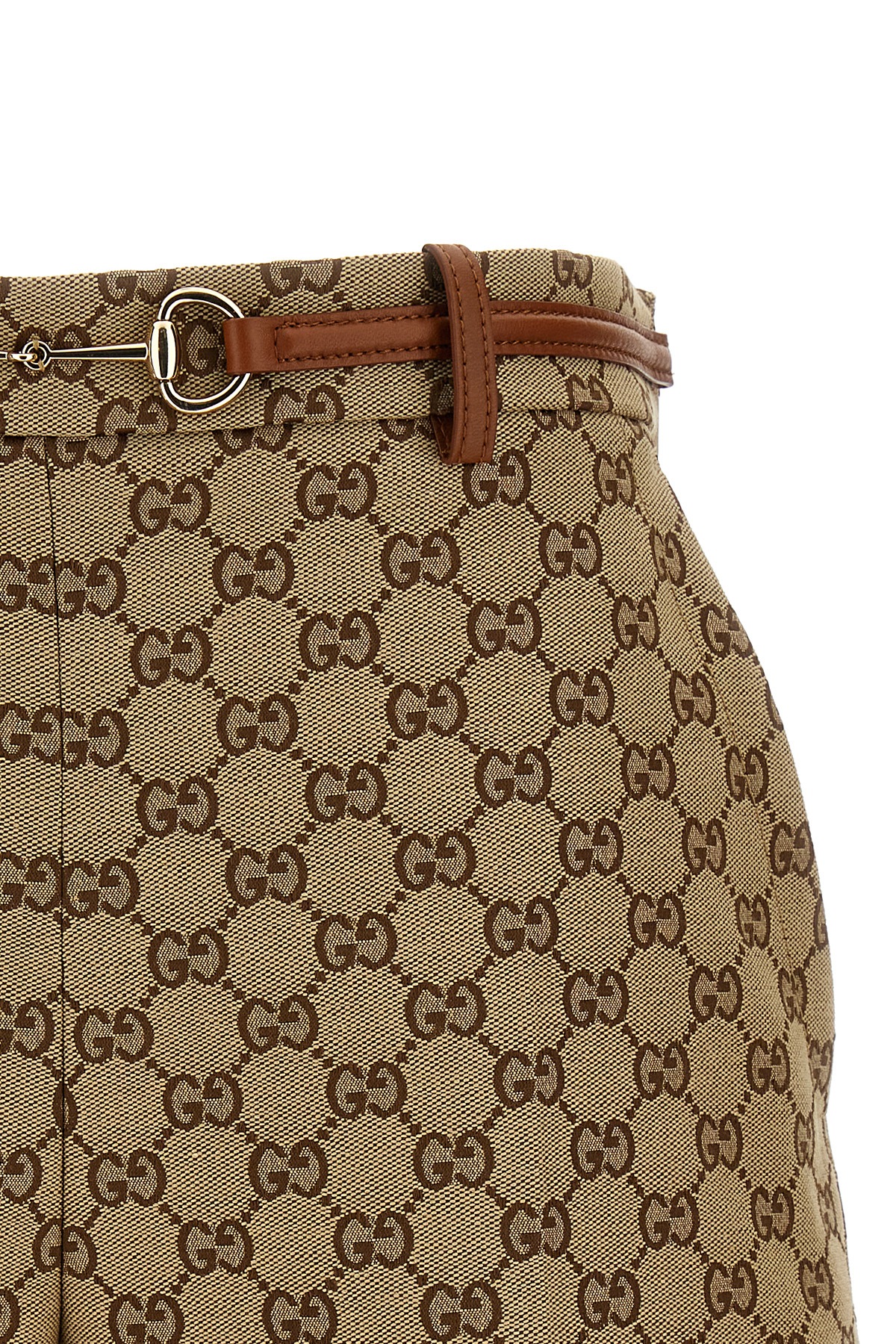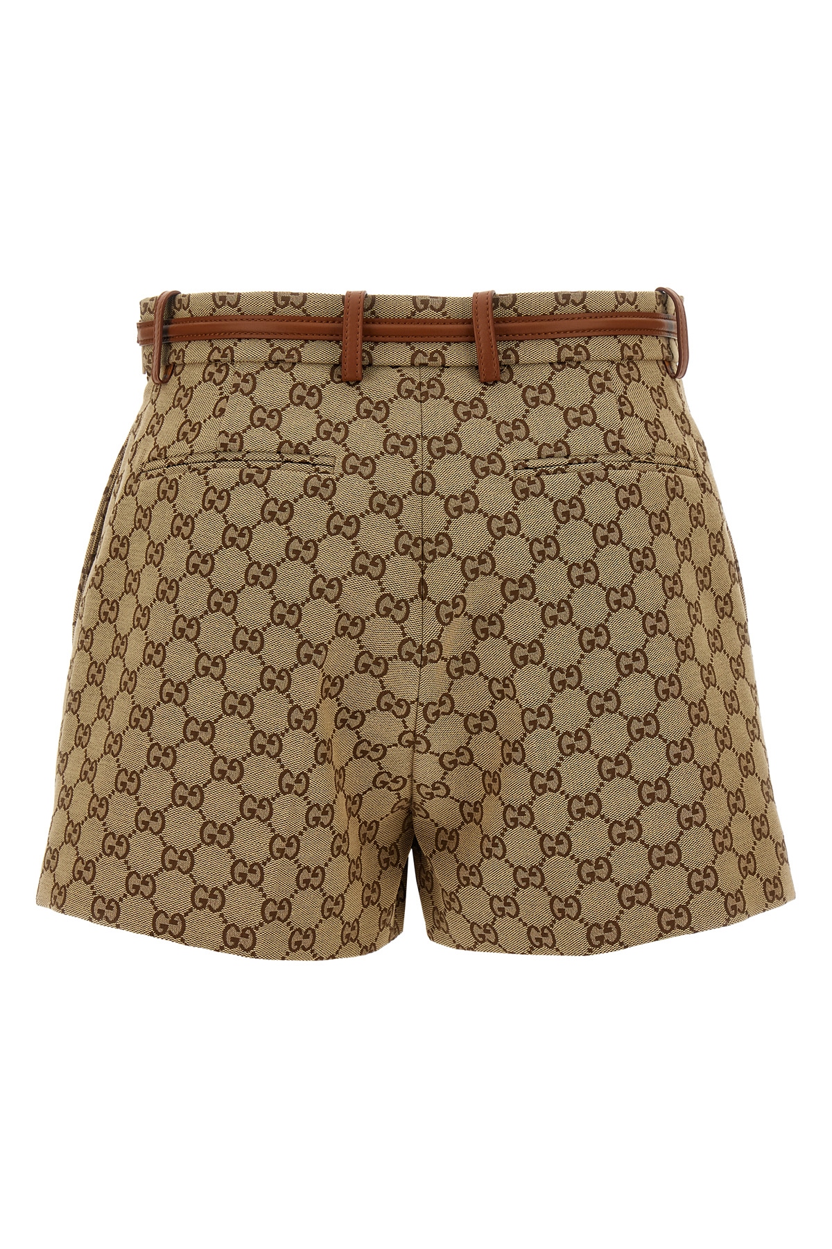 GG fabric shorts with leather belt and metal snaffle detail, side zip closure, pockets, lining.