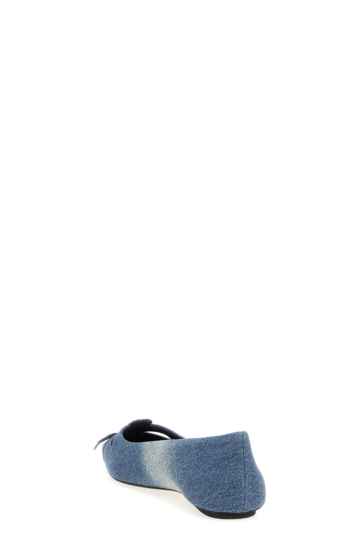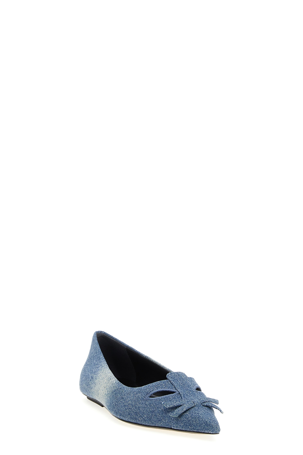 'The Denim Kat' ballet flats in washed cotton denim with cut-out detail with front bow, pointed toe, padded insole, leather sole.