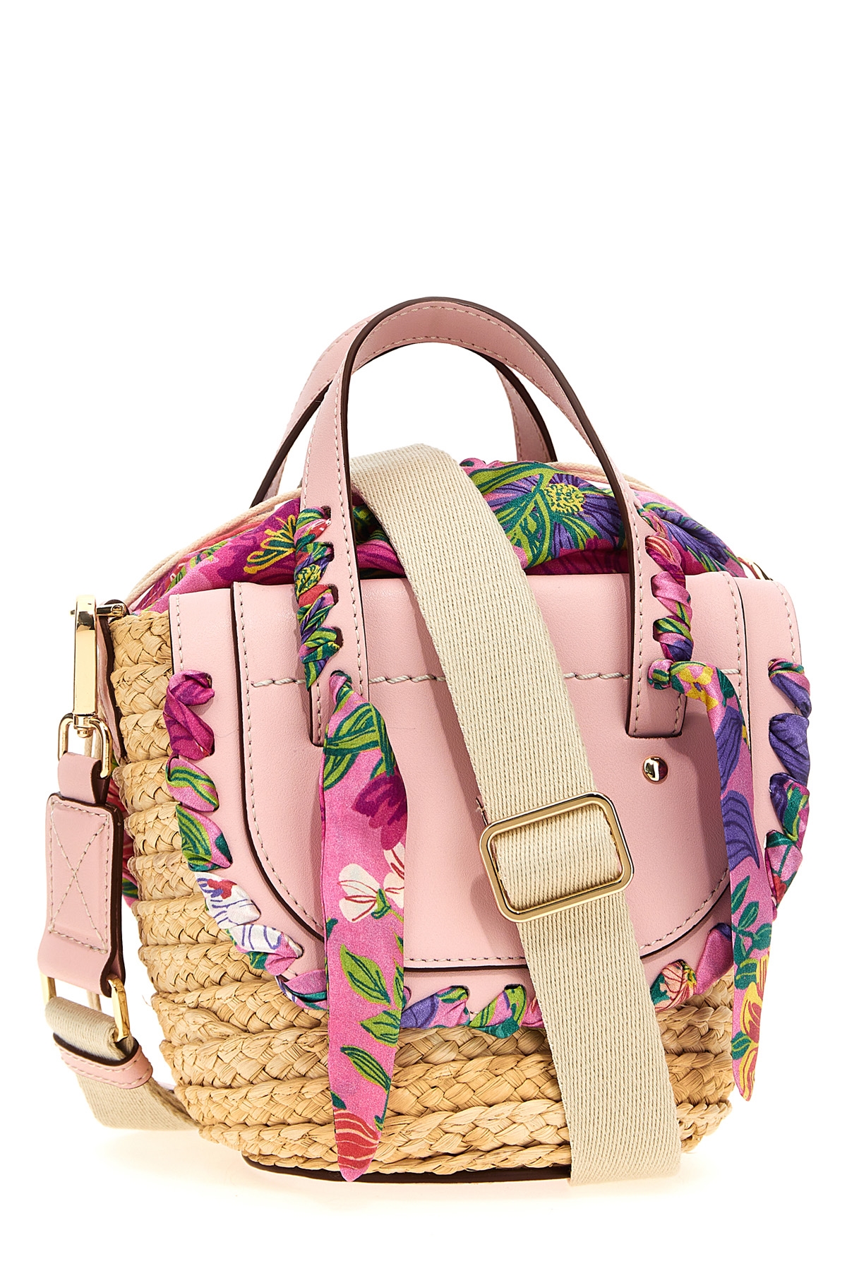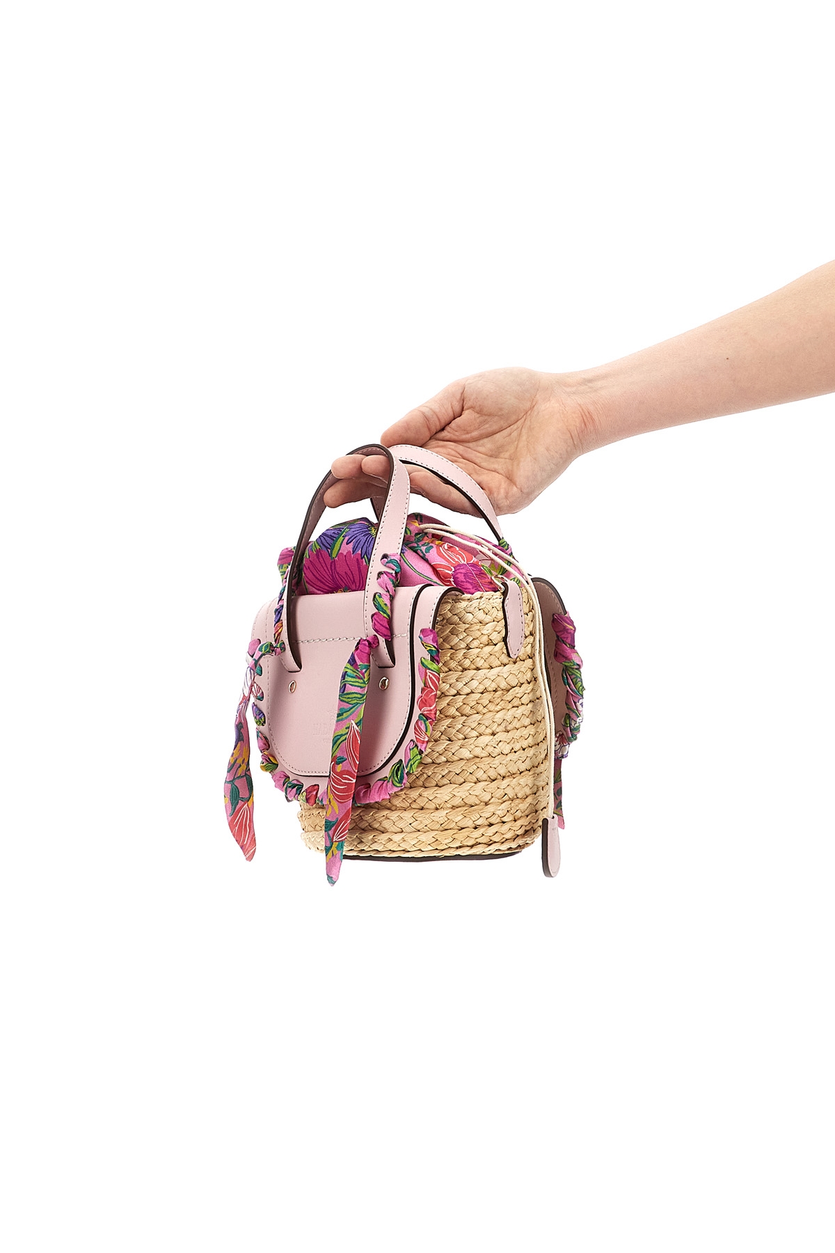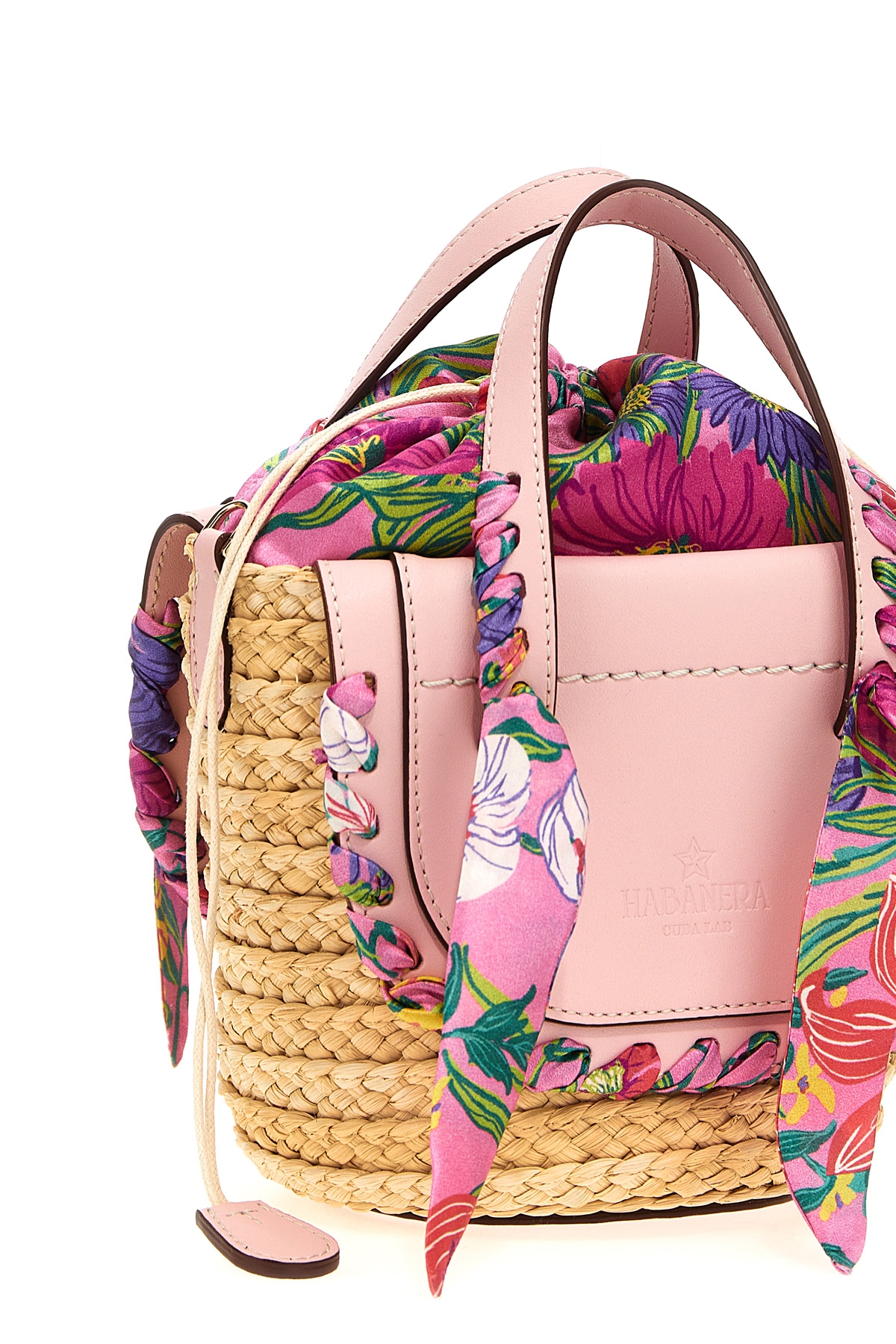 Cuba Lab x SanPa 'Habanera Silk- Bomb Flower' raffia and leather handbag with silk details, double handle, floral print silk lining with drawstring closure, adjustable and removable fabric shoulder strap.