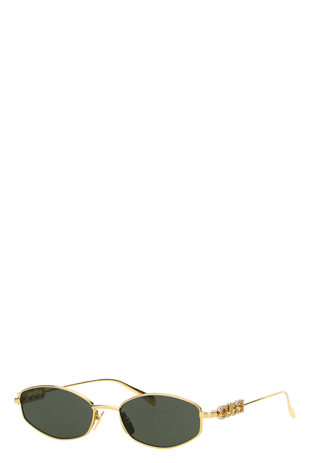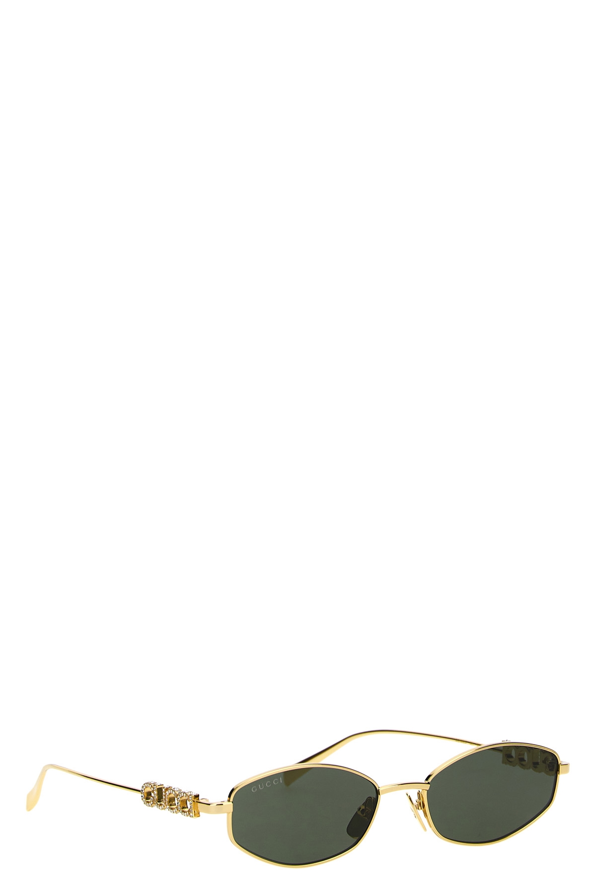 Metal sunglasses, oval mount, cut-out logo temples with crystals.
