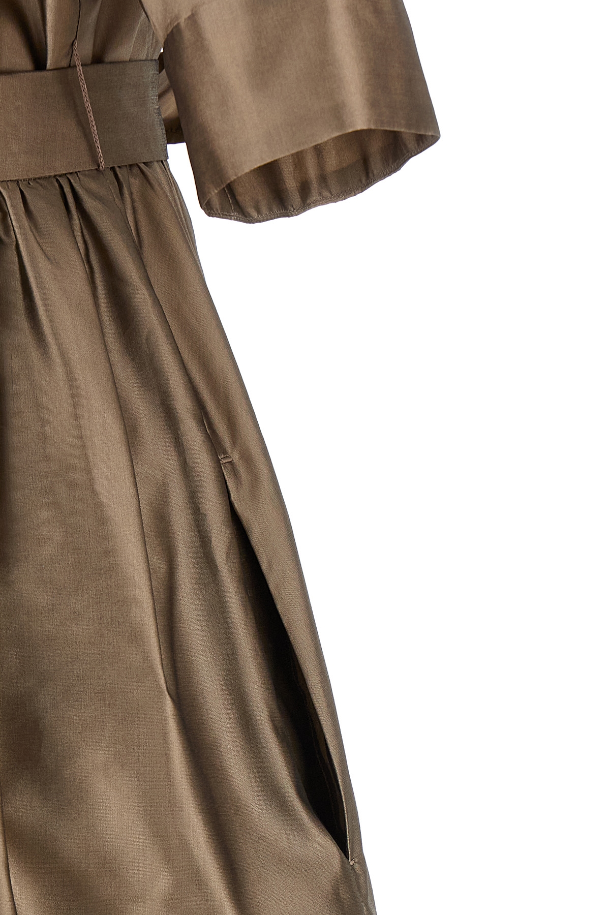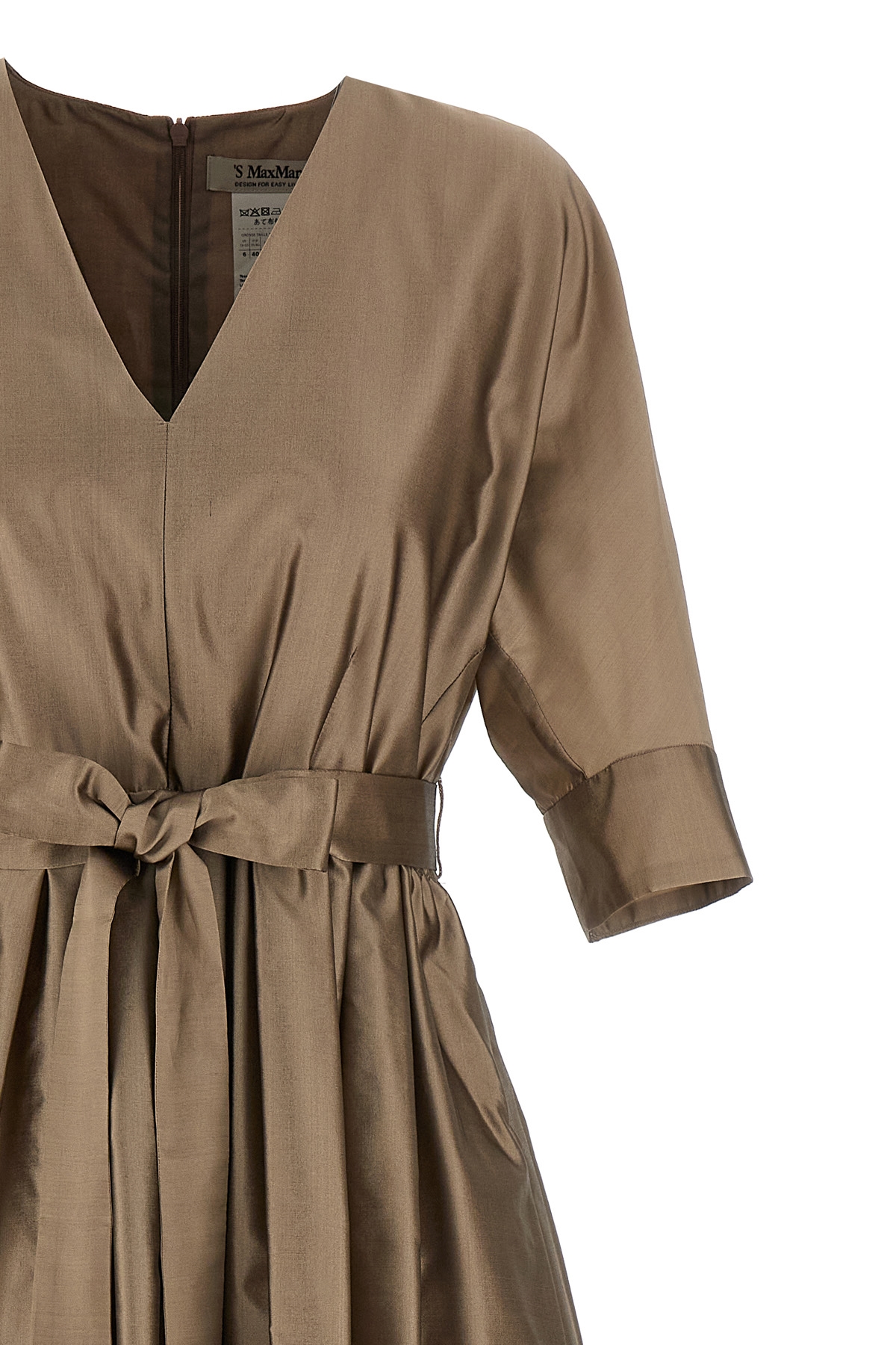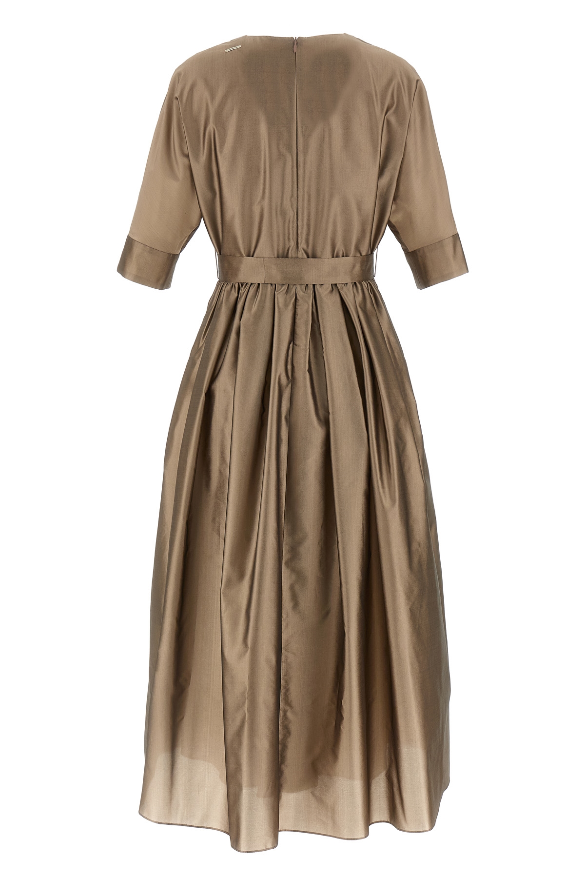 Viola' silk blend midi dress with V-neck, short sleeves, wrinkled waist with removable strap, back zip closure.