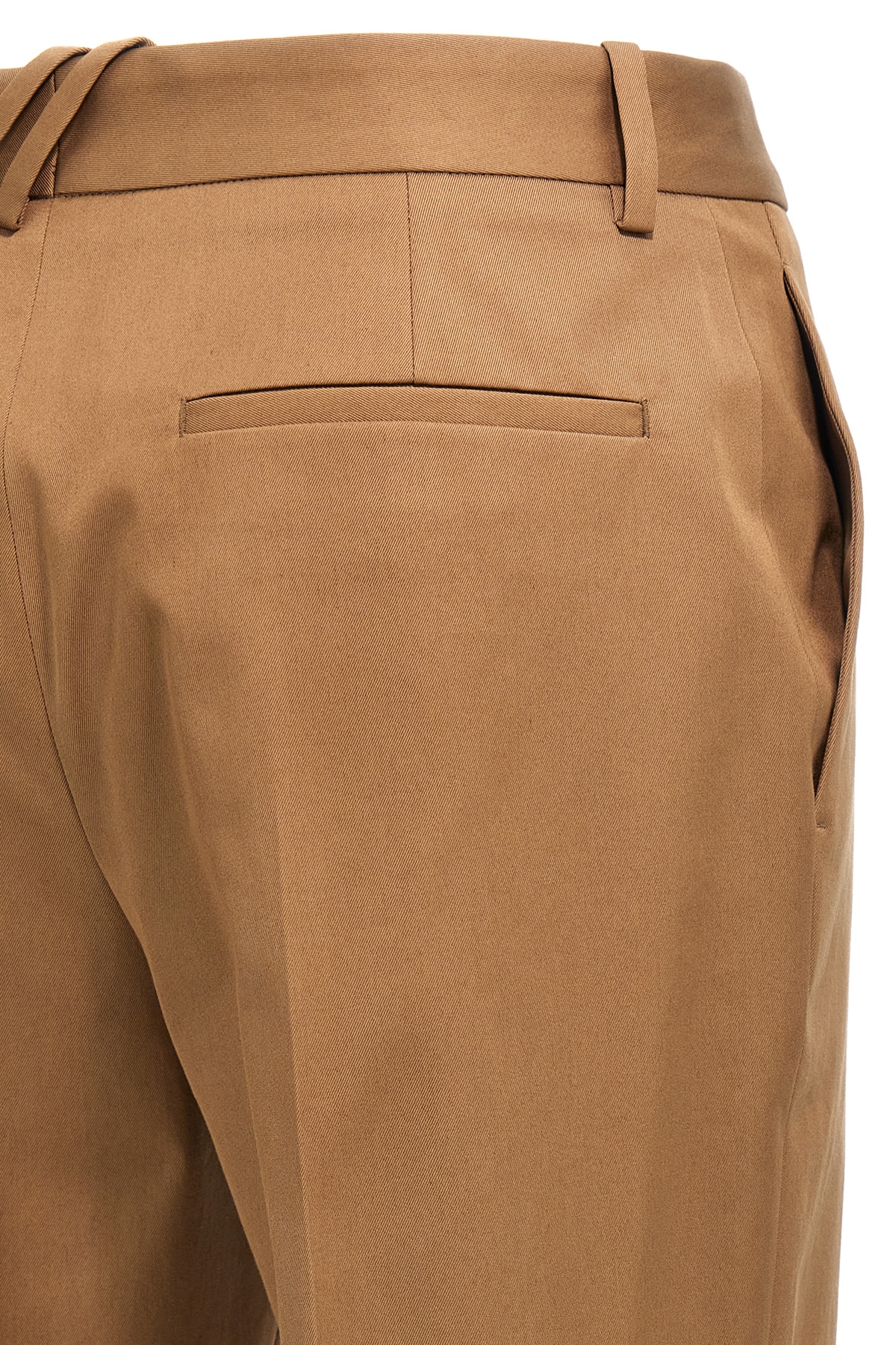 Cotton trousers, straight leg, slightly slim fit, front stretched pleat, metal logo detail, front zip and hook closure, pockets.