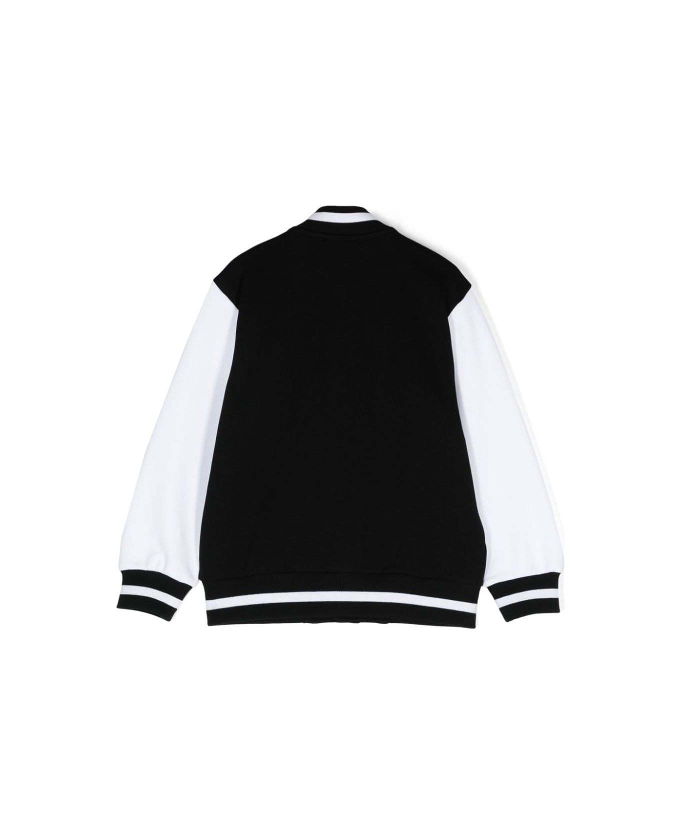 Bomber con applicazione nero/bianco , cotone, trama jersey. Applicazione con logo sul petto, bordo con righe a coste. Colletto basso a coste chiusura frontale con abbottonatura a pressione. Maniche lunghe due tasche laterali a filetto. Orlo dritto Composizione. cotone 100%