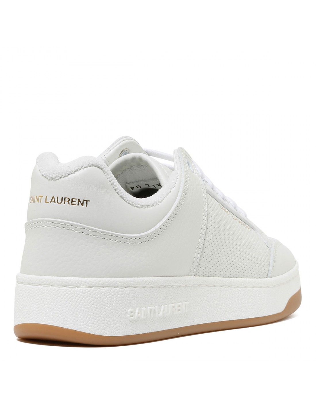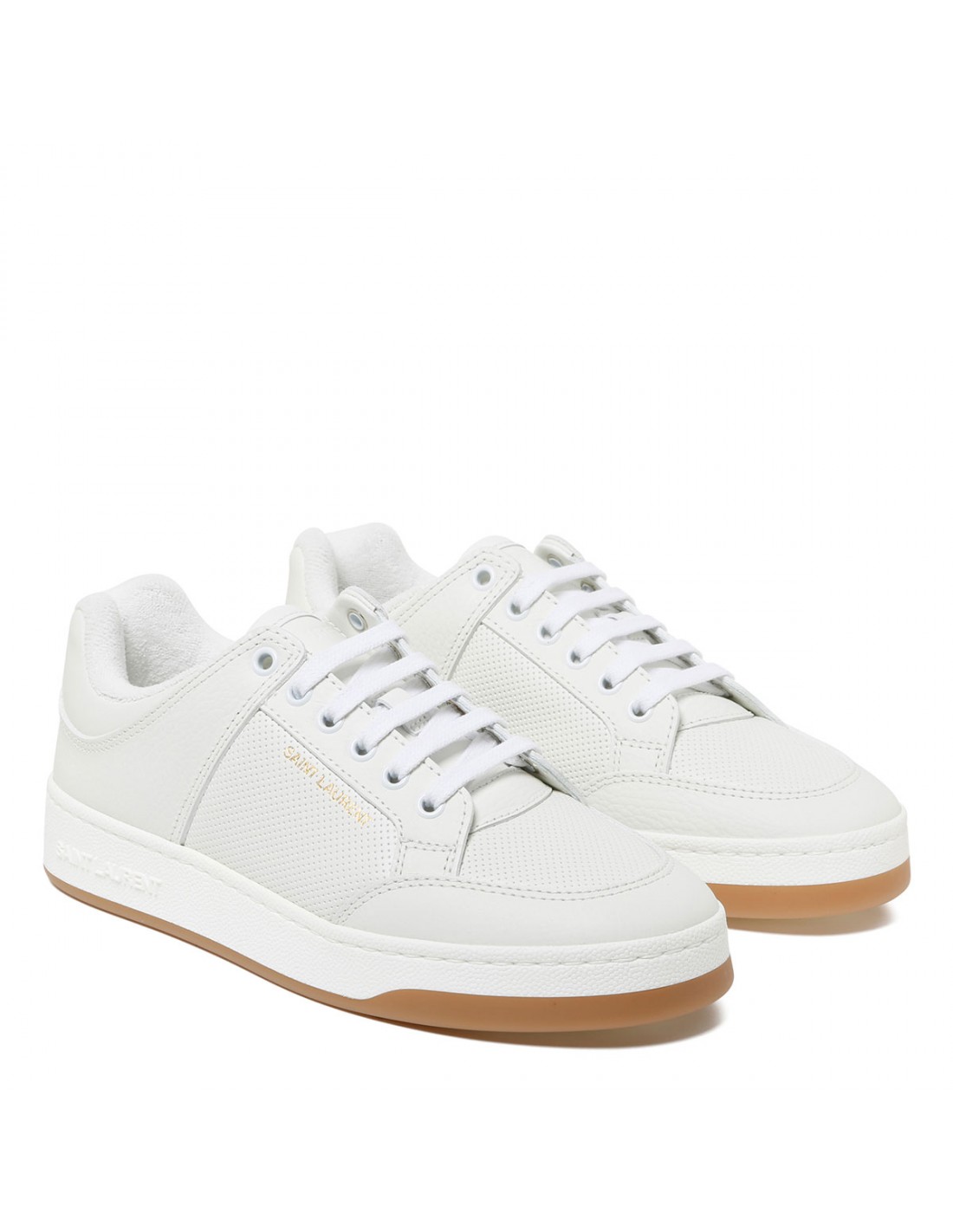 White leather SL/61 sneakers from Saint Laurent featuring perforated leather panels, gold-tone Saint Laurent logo across the pull tab, gold-tone Saint Laurent logo on side, rounded toe, padded collar, lace-up fastening, rubber sole.
