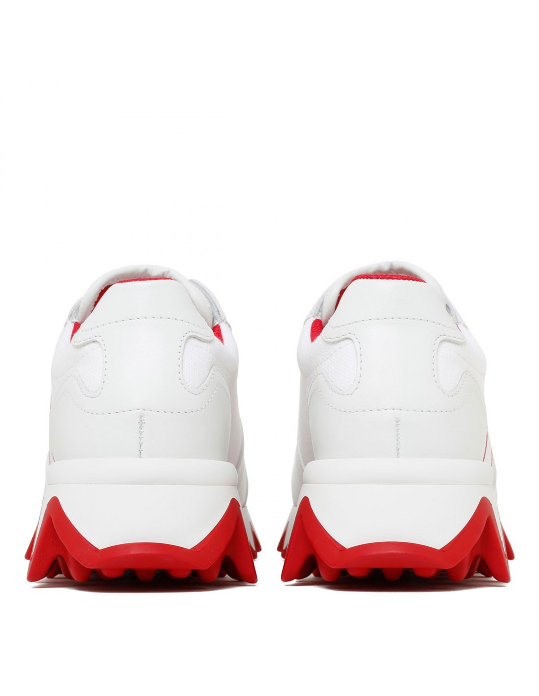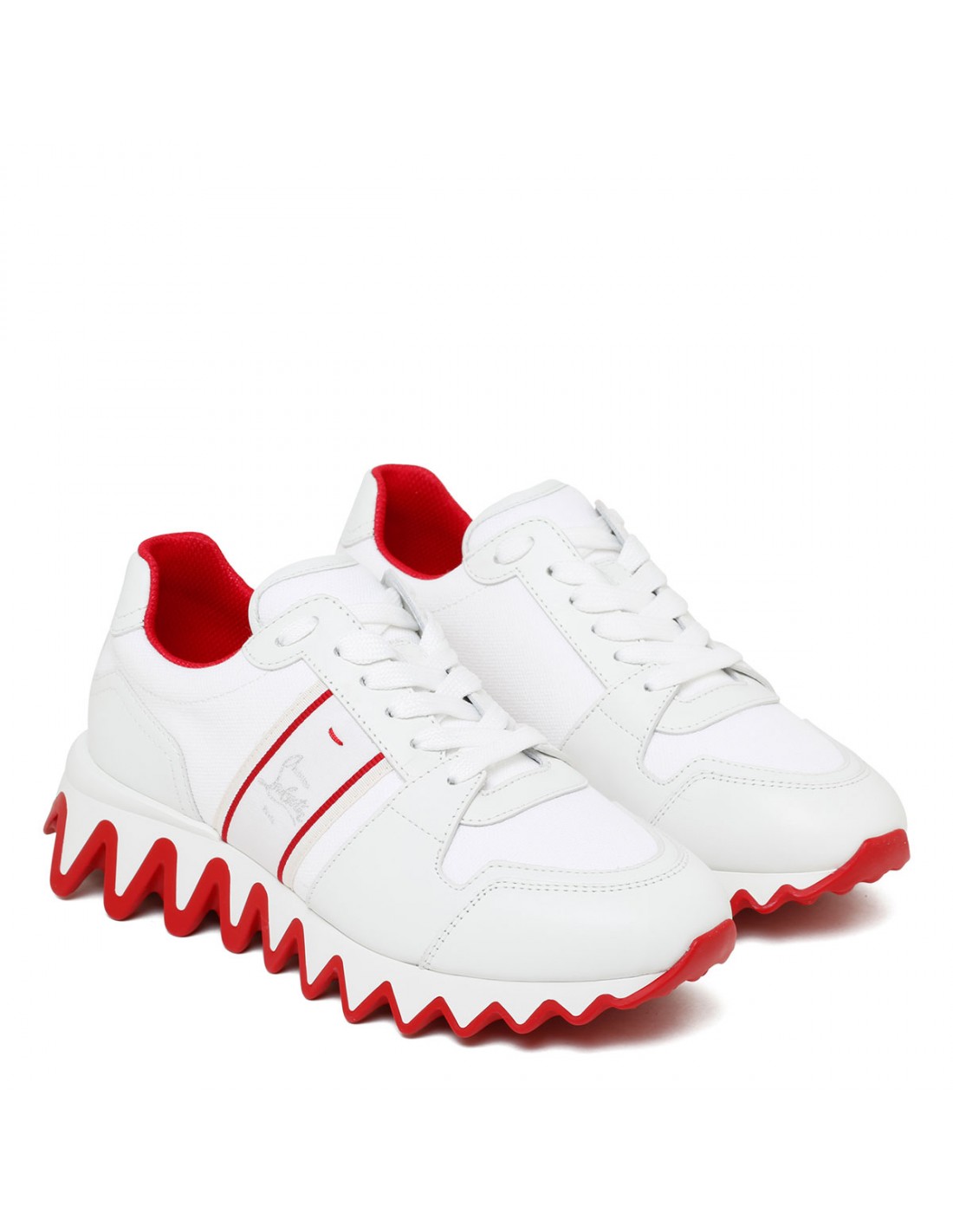 White calf leather and fabric Nastroshark sneakers from Christian Louboutin featuring red color accents, logo embroidered on side, round toe, lace-up fastening, padded collar,? two-color rubber sole evoking shark teeth.