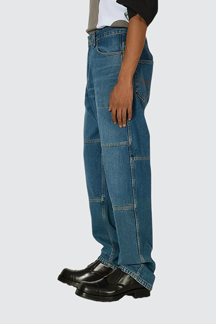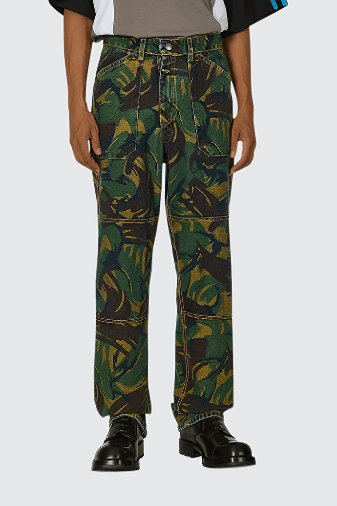 Martine Rose Reversible Camo Denim Jeans. Zip and button closure. Color: Blue camo