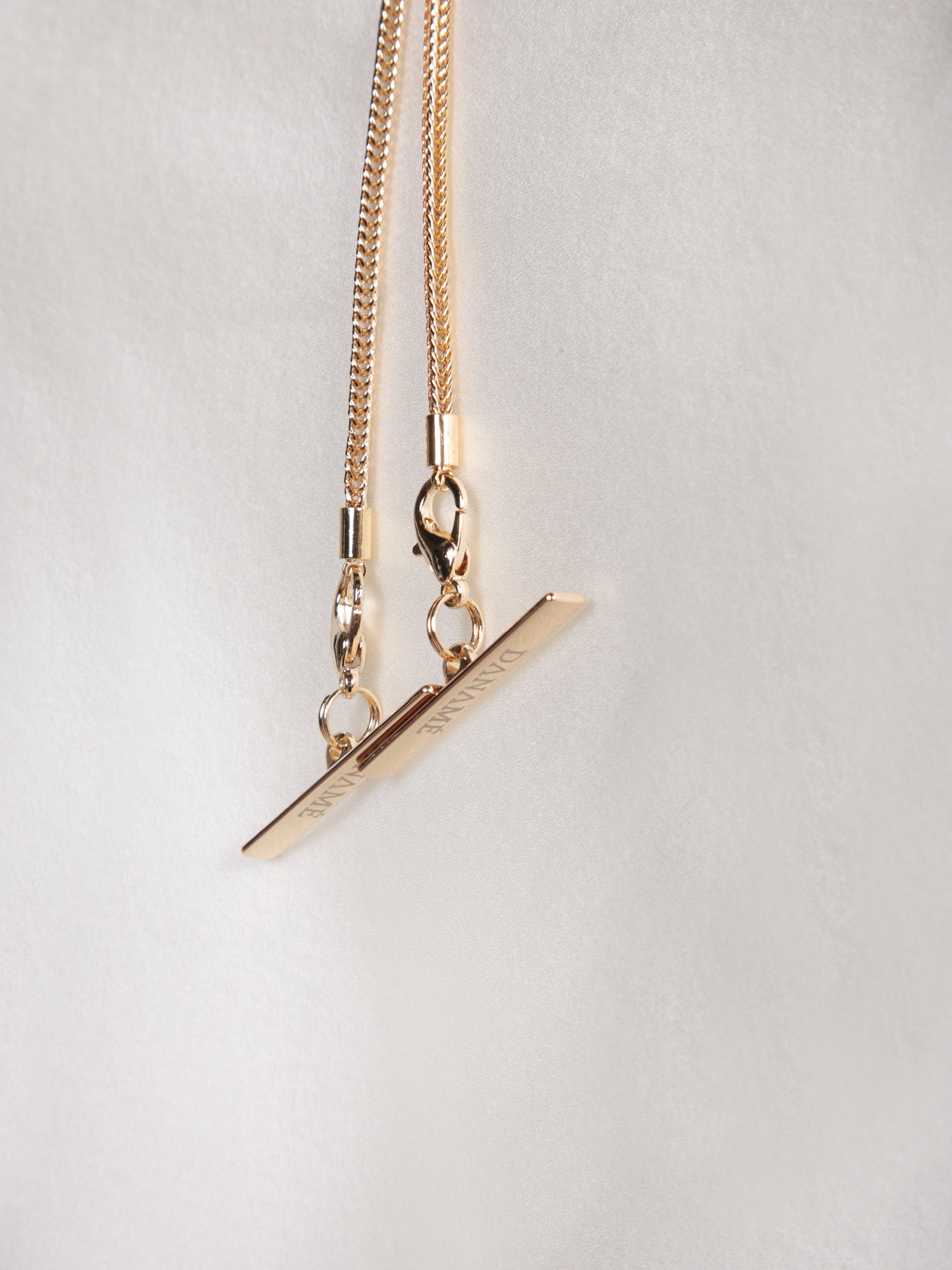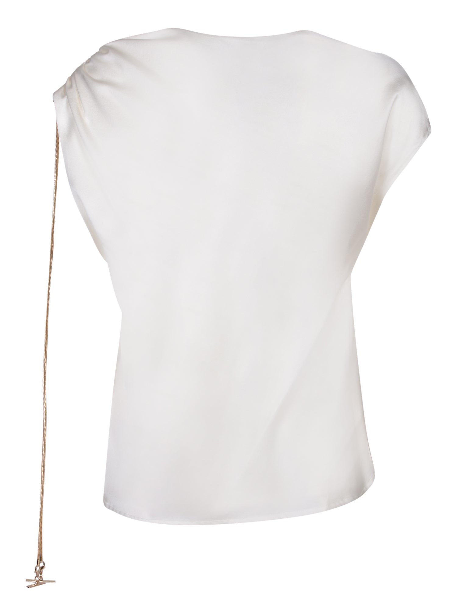 One-shoulder sleeve. Shirred fabric. Cord detail with metallic finish.