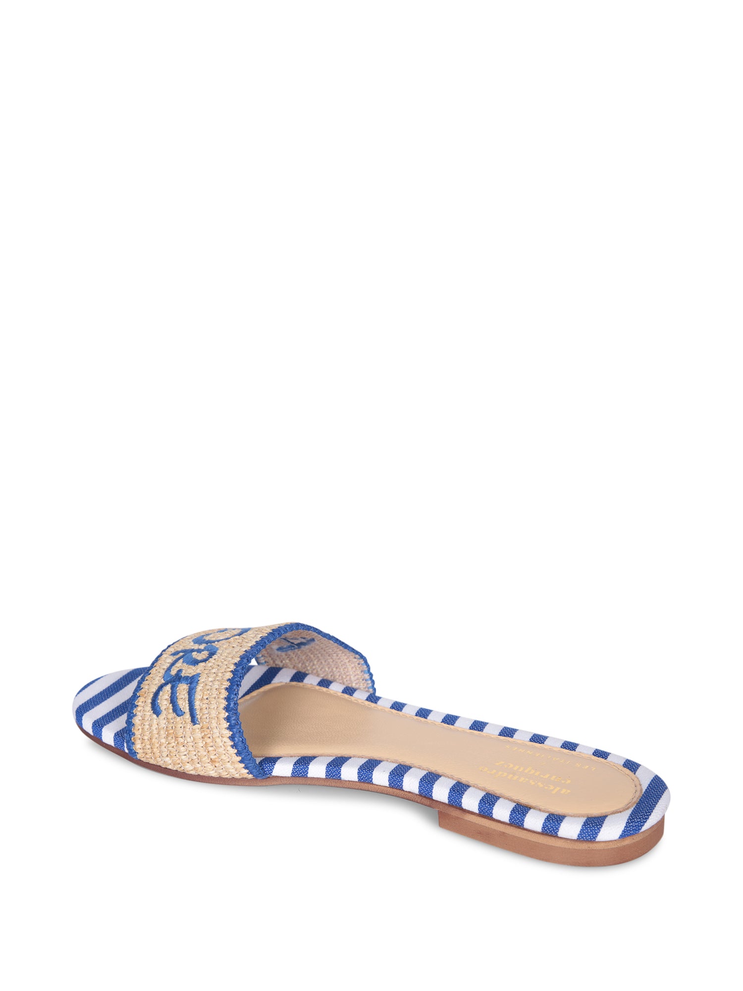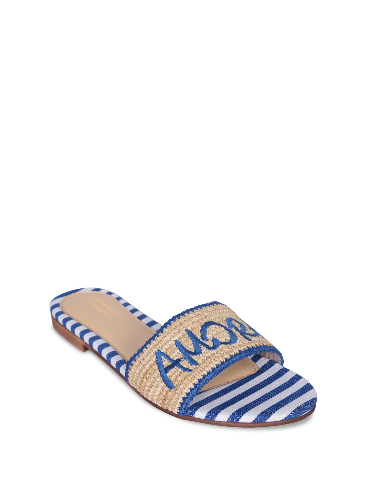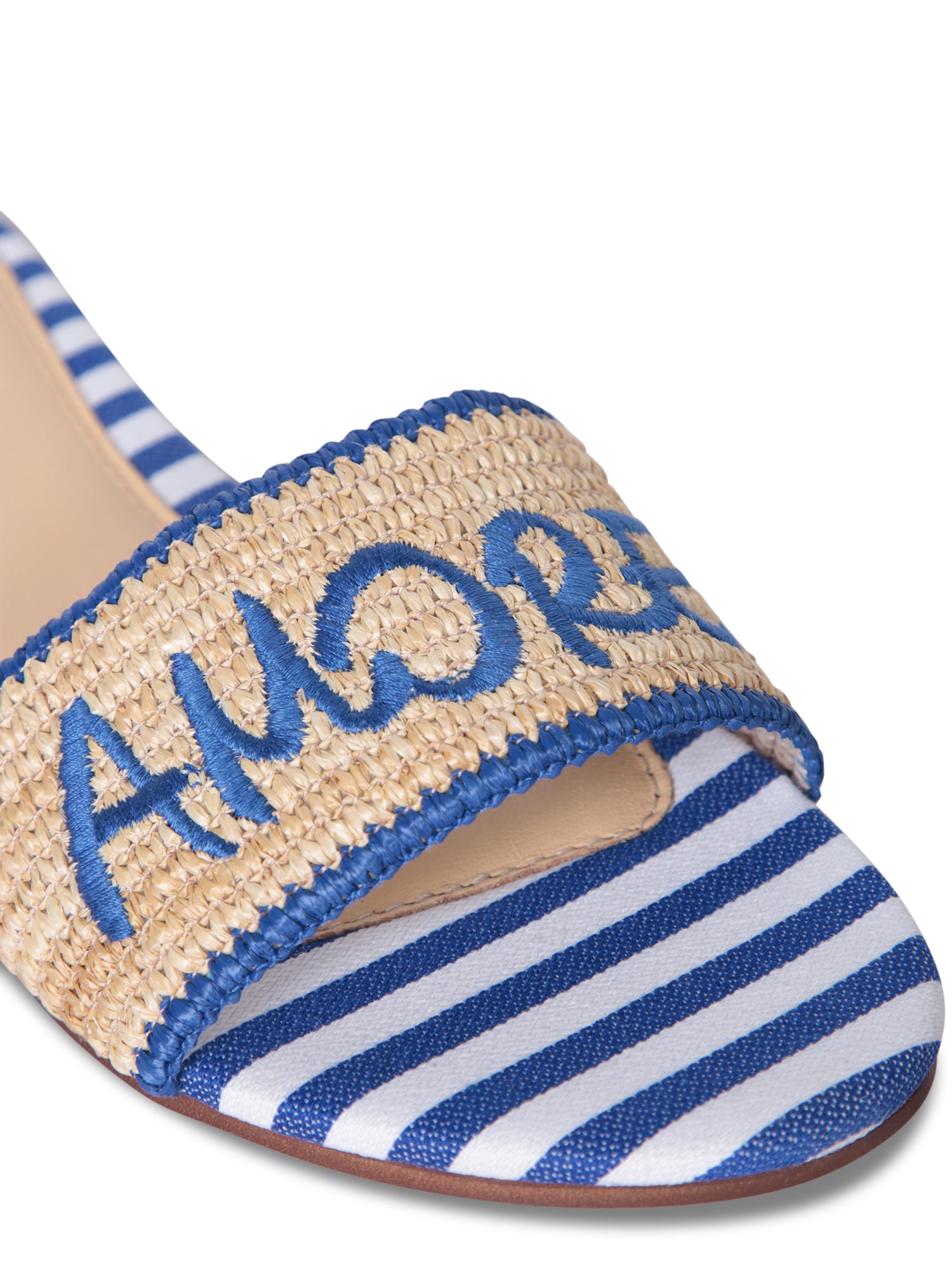 Slip-on sandals with woven raffia upper and striped fabric details. Eye-catching design featuring 'AMORE' embroidery in blue.