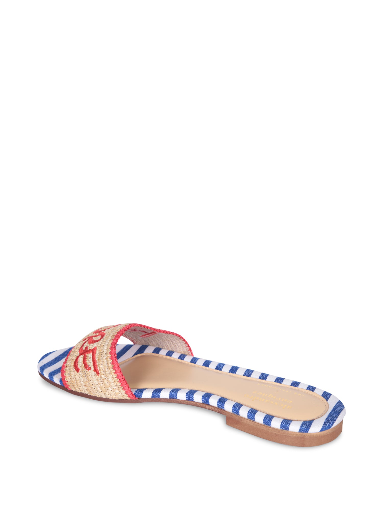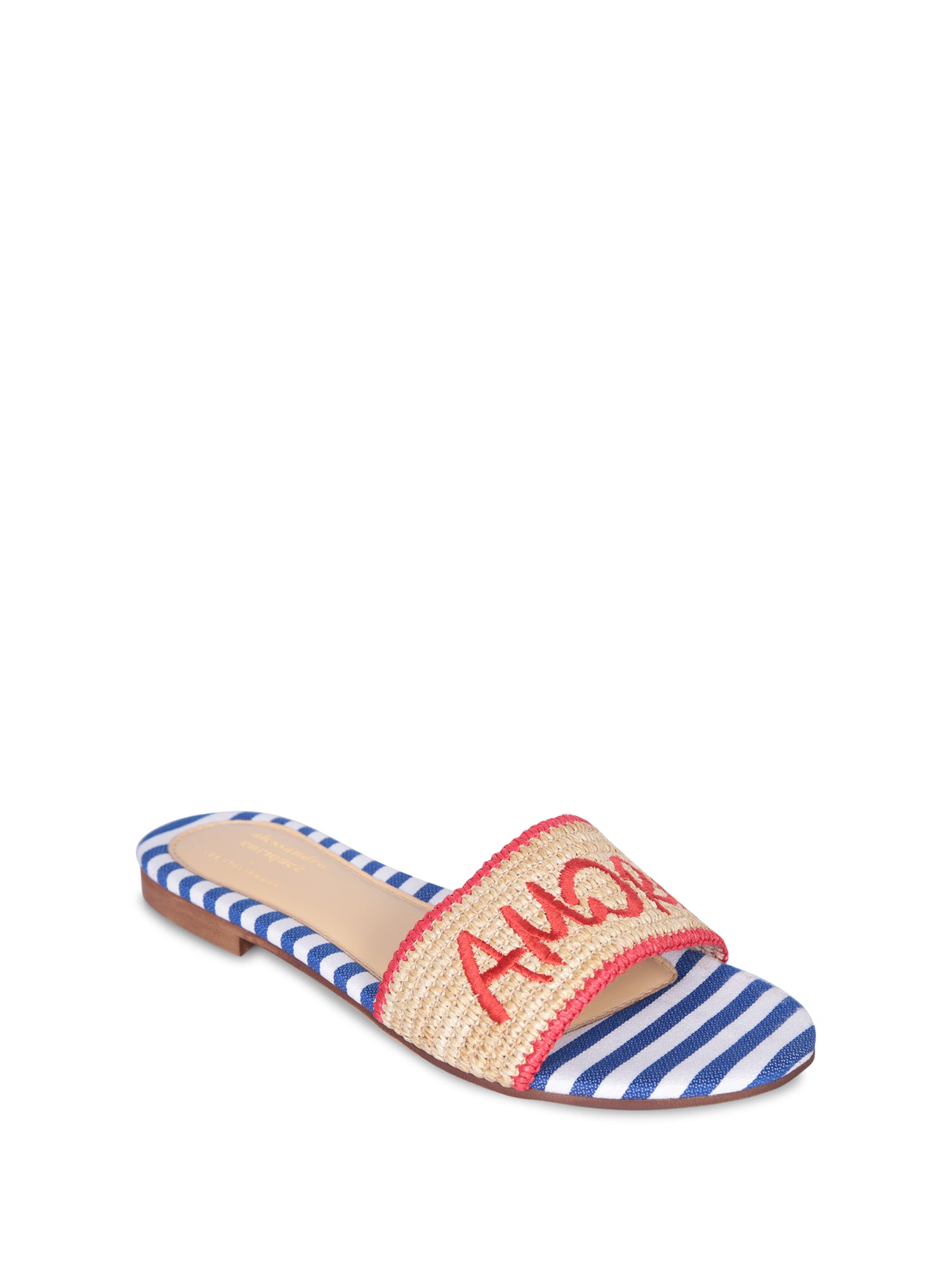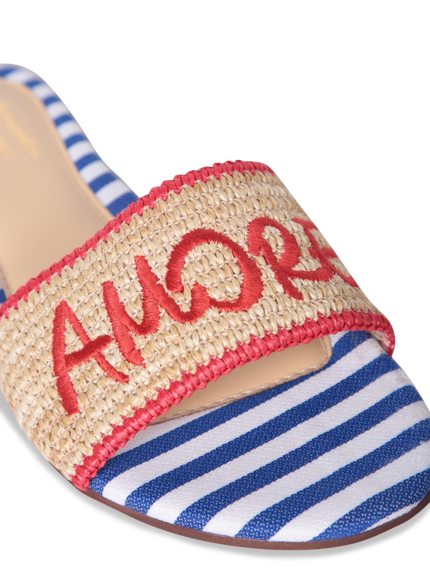 Striped design, raffia fabric finish, AMORE logo applique on the front.