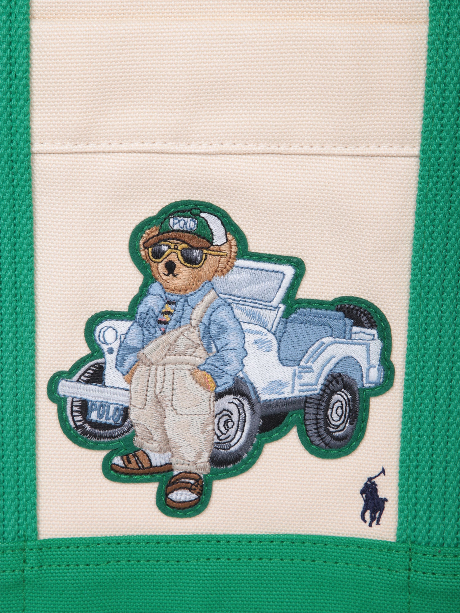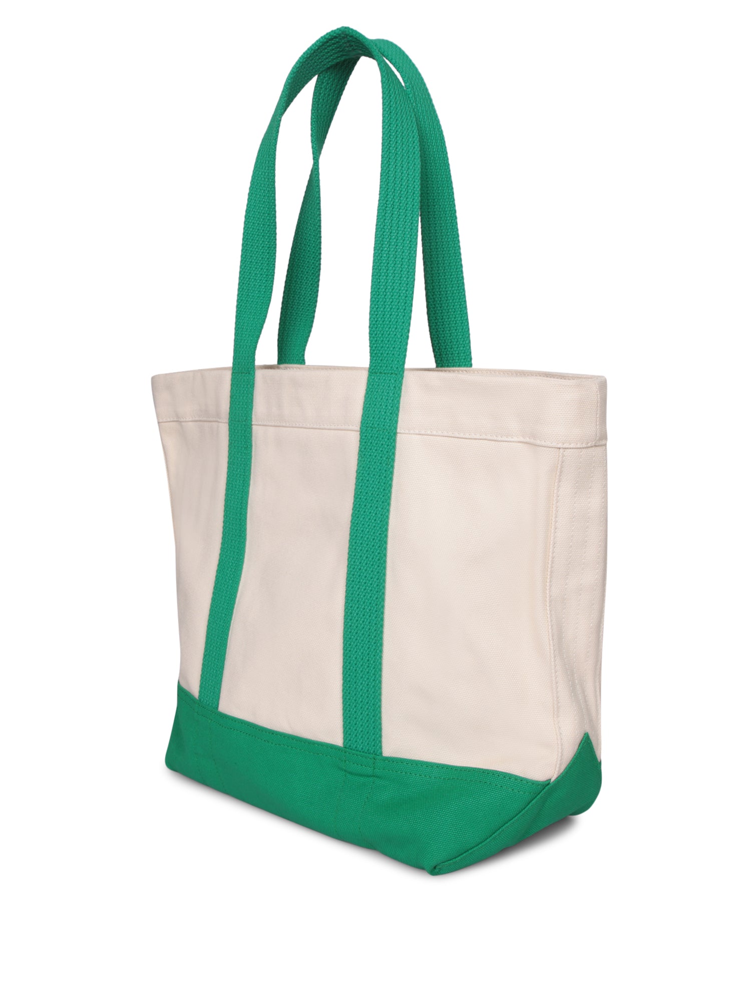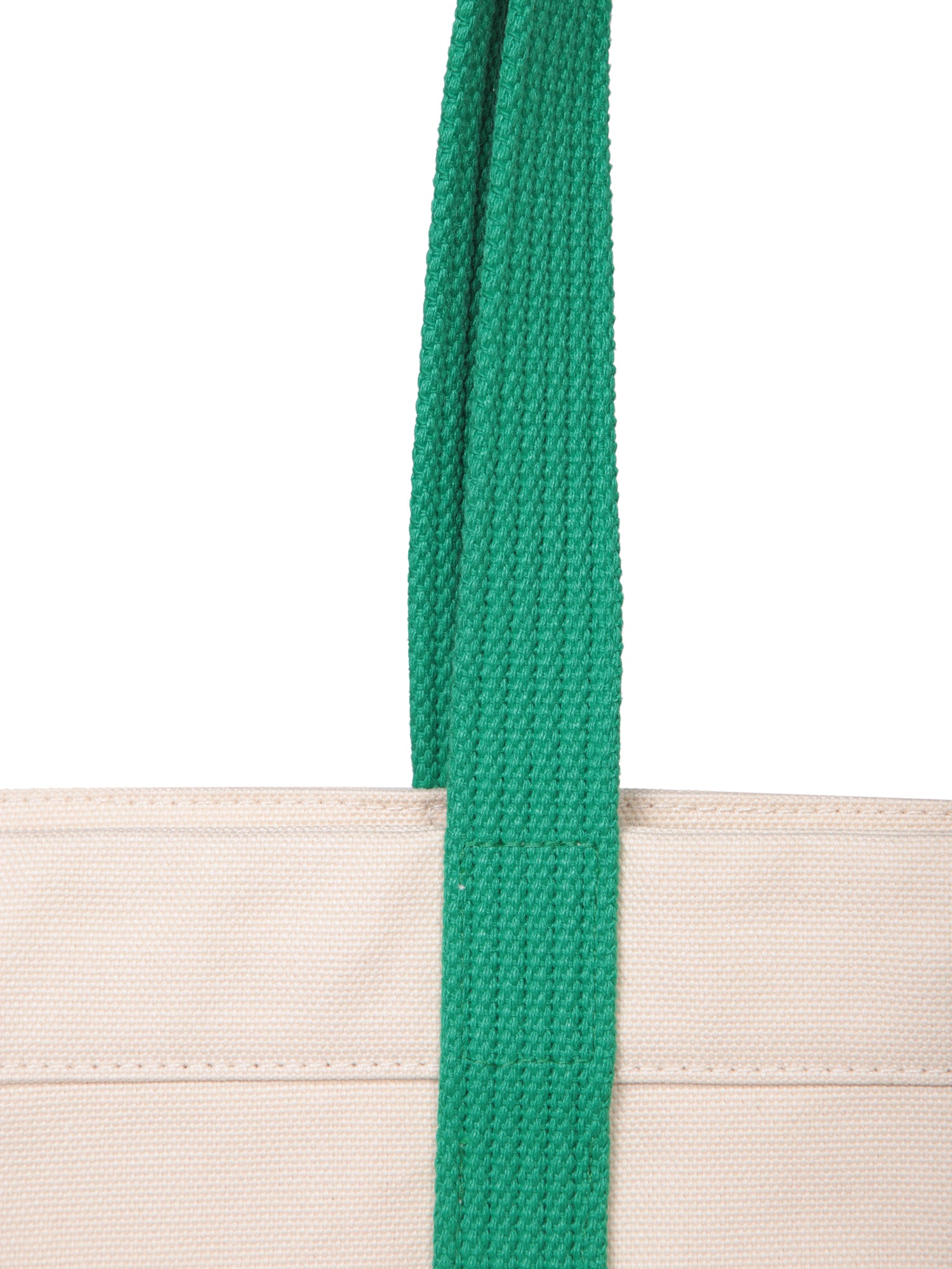 Cotton canvas bag with green details. Long handles and front embroidered logo.