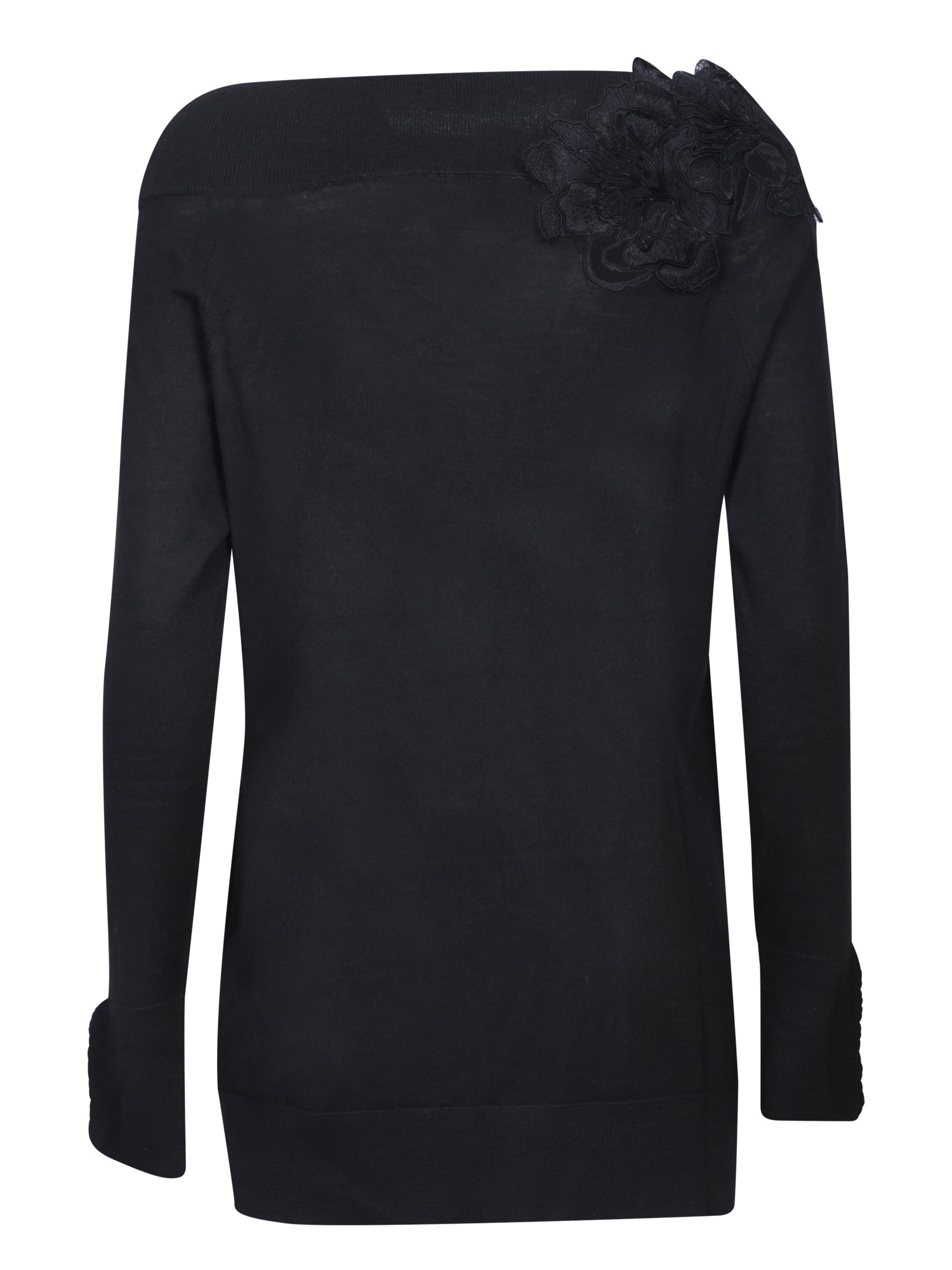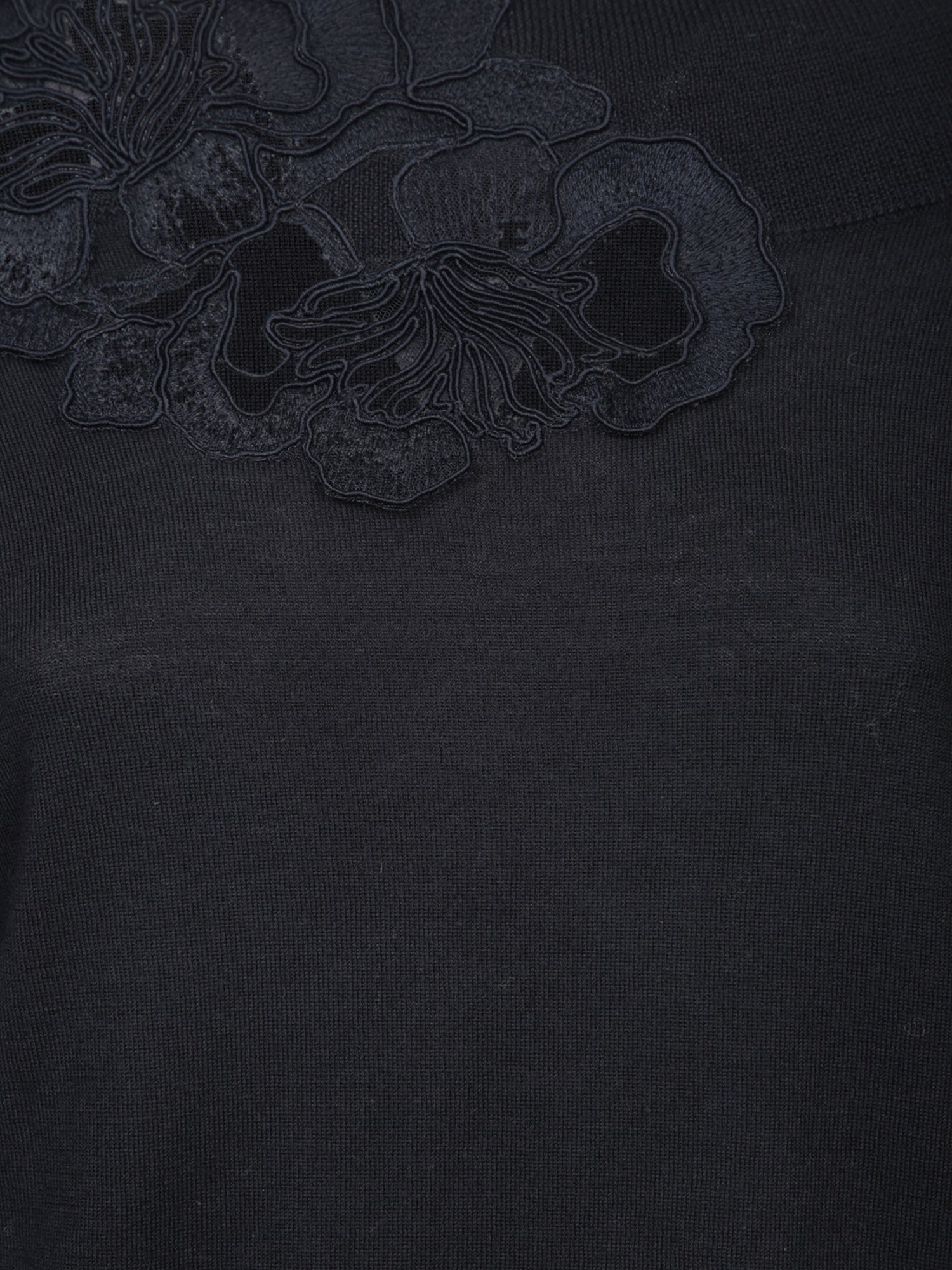 Long sleeves. Boat neck. Floral embroidery detail.