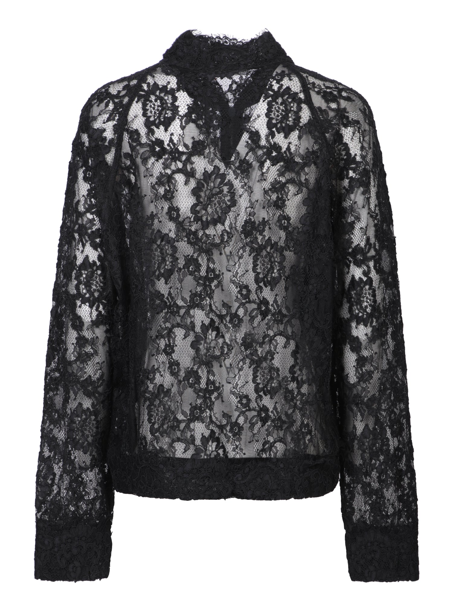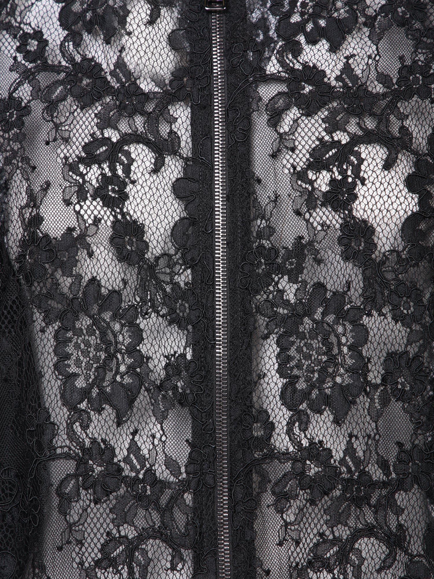 Lace bomber jacket with front zipper. Rib-knit collar, cuffs, and hem. Sheer design.