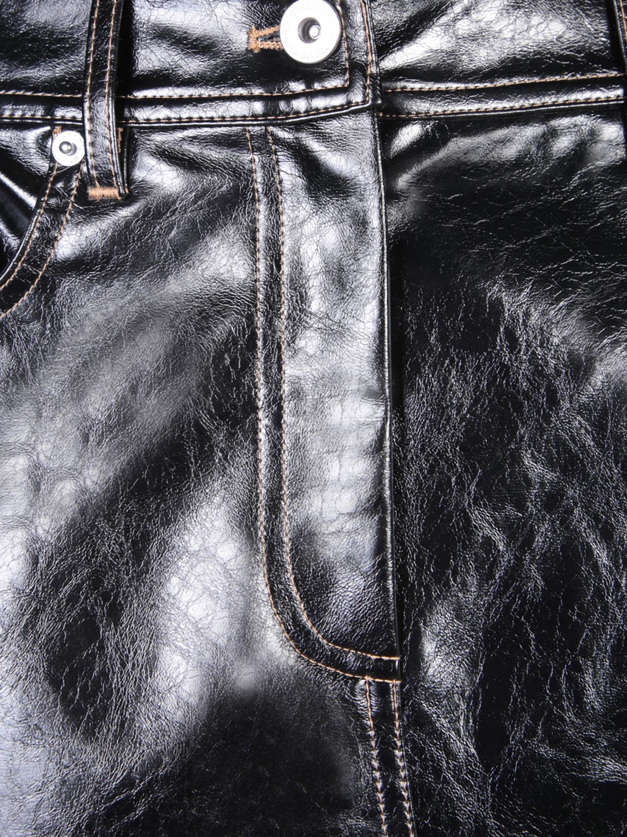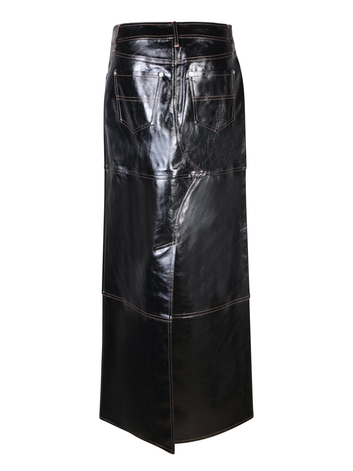Long faux leather skirt. Straight cut with front slit. Zip and button closure.