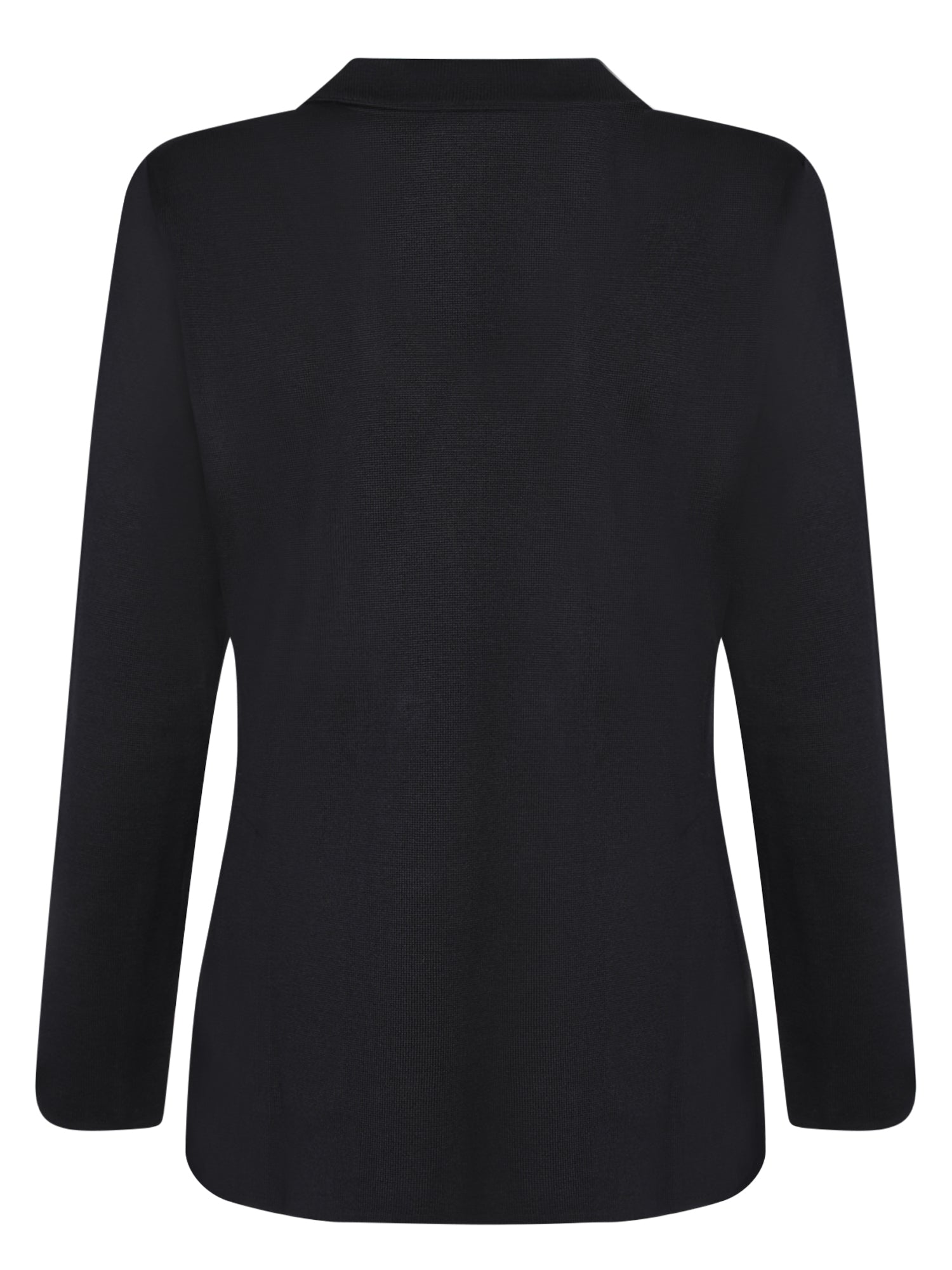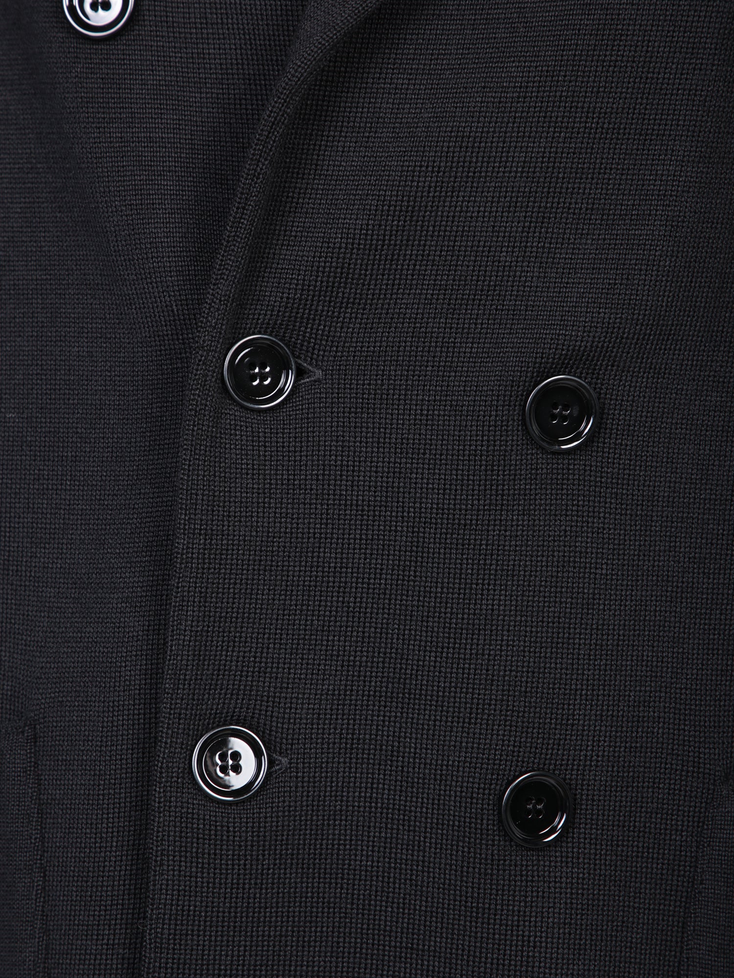 Double-breasted cardigan jacket. Wool fabric. Front patch pockets.