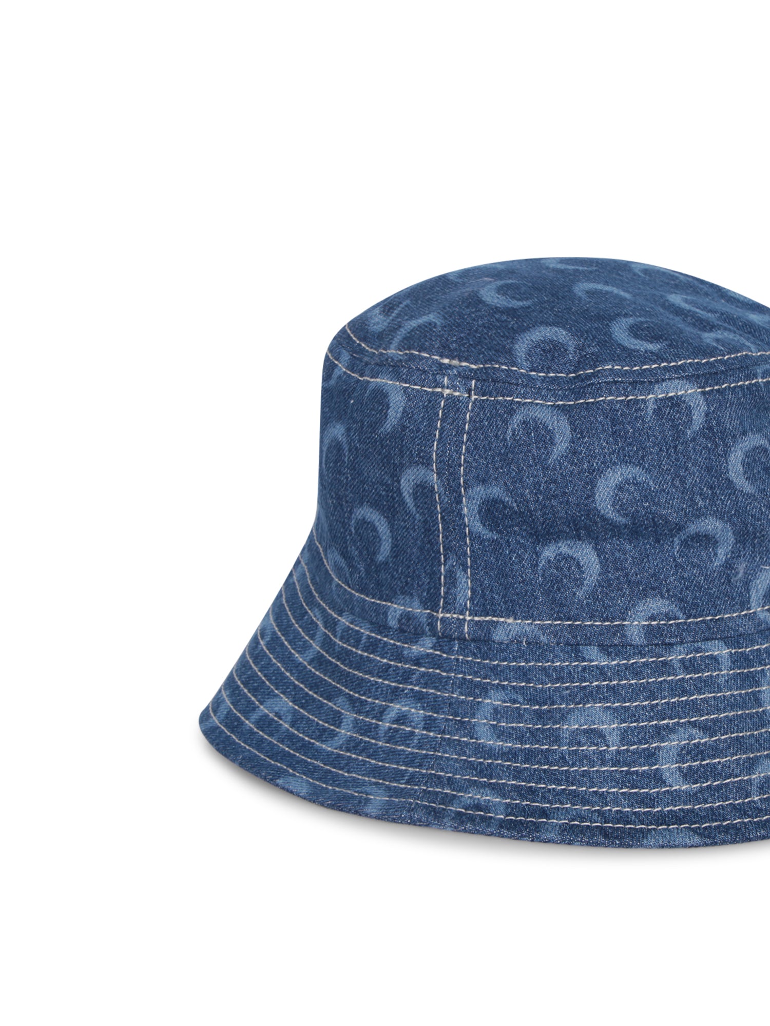 Denim bucket hat with crescent logo print. Contrast stitch detailing.
