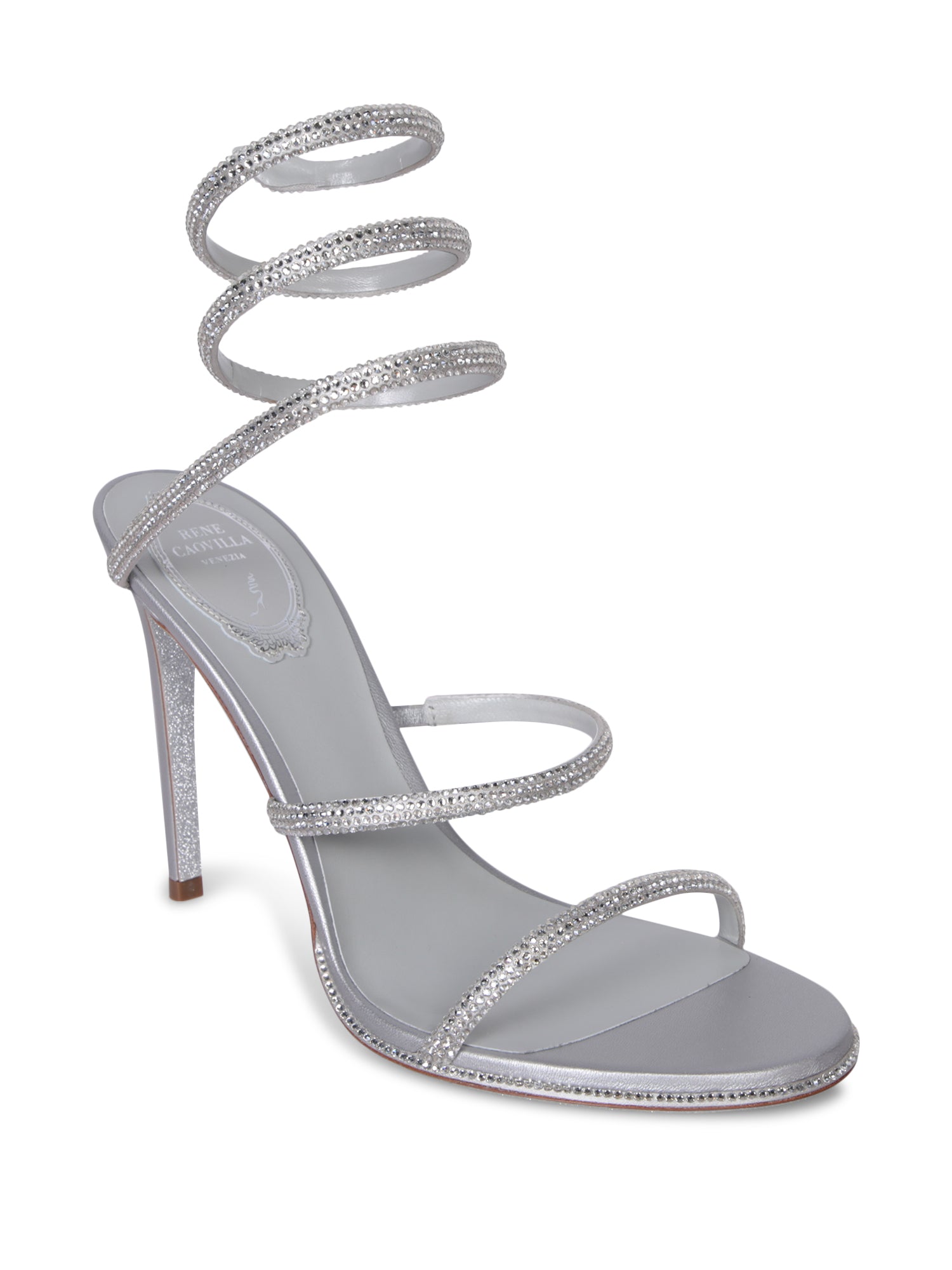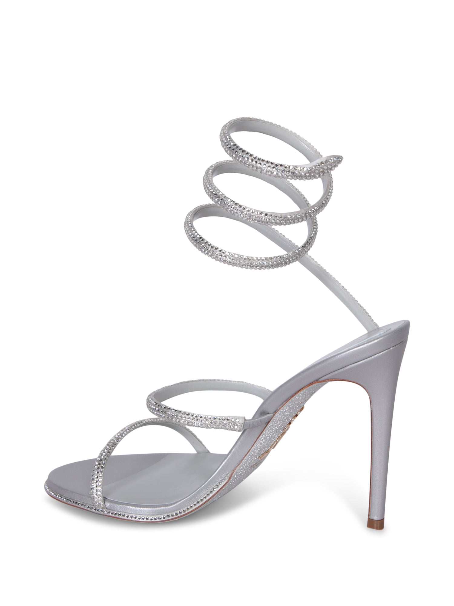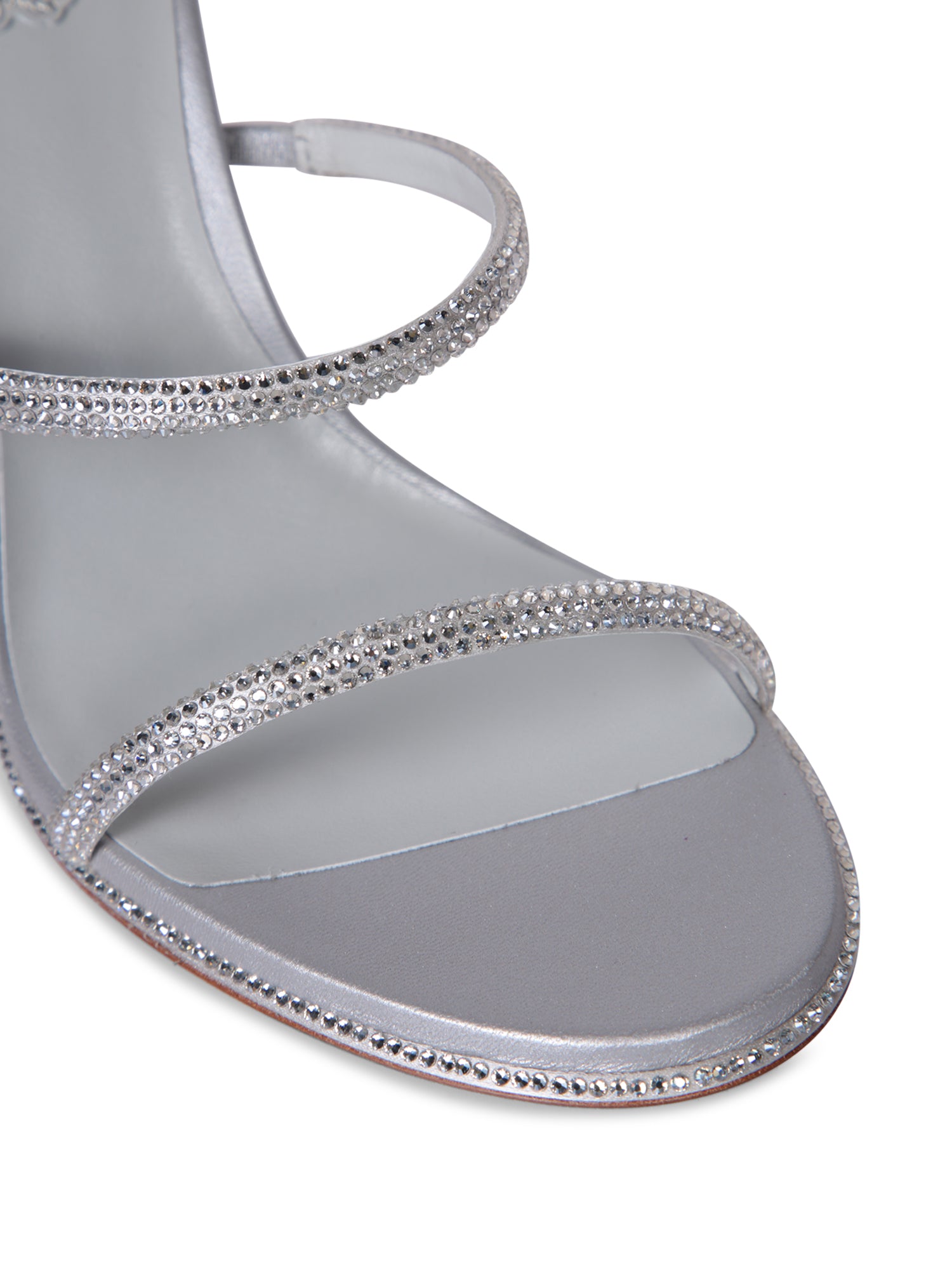 High-heeled sandals featuring rhinestone detailing and thin straps.