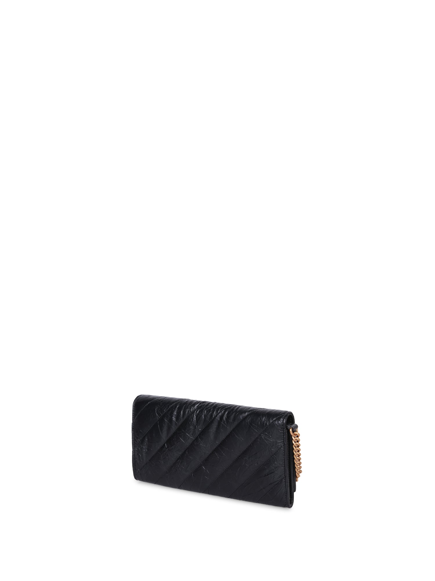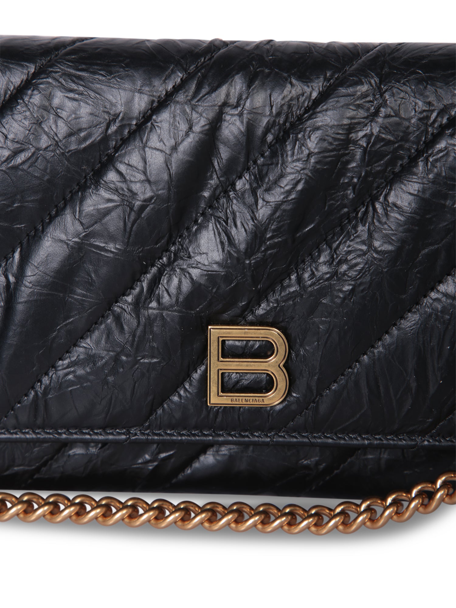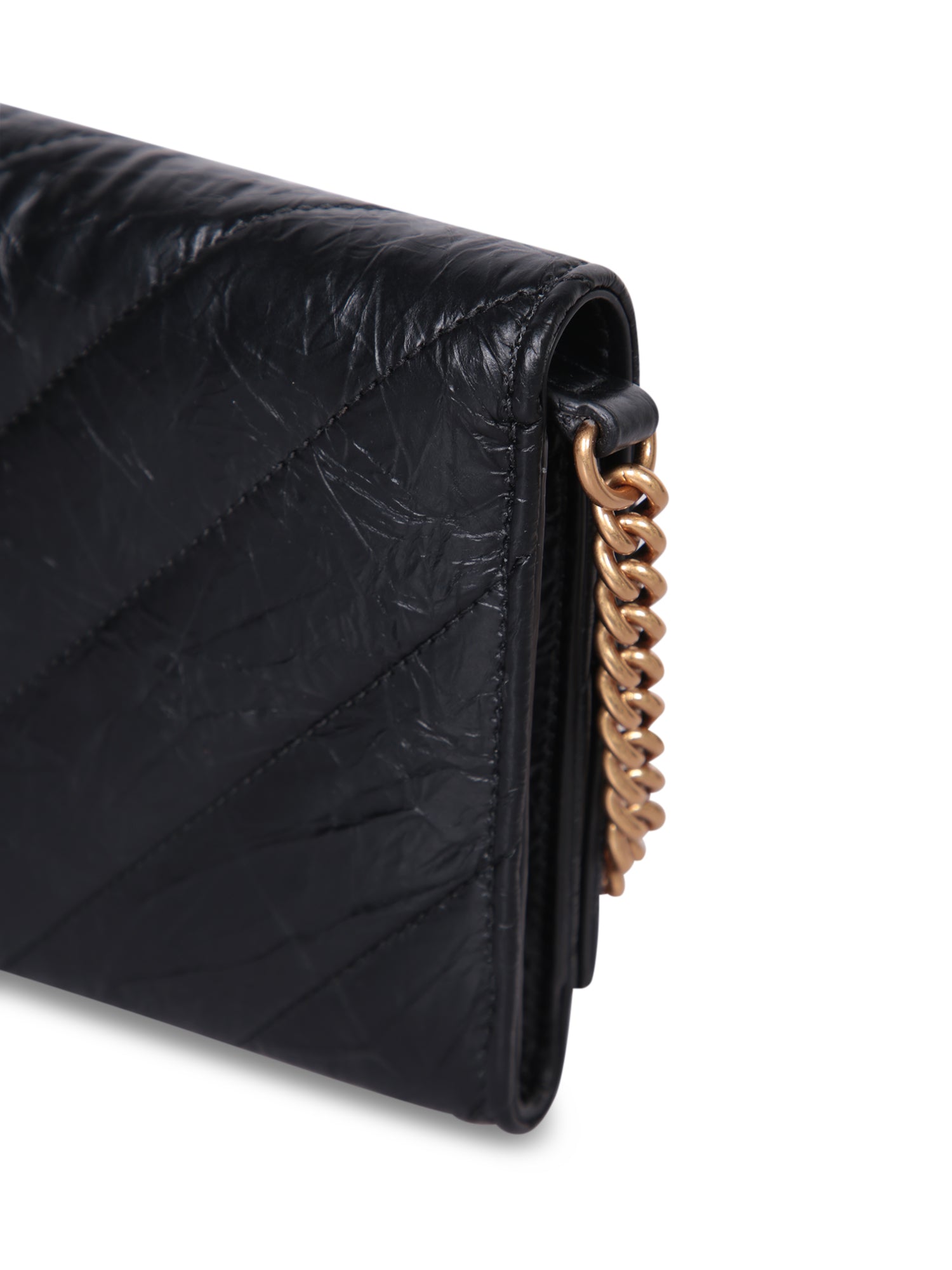 Quilted wallet on a chain with embossed Balenciaga logo on the front. Golden chain as shoulder strap.