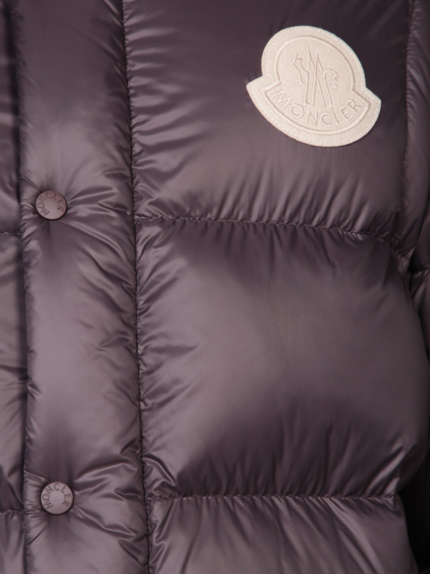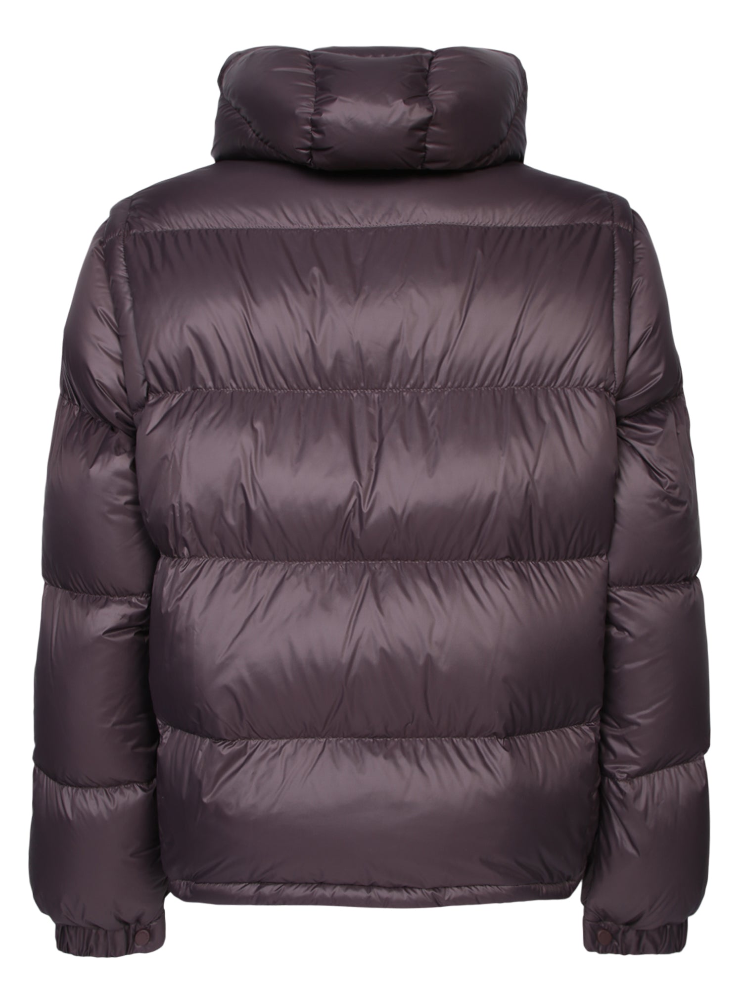 Padded down jacket. Front button closure. High collar with contrasting inner lining.