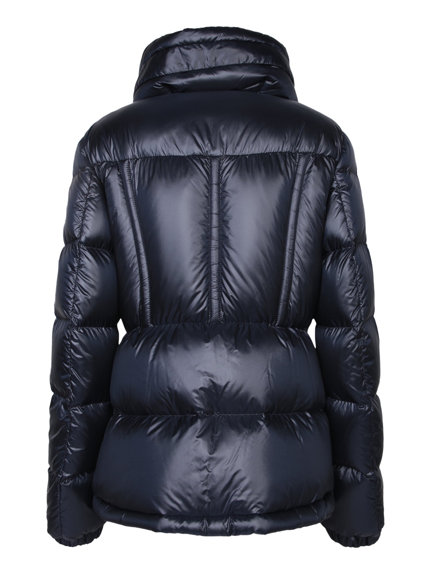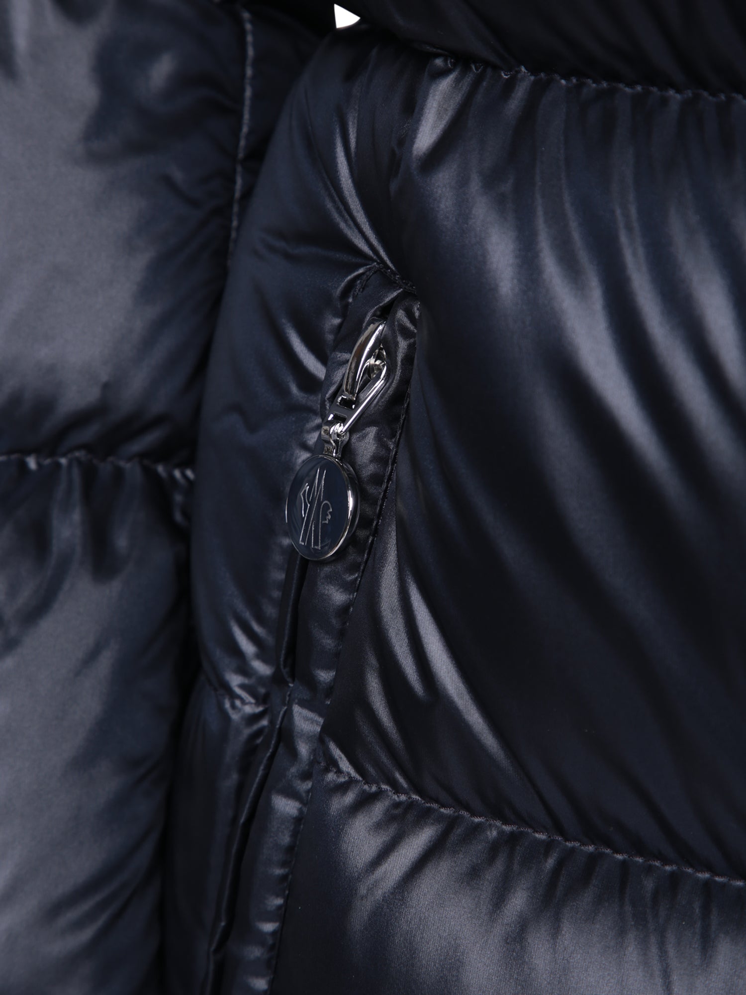 Bulky down jacket with padded hood, front zip closure, and side zip pockets.
