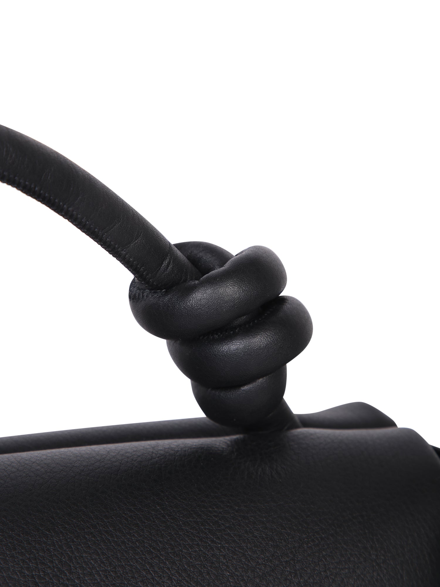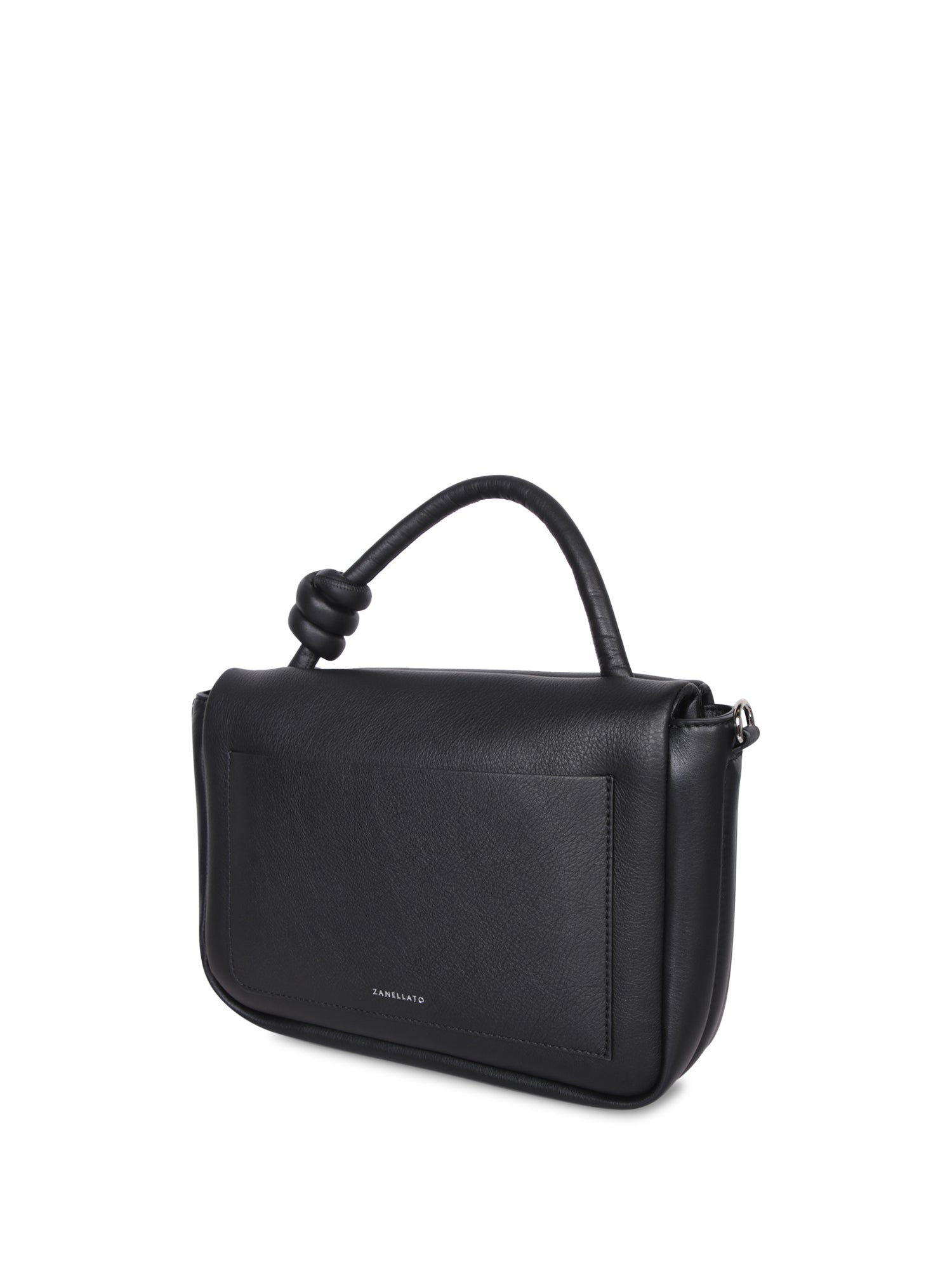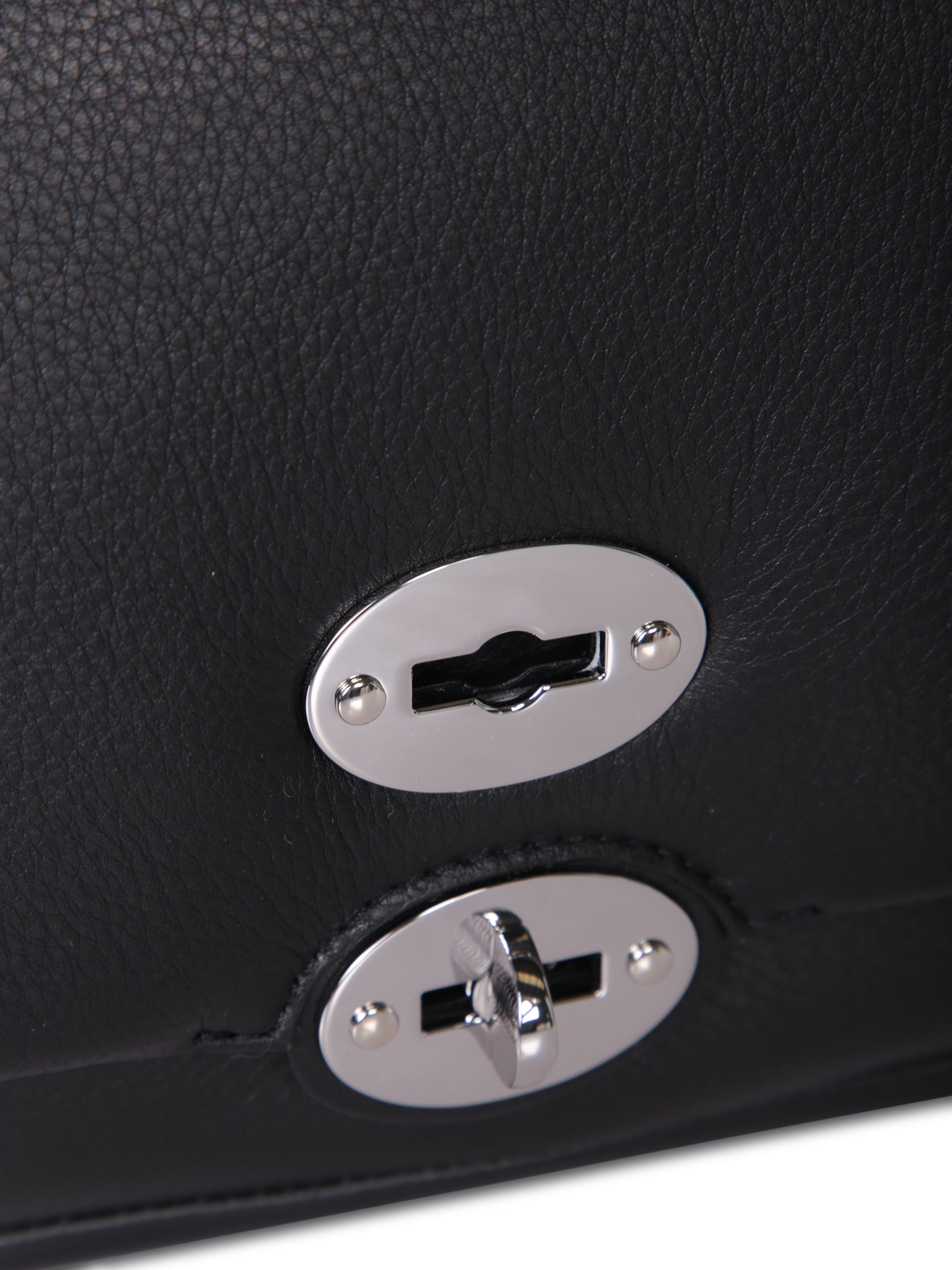 Black leather bag with turn-lock closure and adjustable strap. Spacious lined interior.