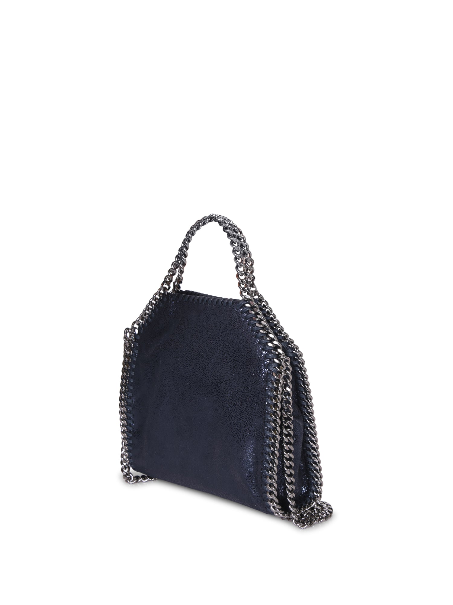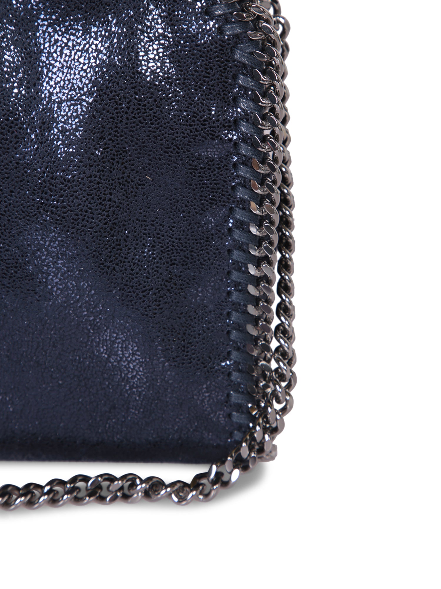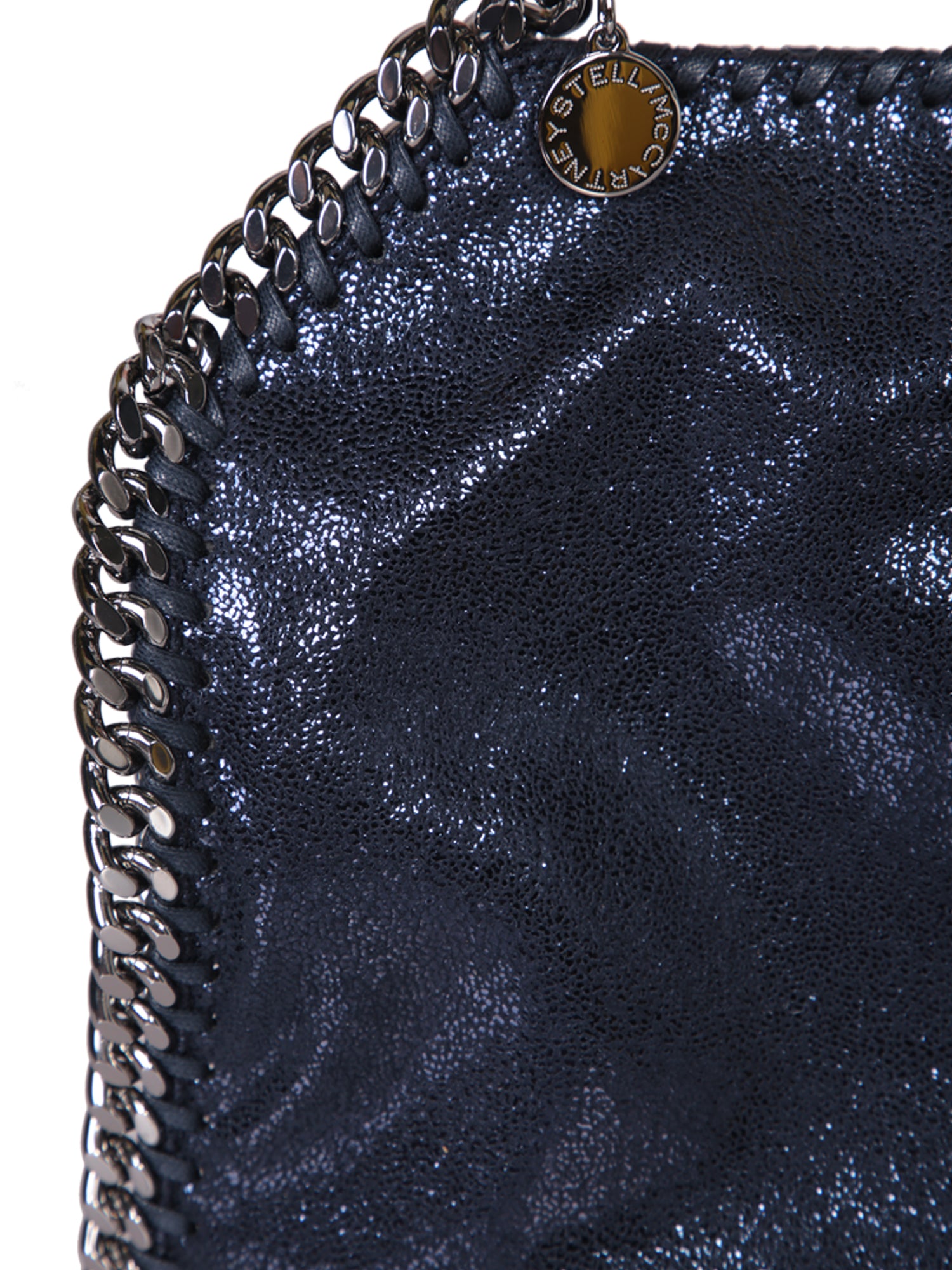 Blue metallic finish fabric structure. Silver-tone metal chain detail. Magnetic top closure.