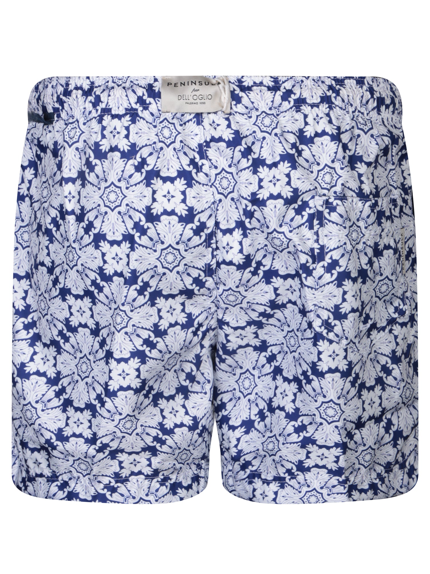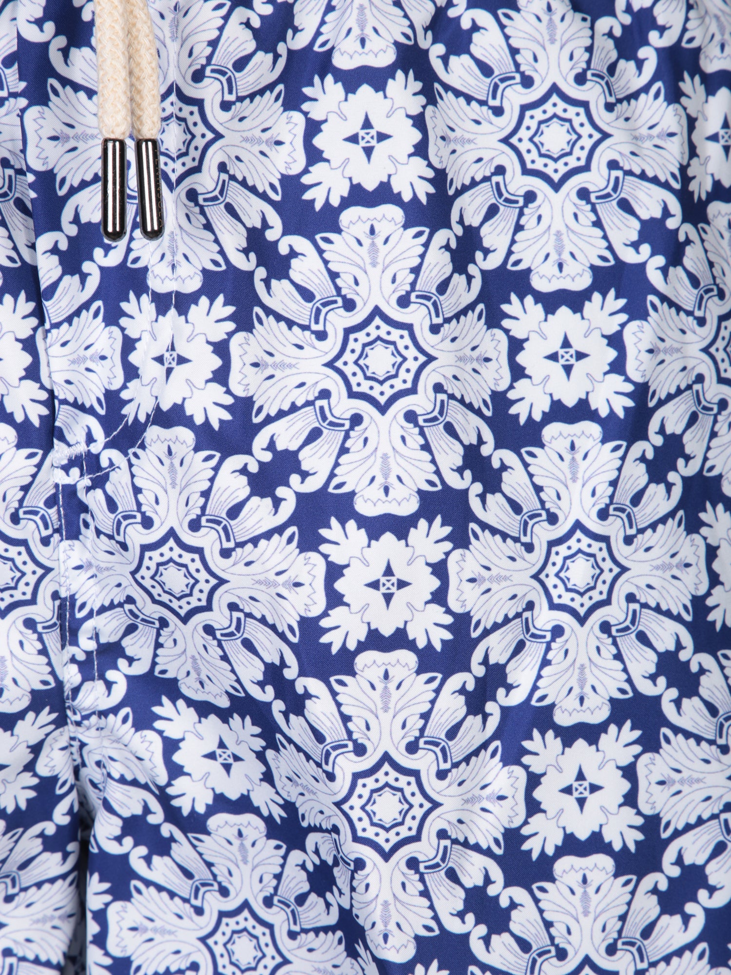 Boxer-style swimwear. White and blue floral pattern. Adjustable waist tie.