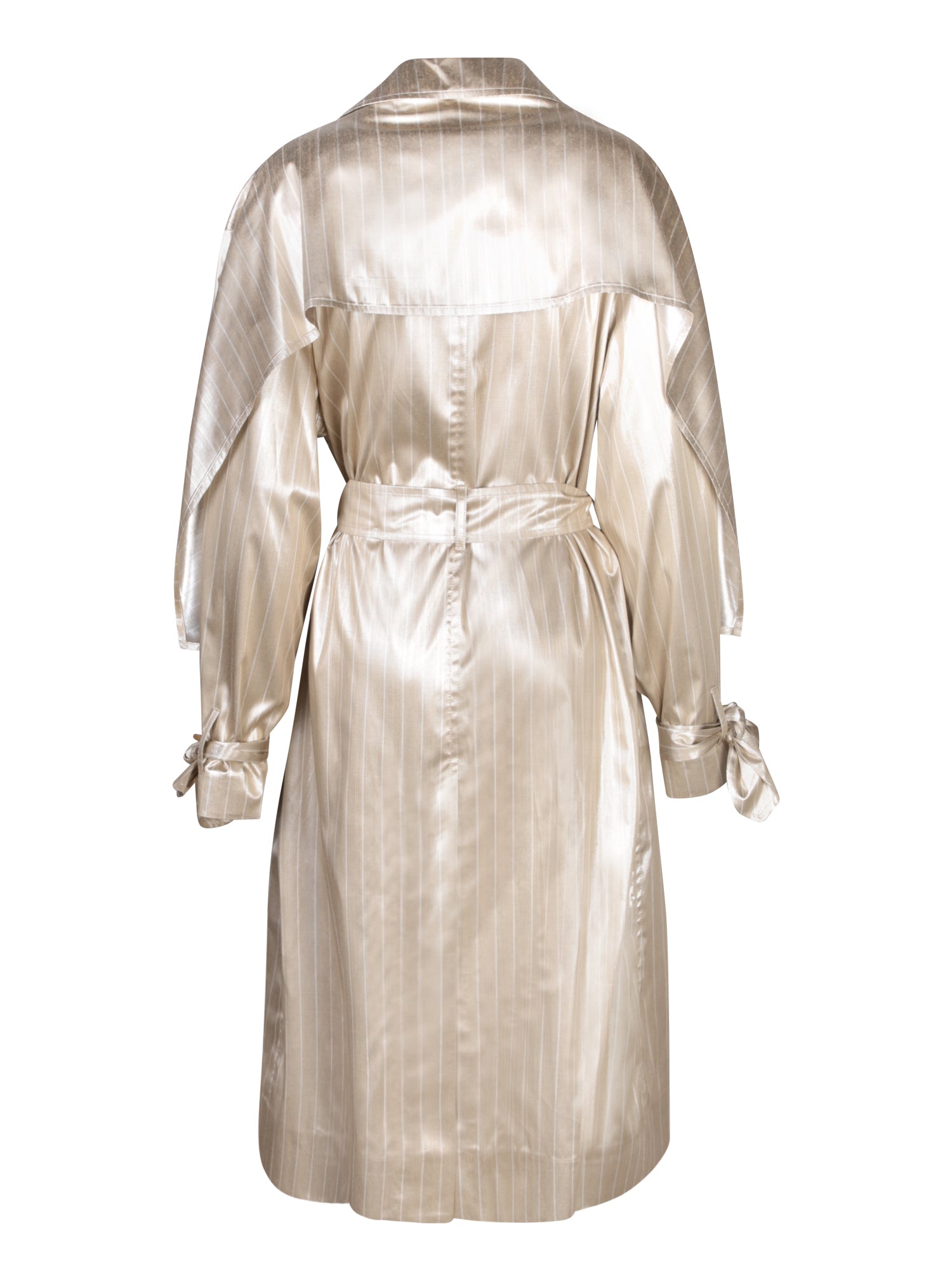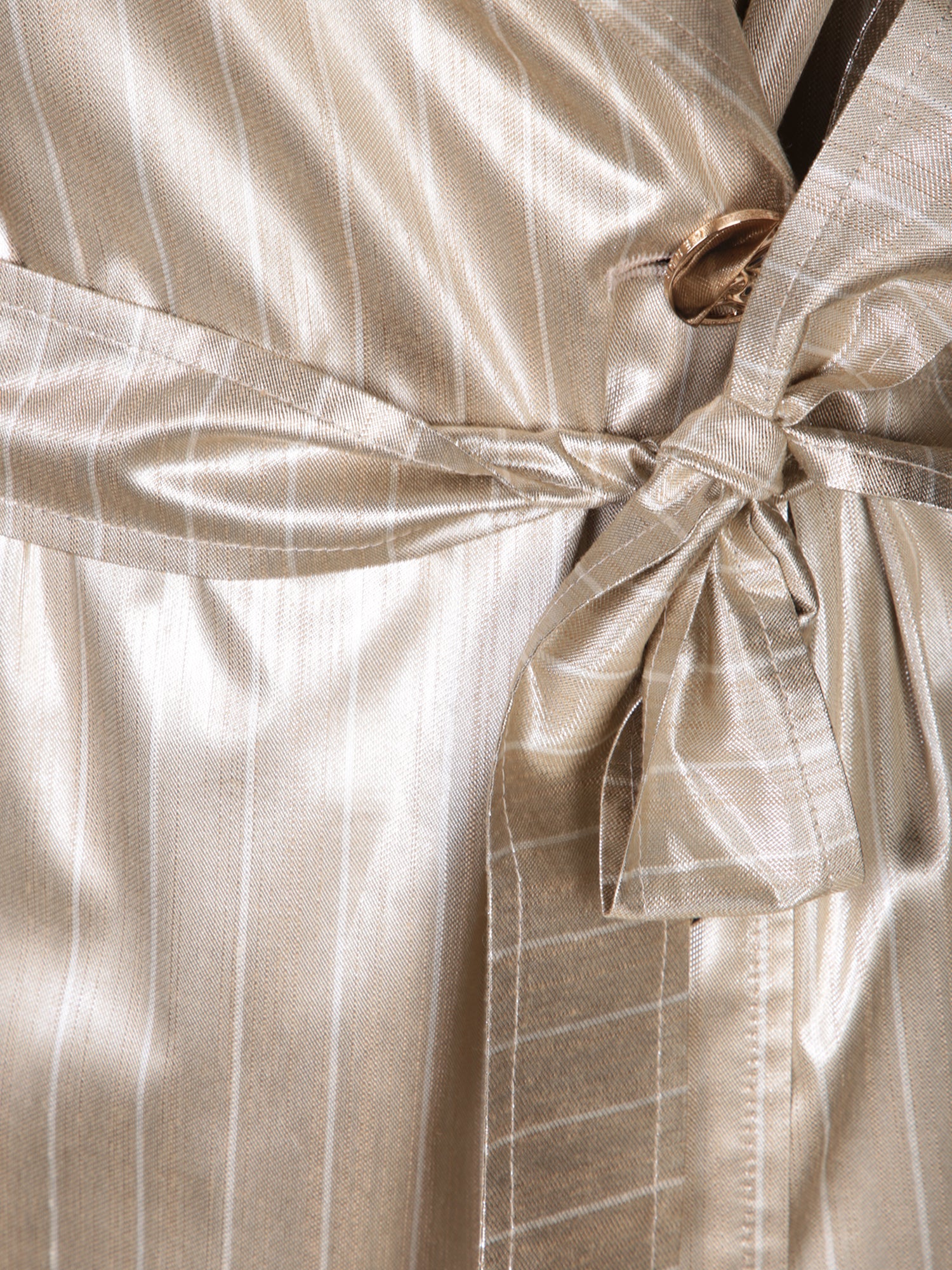 Impeccably detailed, this GENNY trench stands out with its lustrous satin fabric and vertical stripes that elongate the figure. A belt emphasizes the silhouette, while the cuffs adjust for a personalized fit.