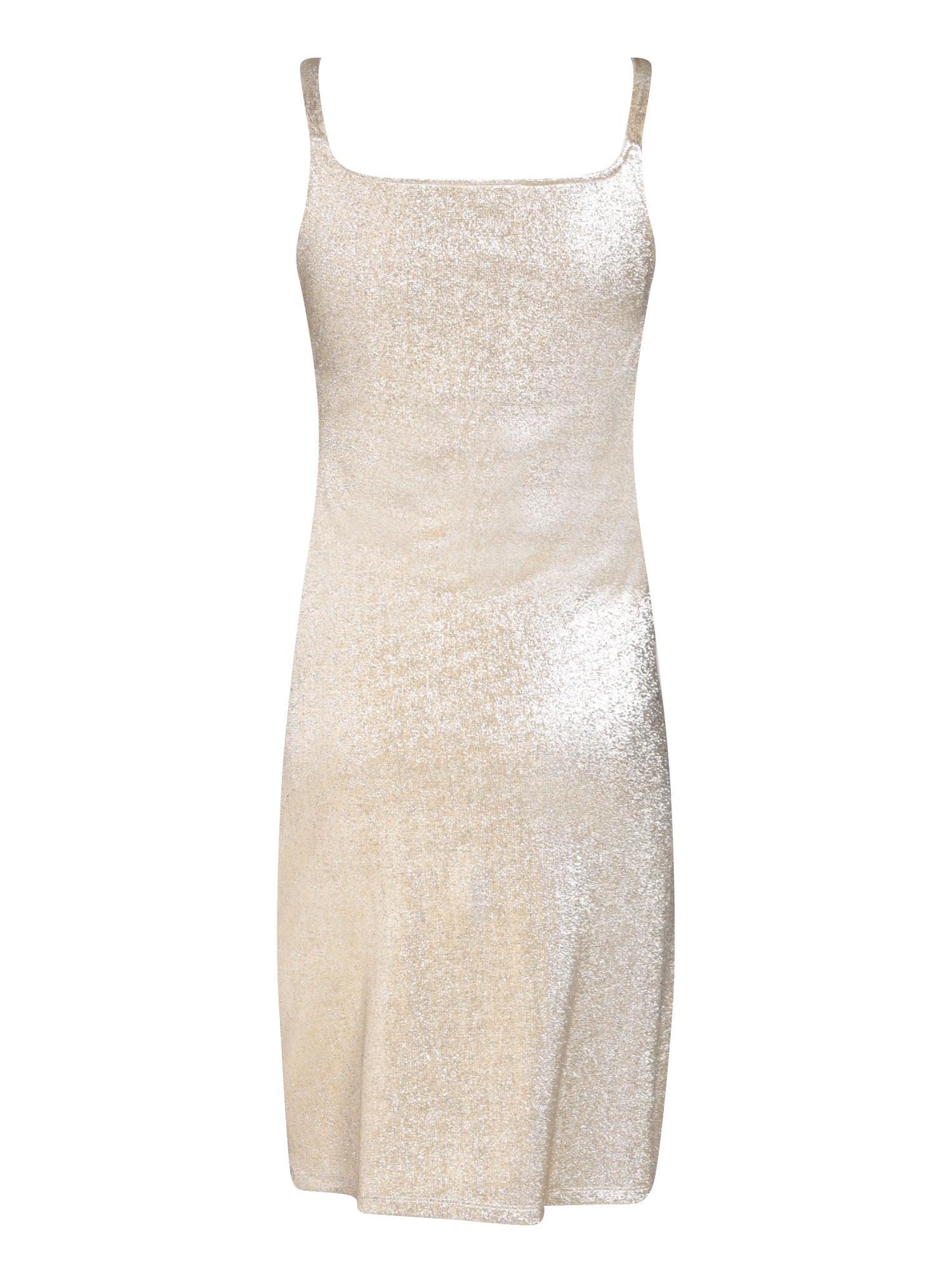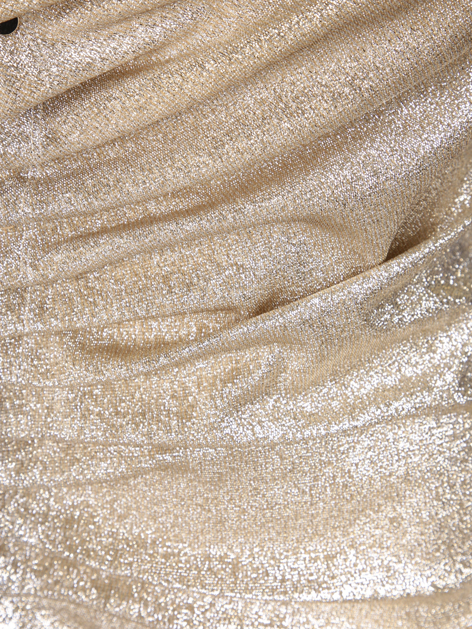 Adjustable thin strap. Side button detail. Draped effect. Shimmering Lurex fabric.