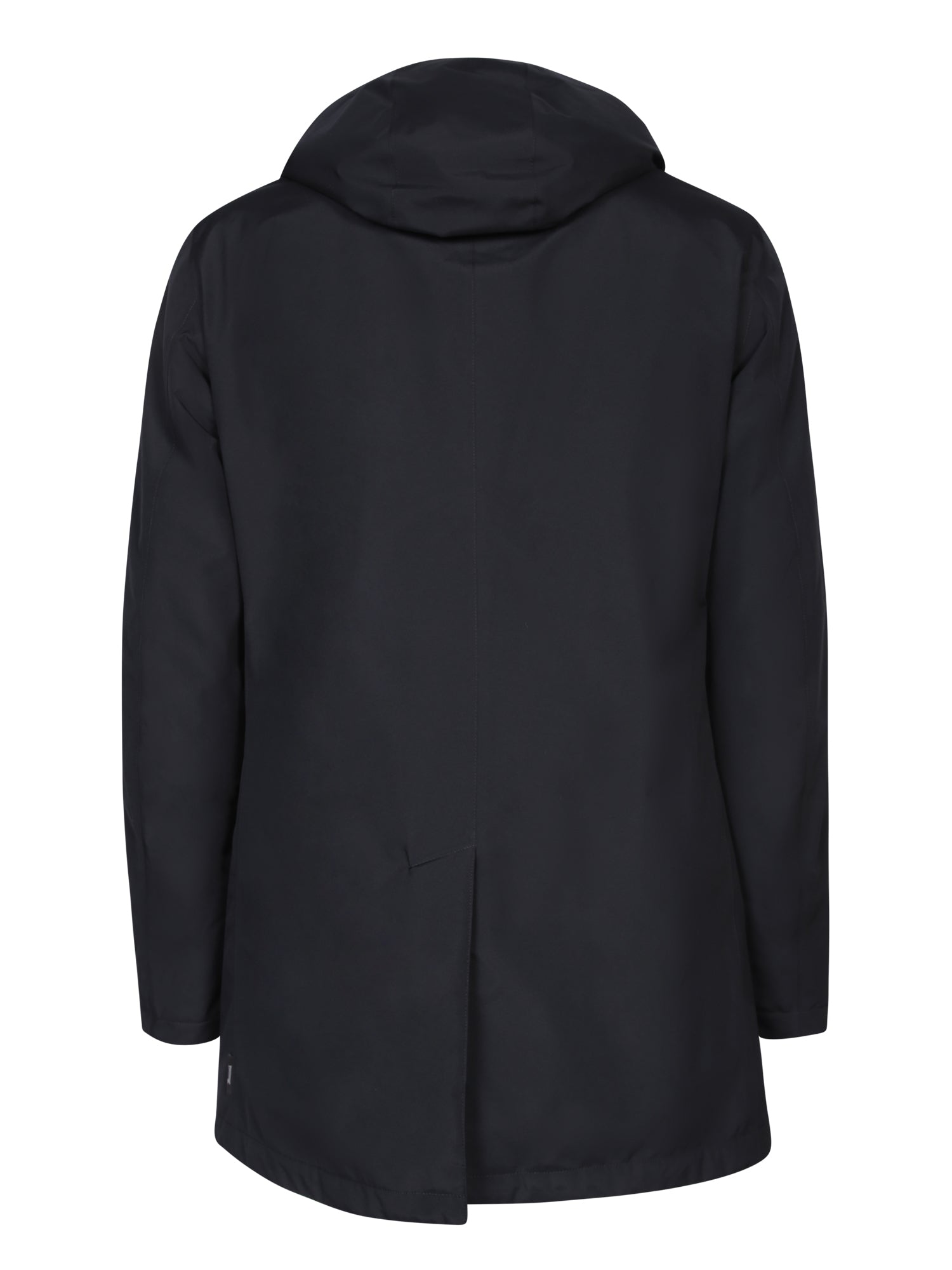 Three-quarter coat with concealed zipper and snap buttons. Adjustable collar with foldable hood. Flap side pockets.