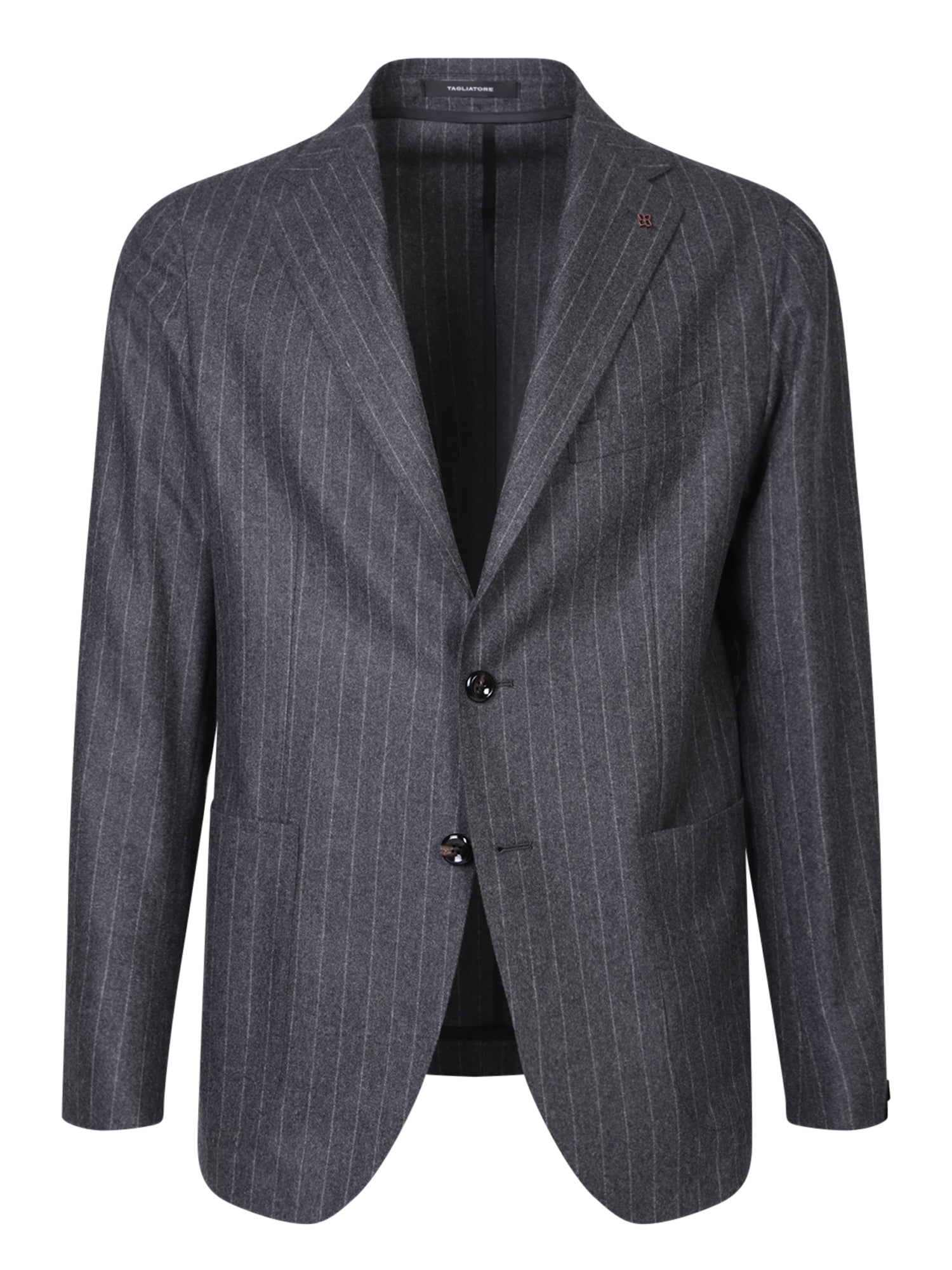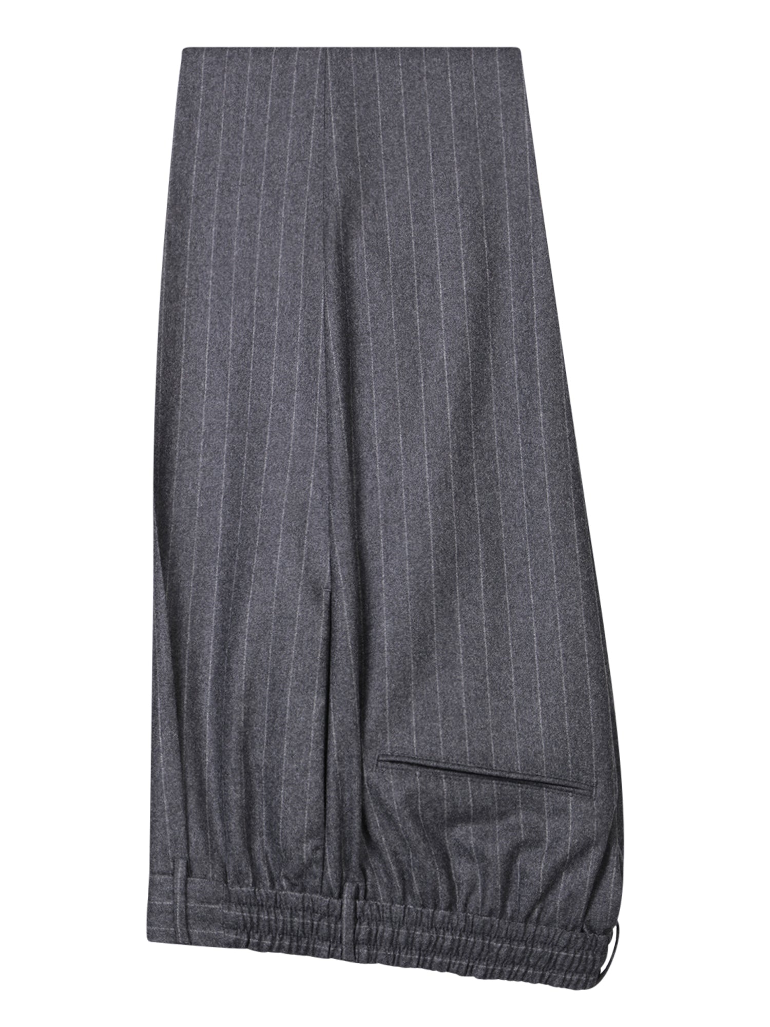 Wool suit with pinstripe pattern. Two-button model, welt pockets, and straight-leg trousers.