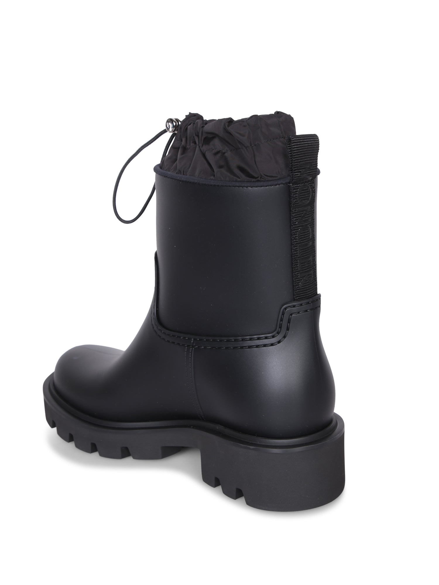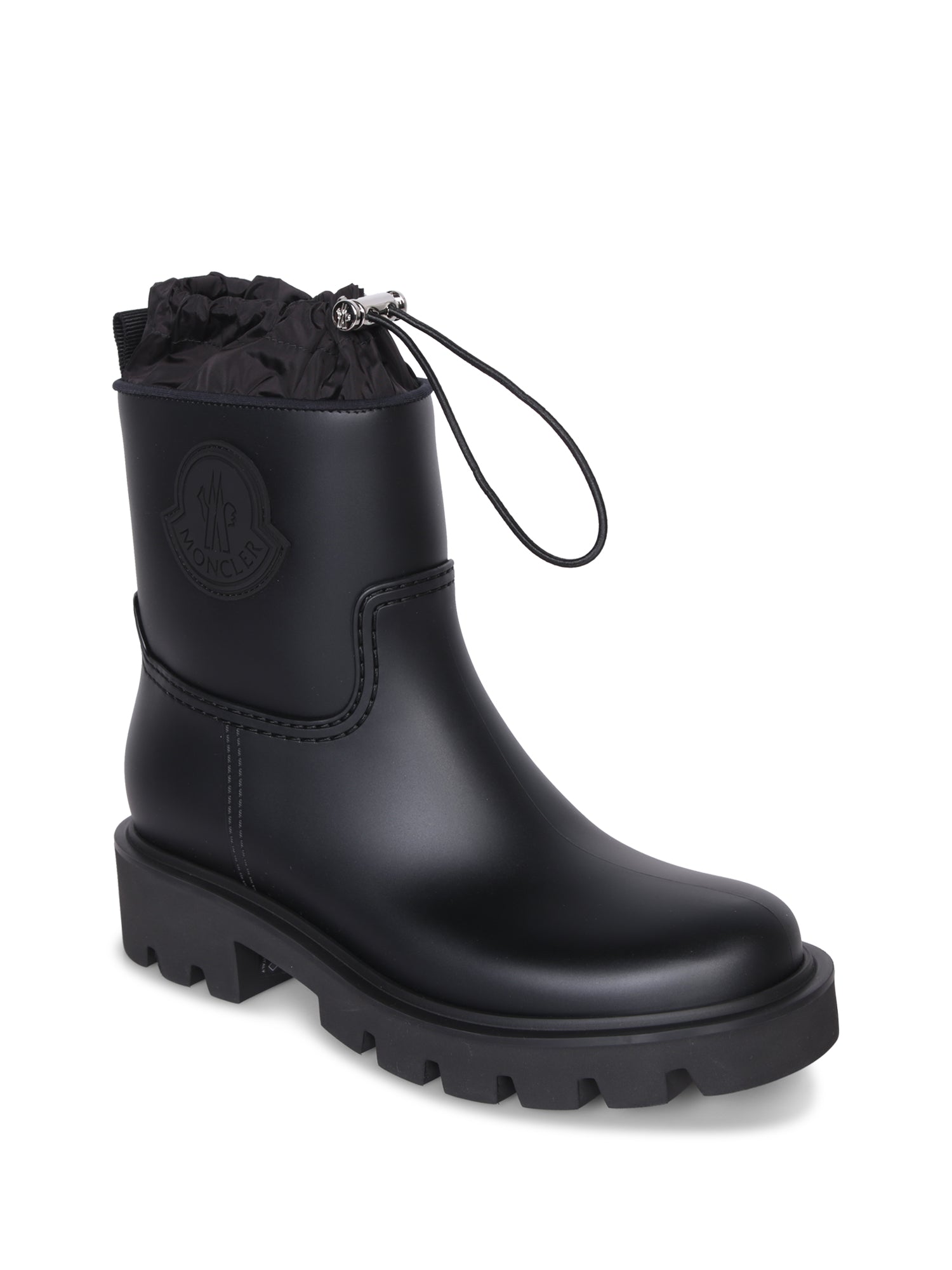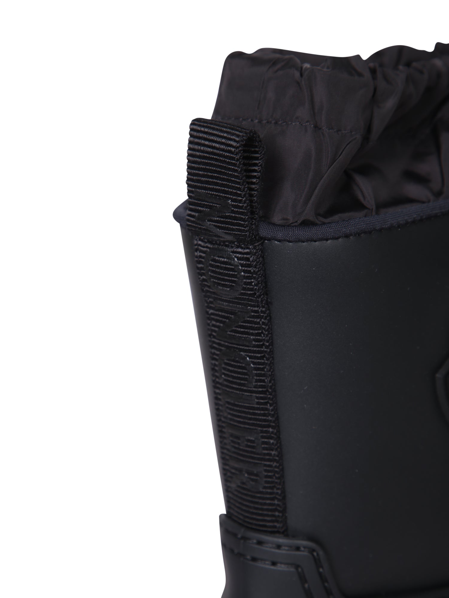 Black rubber boots featuring distinctive brand detailing. Includes a thick, traction sole and internal padding.