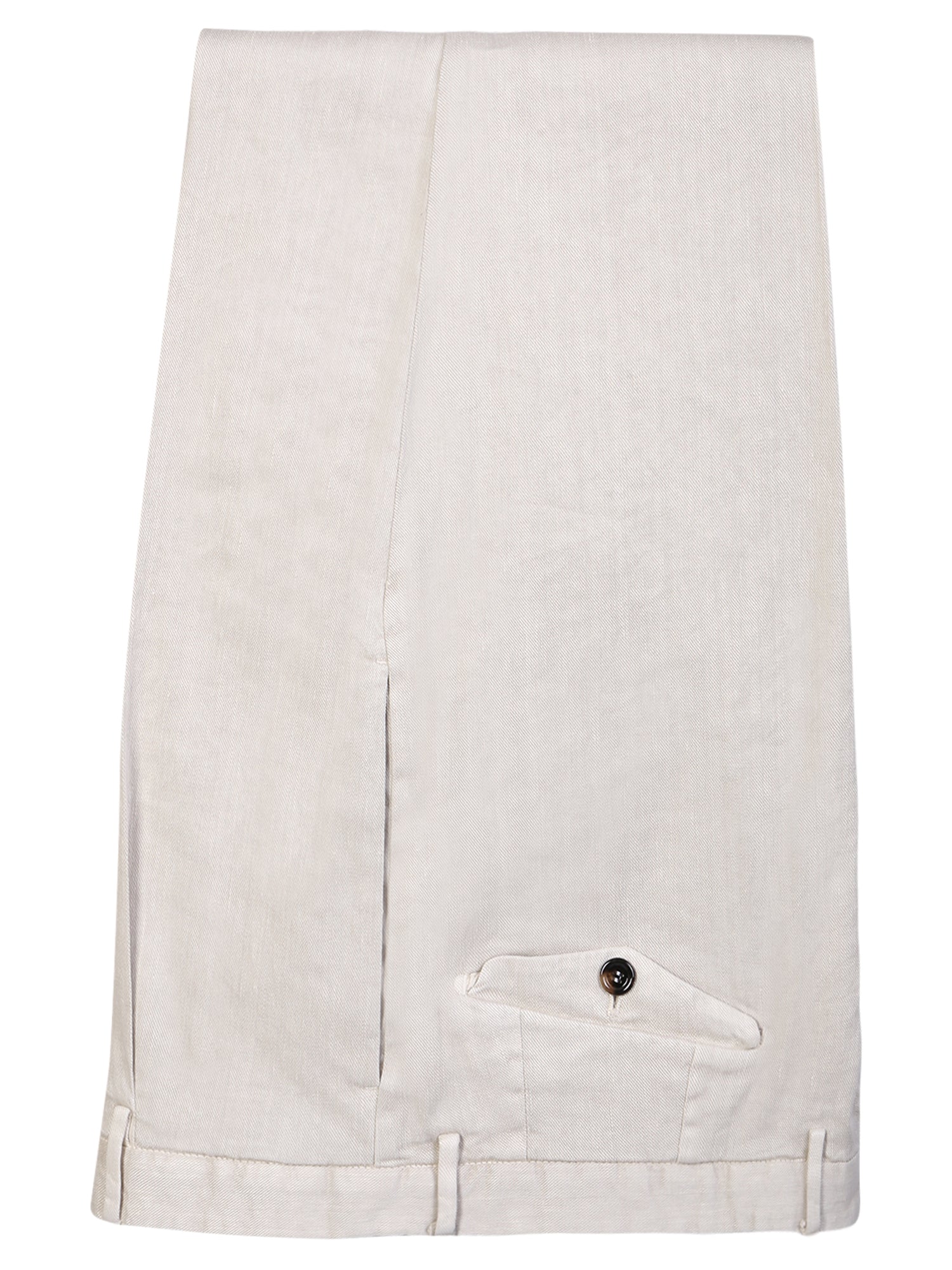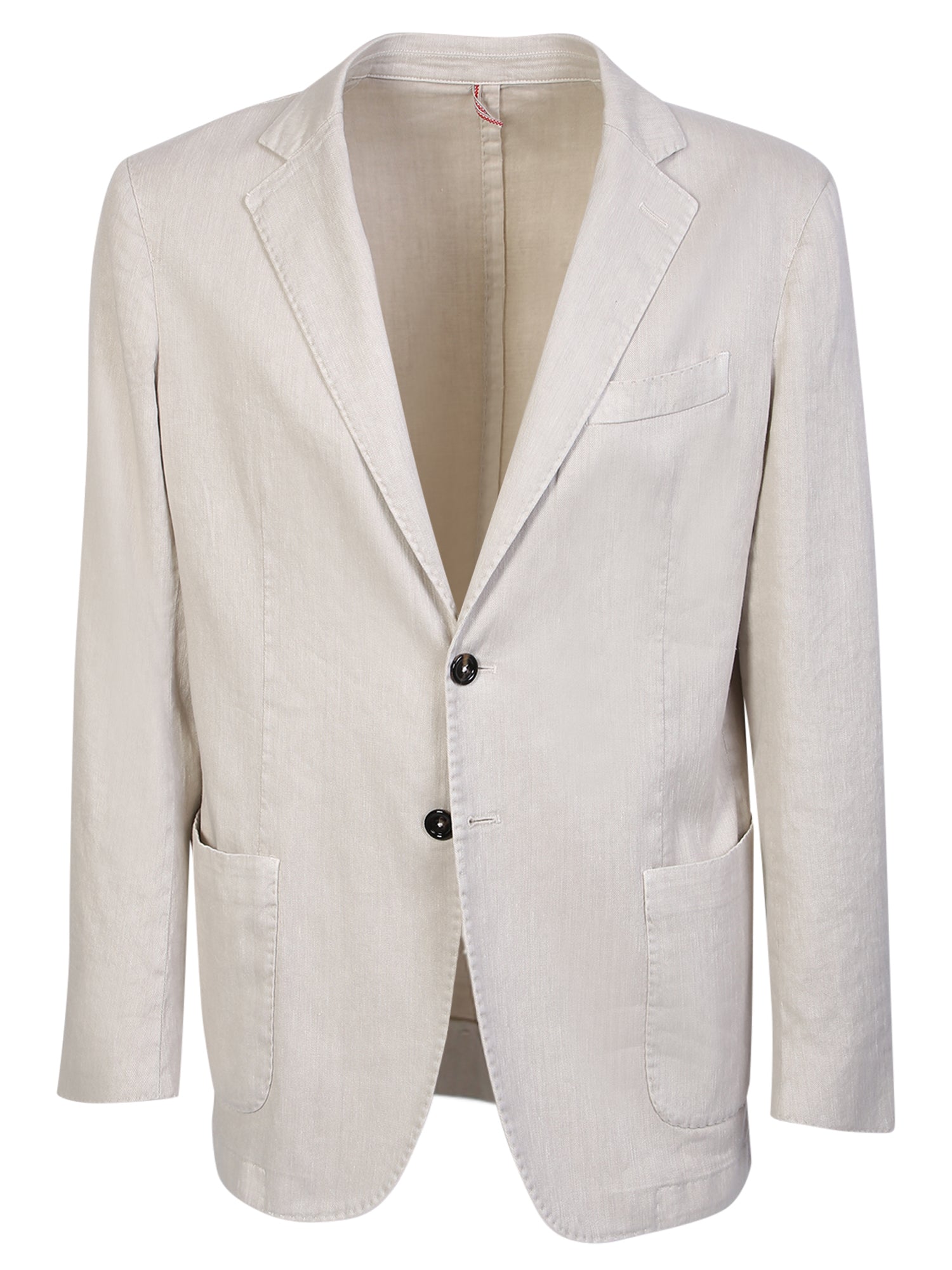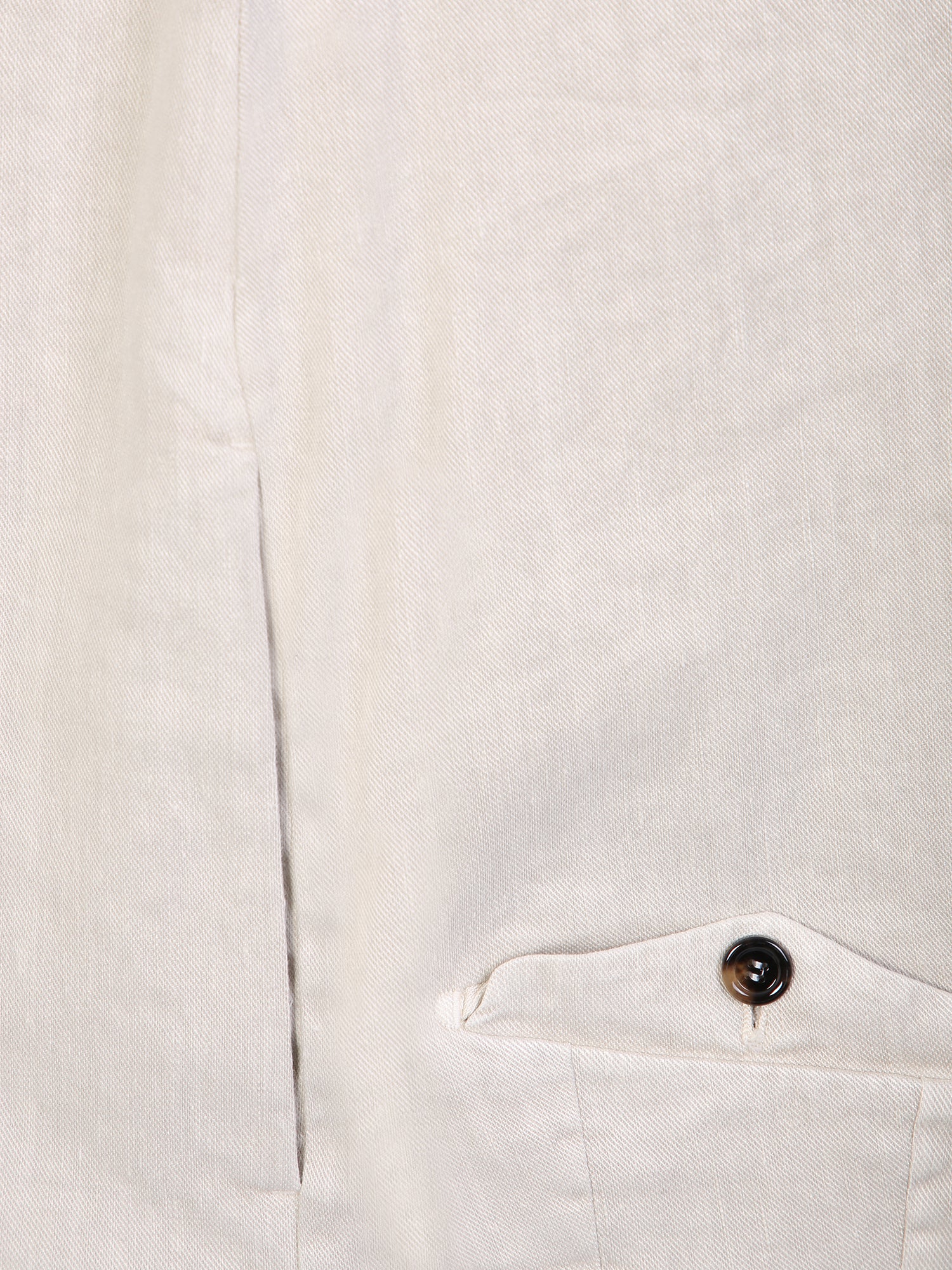 Linen ice suit by Dell'Oglio; the brand produces garments with a minimal design, boasting a refined elegance given by the neutral colours used