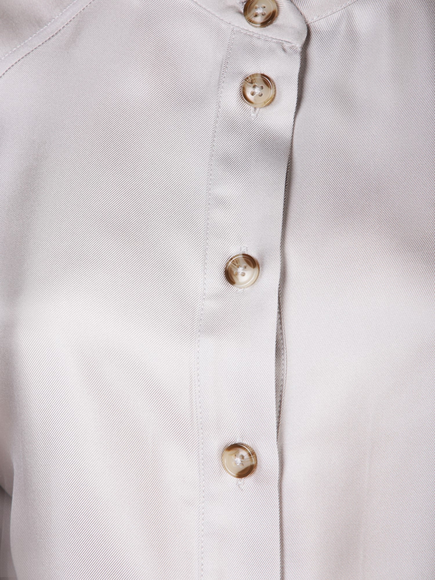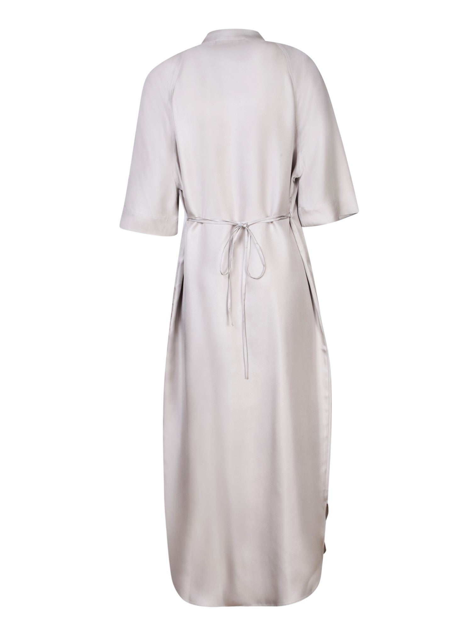 Long silk dress, three-quarter sleeves, mandarin collar, front button closure.