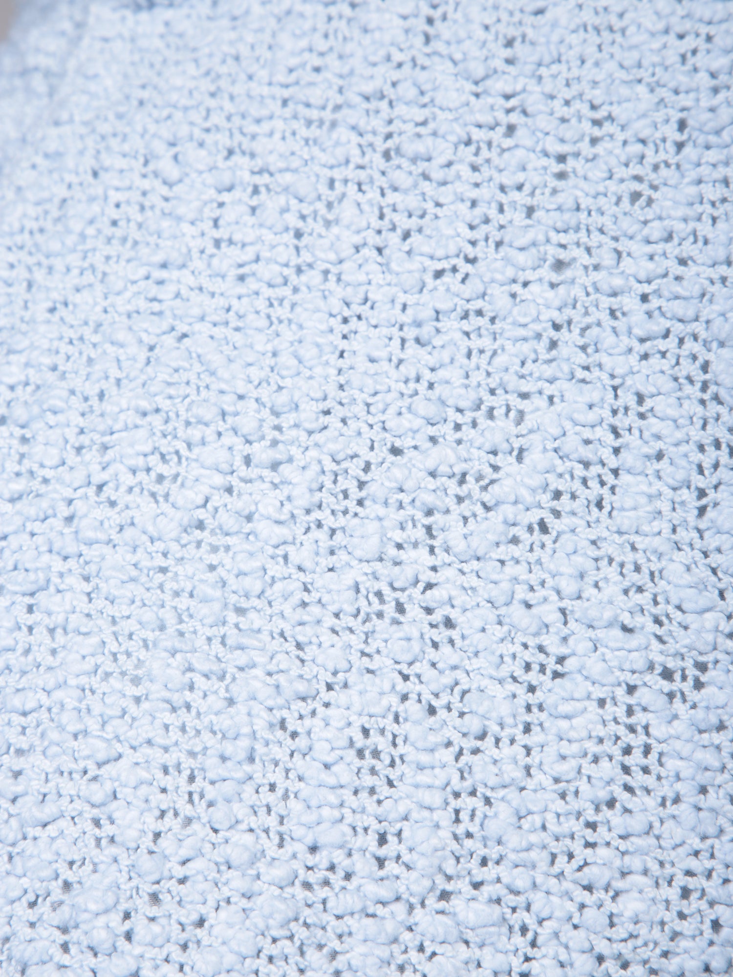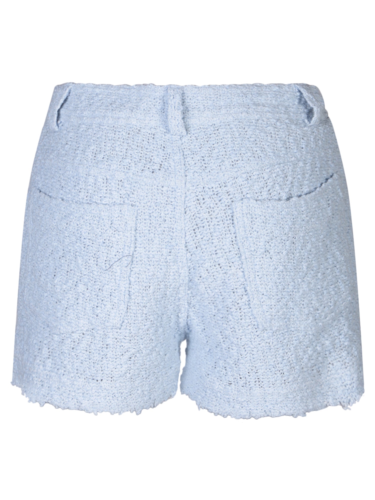 Textured tweed shorts. Exposed button closure. Fringed finishes.