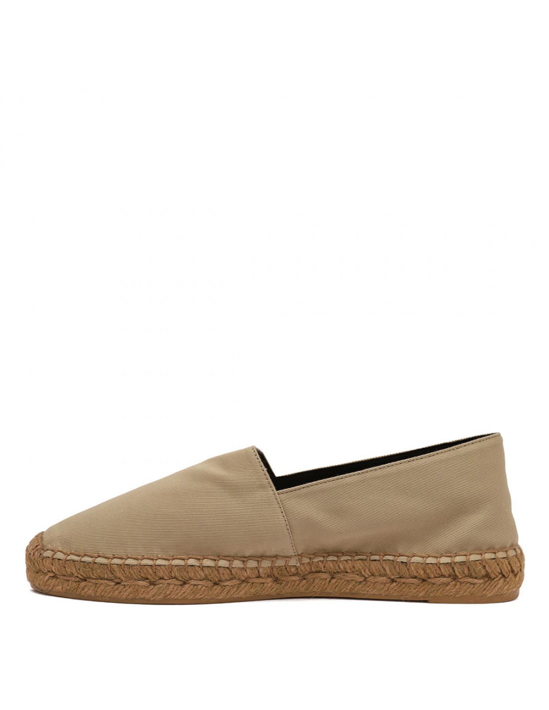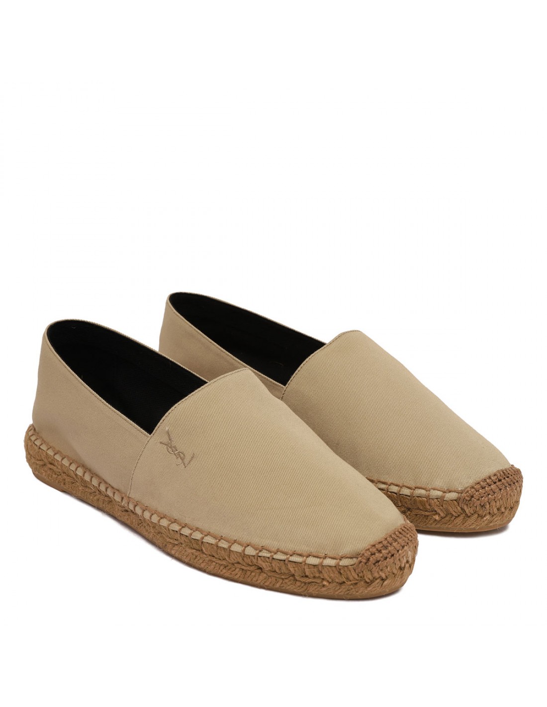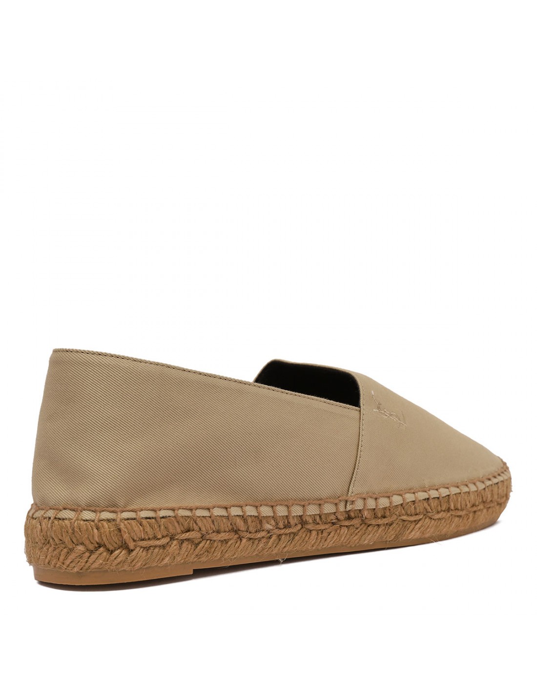 Biscuit hue cotton gabardine espadrilles from Saint Laurent featuring Cassandre embroidery on the side, contrasting stitching, rope midsole and rubber sole.