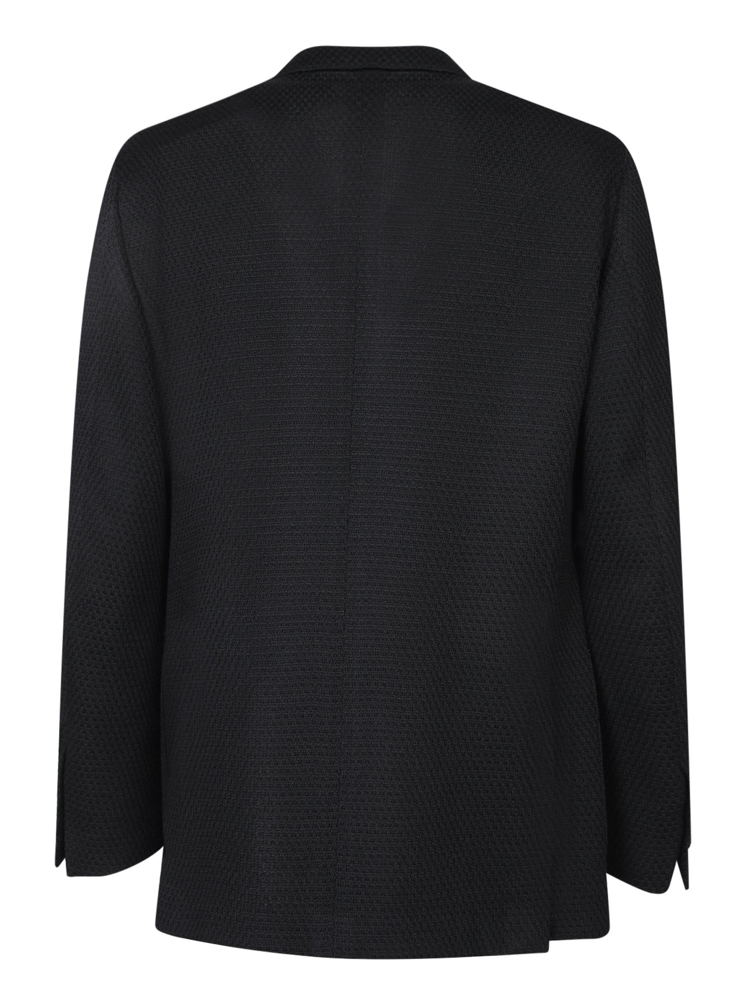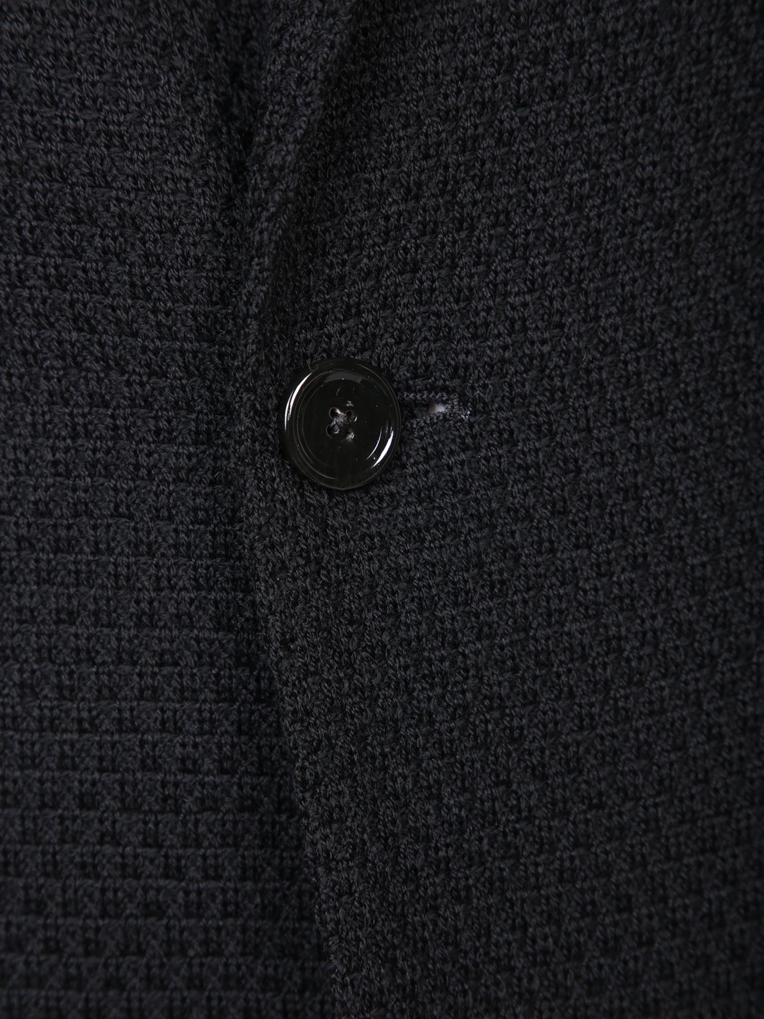 Black wool jacket. Front button closure. Two side slip pockets. Semi-lined structure.