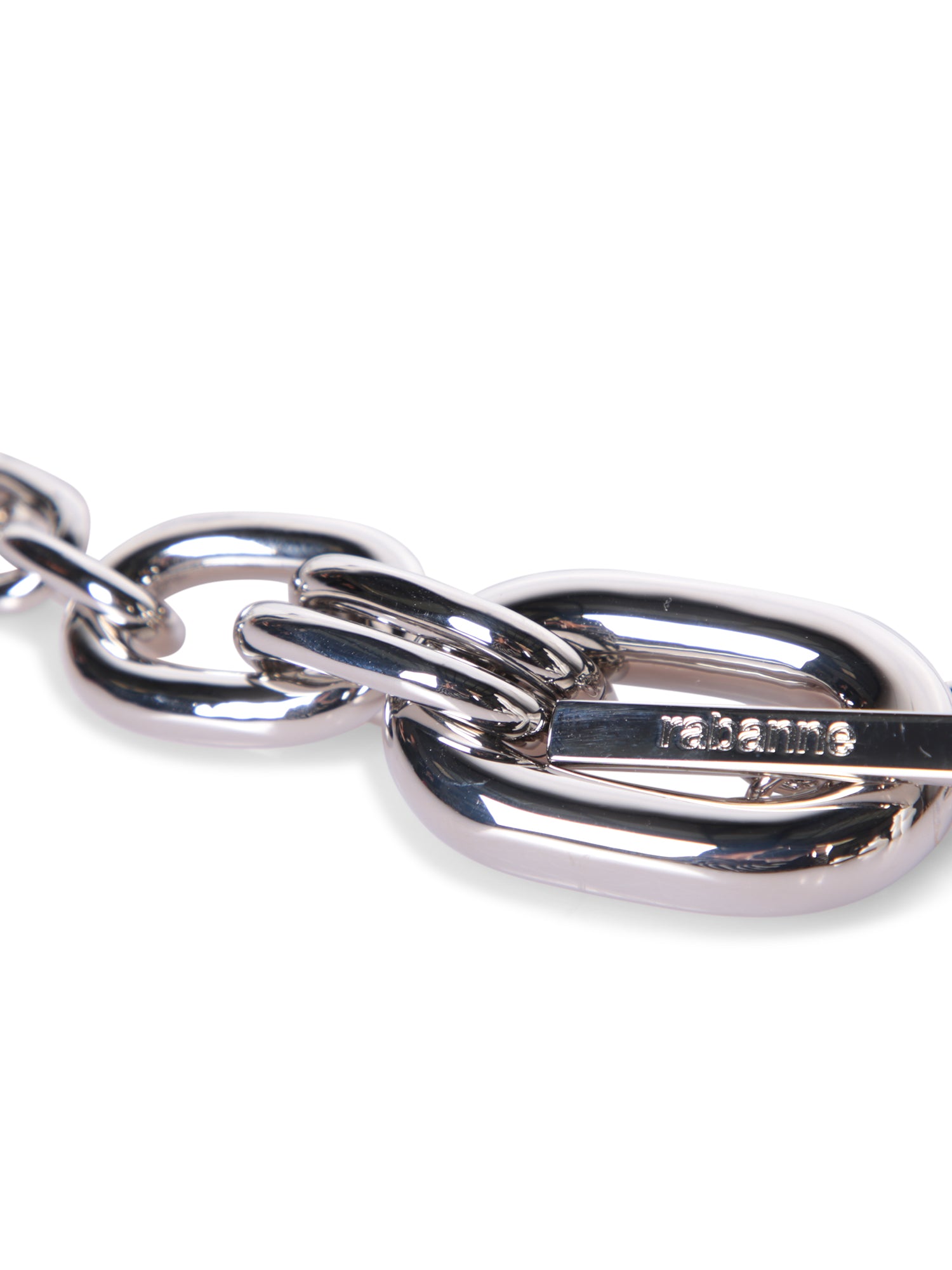 Silver chain-link necklace. Bar-and-hook closure.