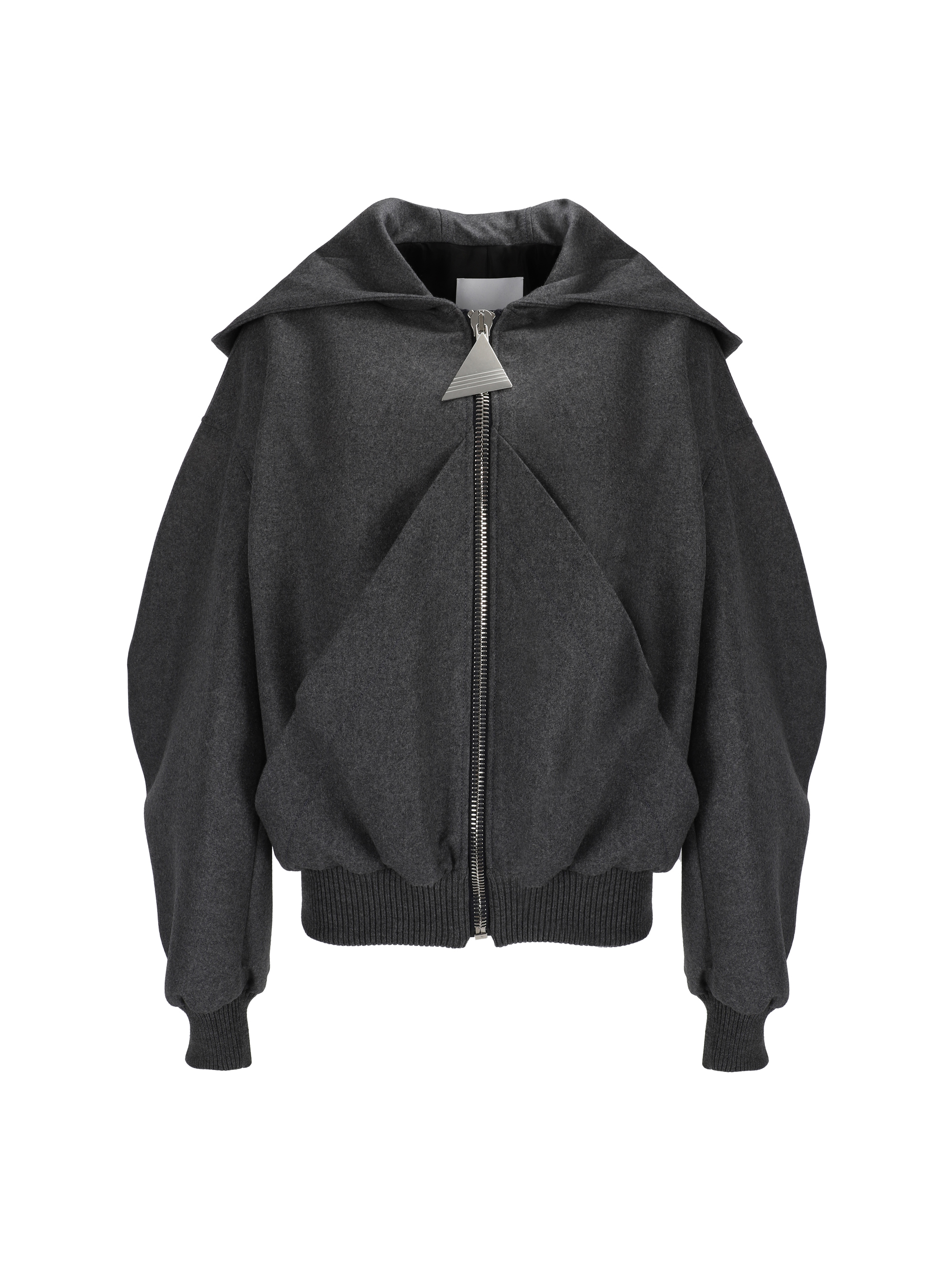 Wool Jacket by The Attic, front zipper closure with iconic metallic maxi logo, oversize hood, two large front pockets, balloon sleeves with ribbed cuffs, ribbed hem, monochrome pattern, oversize fit.
