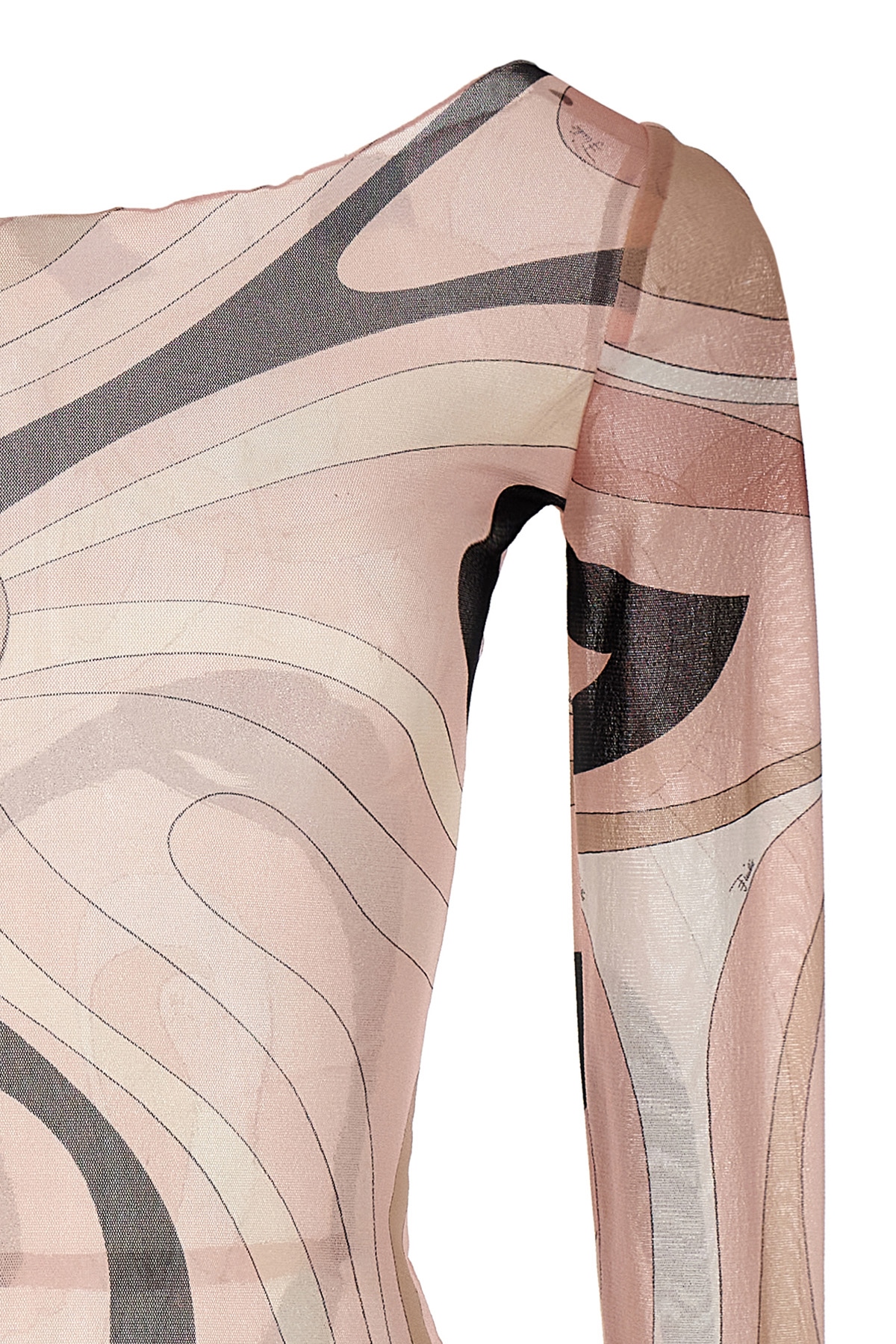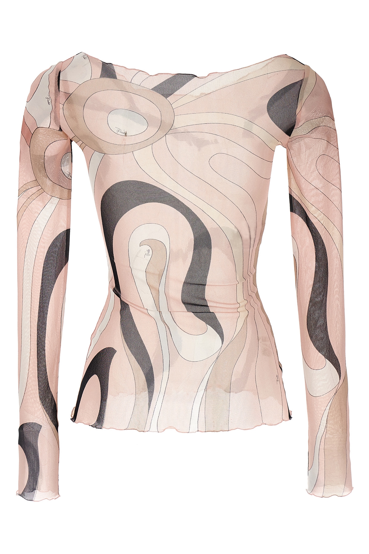 Semi-transparent stretch light tulle top with all-over marble print, boat neck, long sleeves, wavy piping.