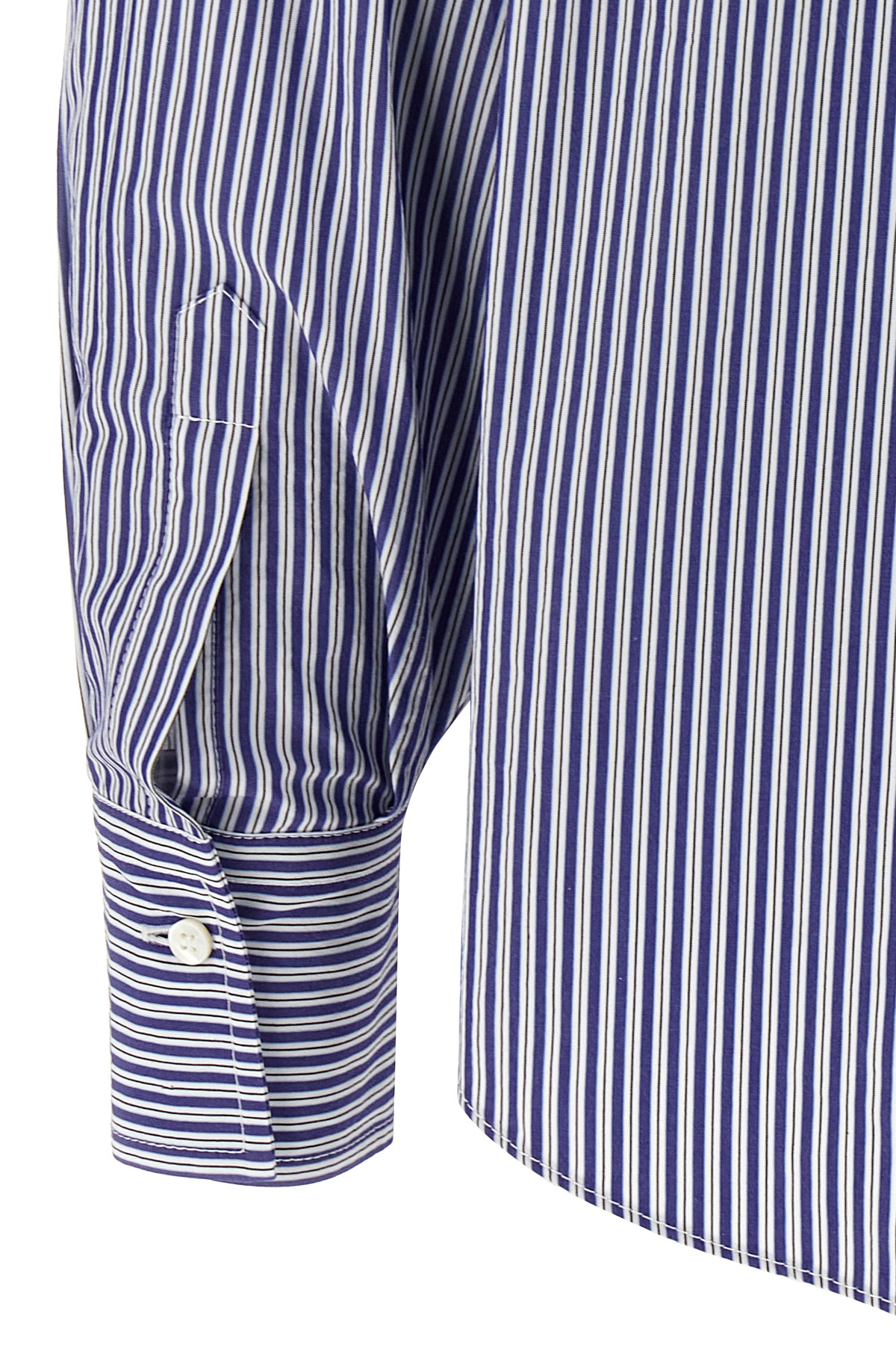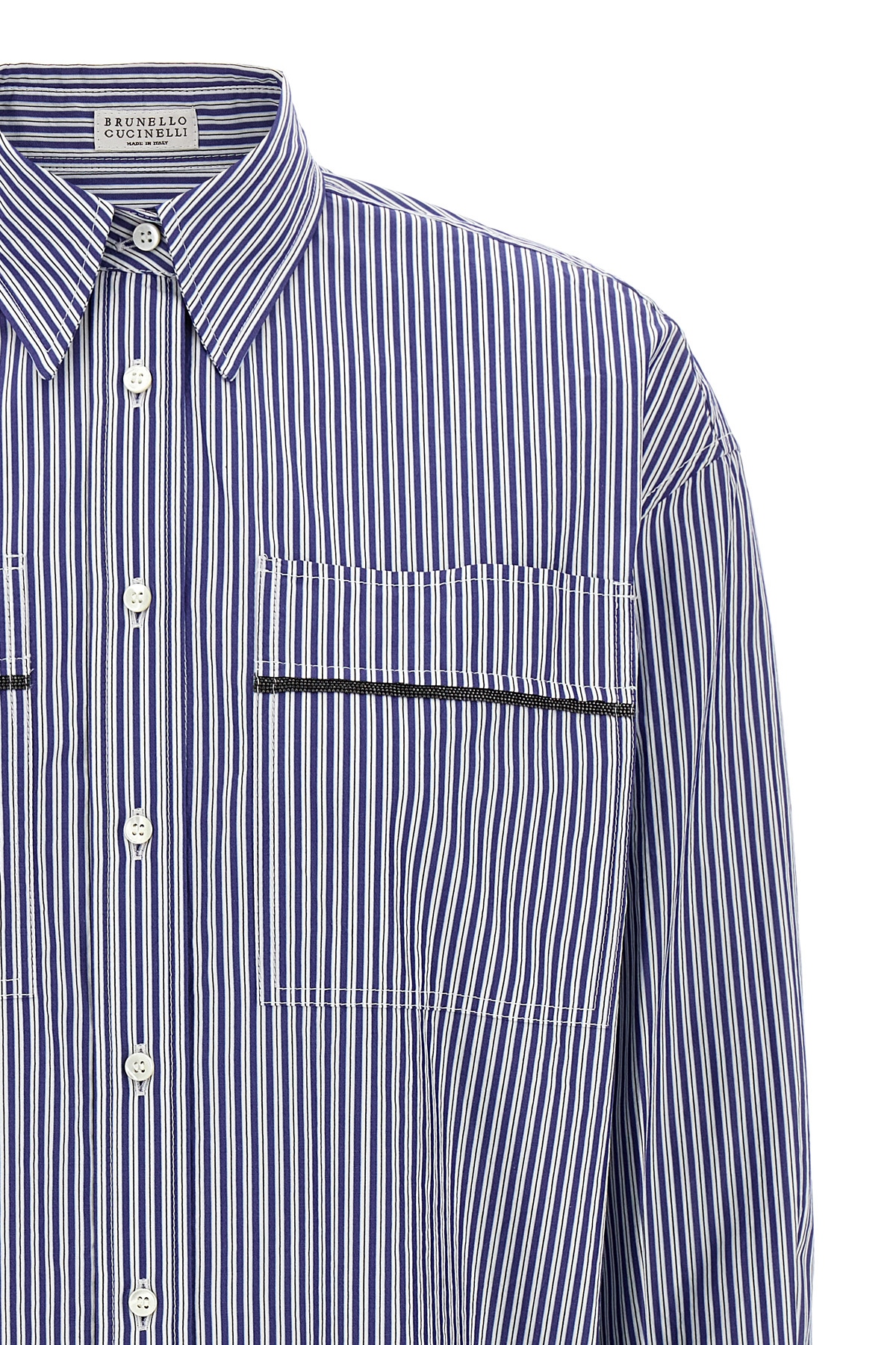 Striped cotton shirt, pockets with Monile detail, front button closure, long cuffed sleeves.