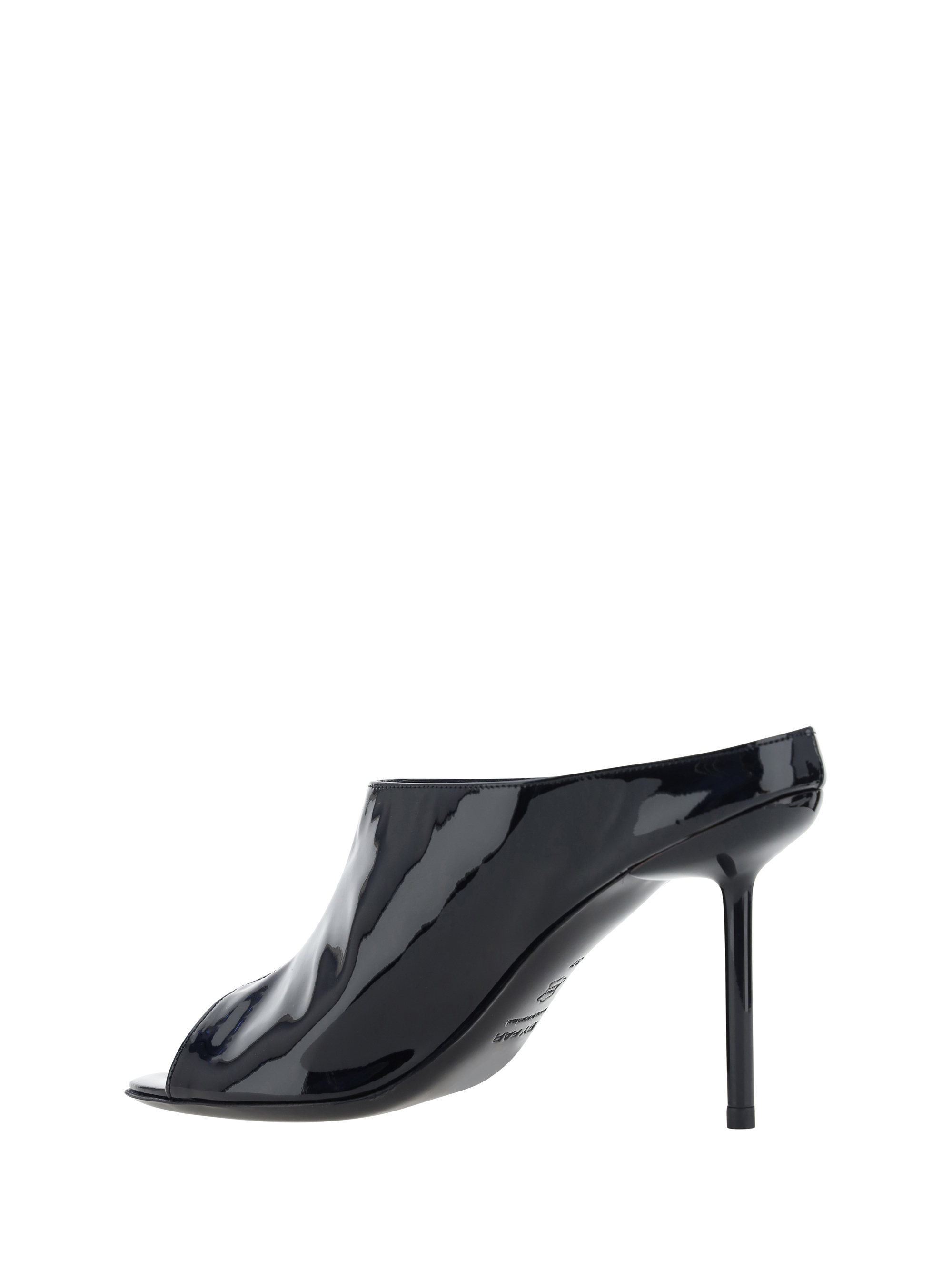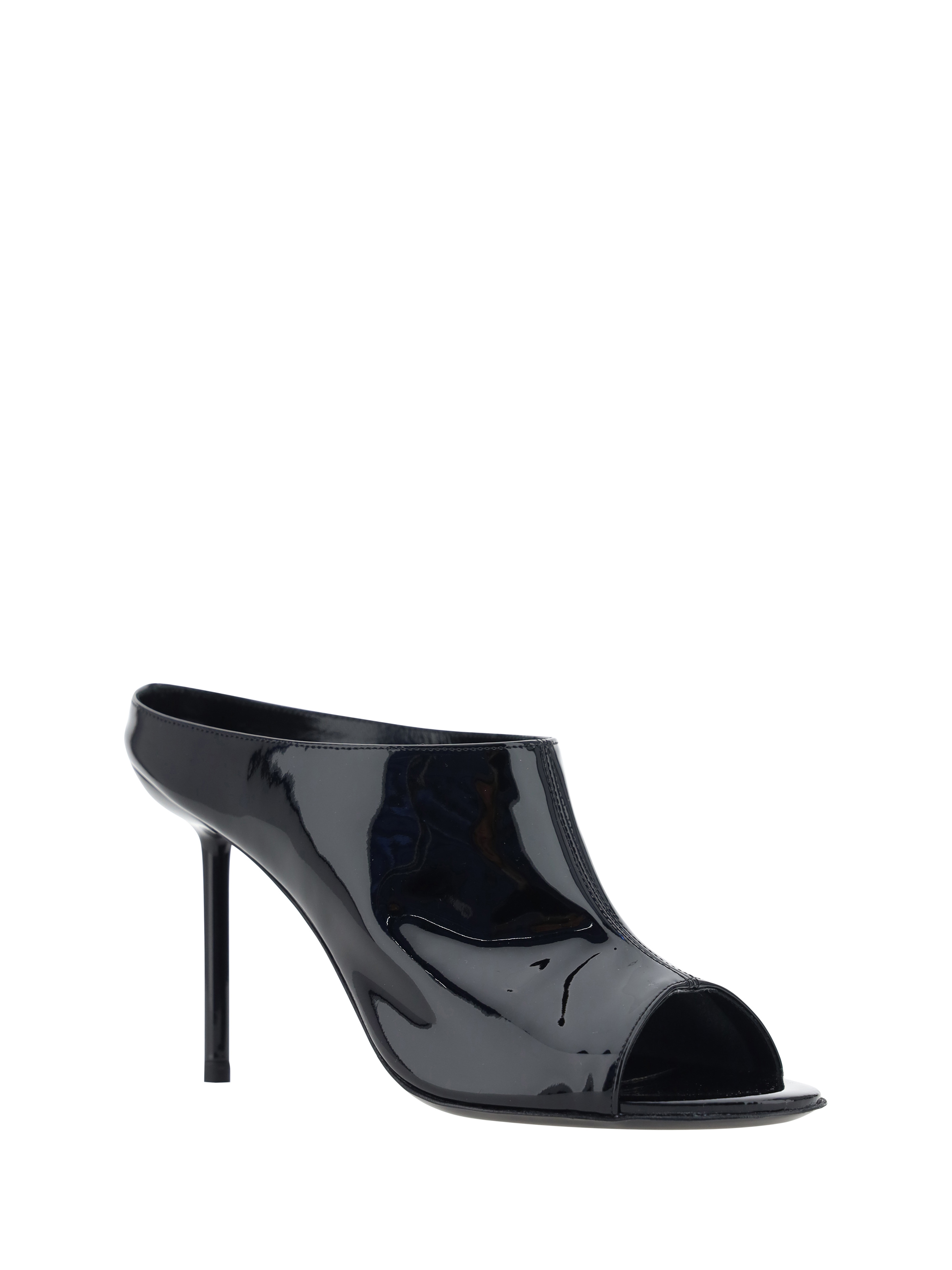 Calfskin Marlene Sandals by By Far, patent leather design, open front toe, leather stiletto heel, logo-embossed insole.