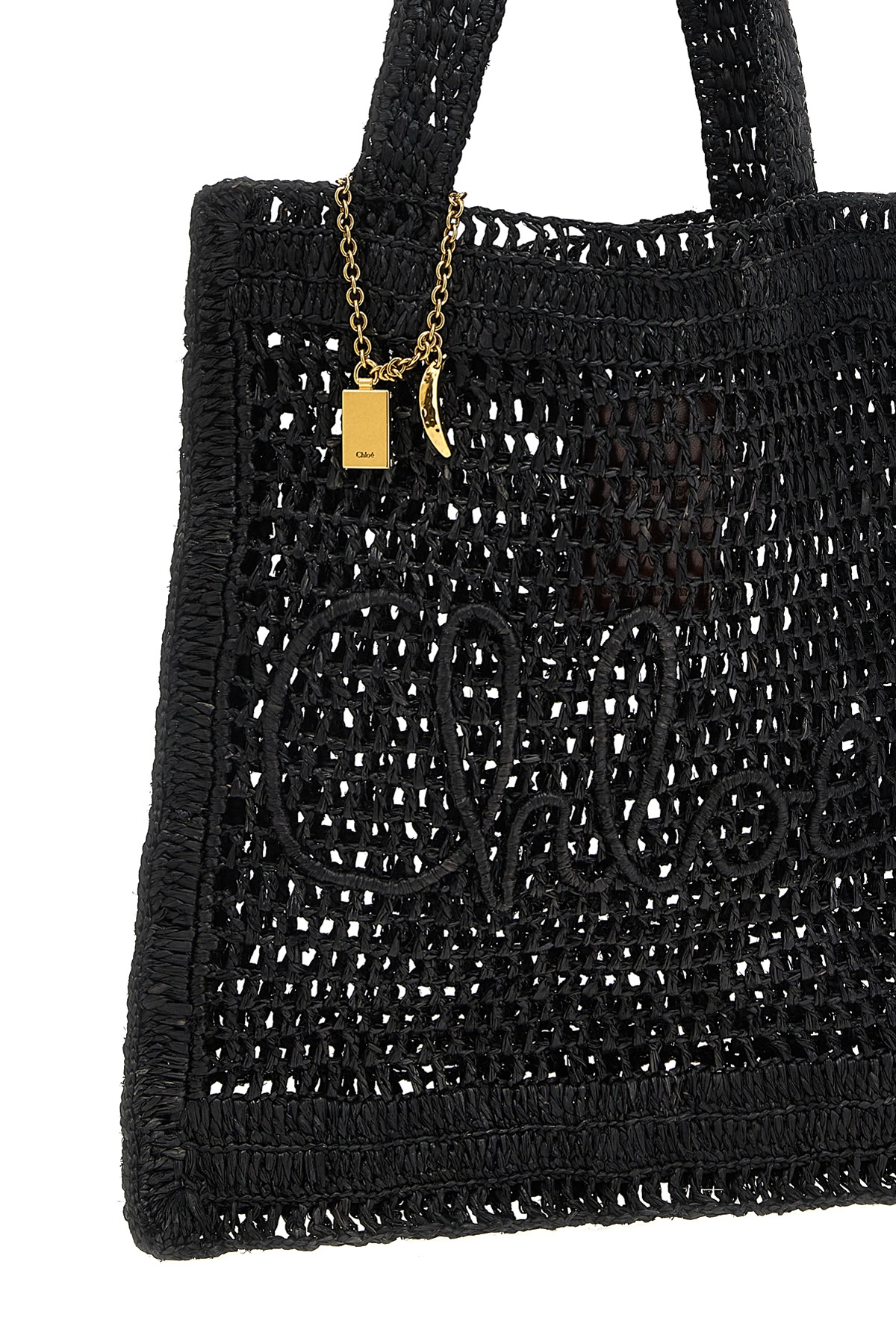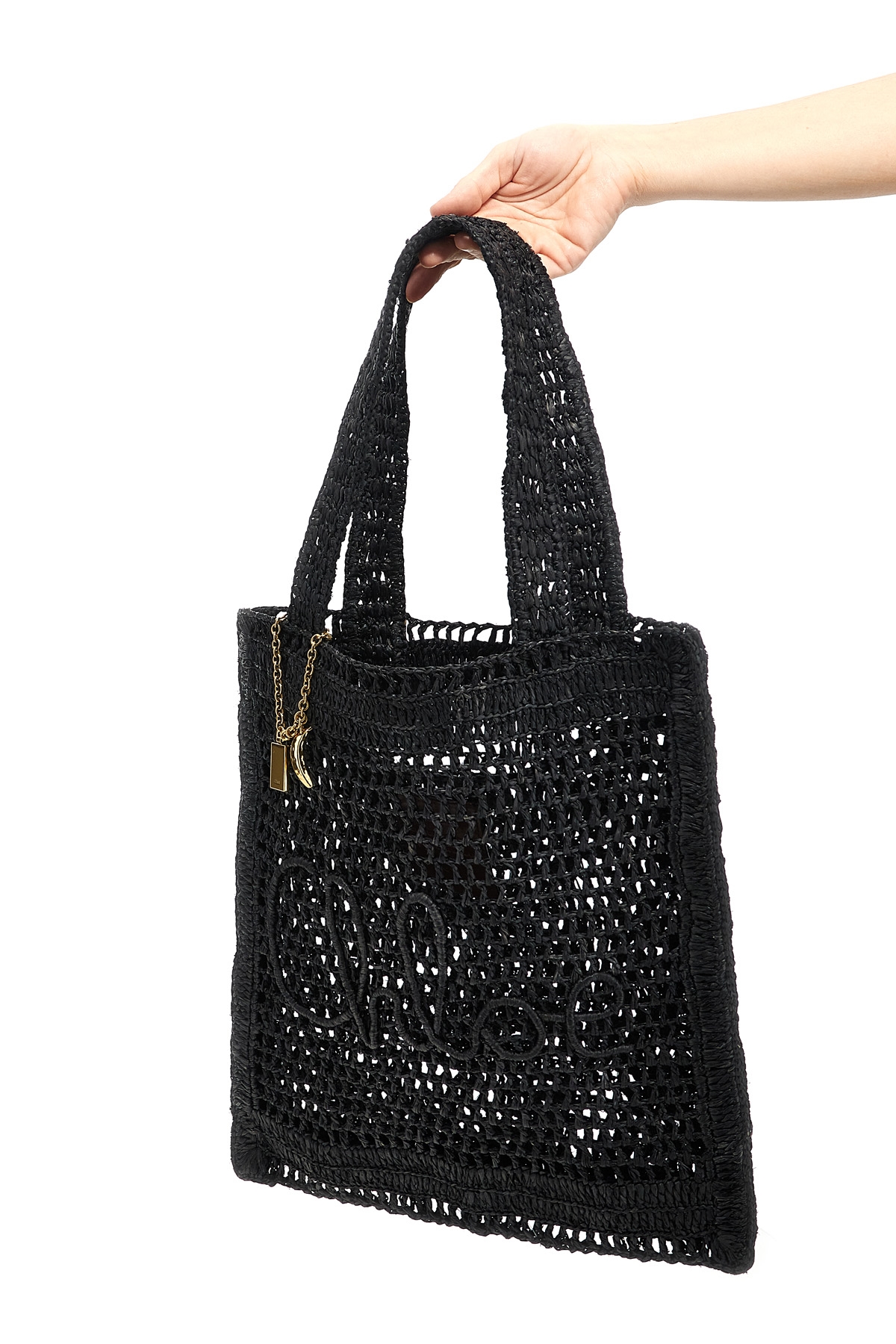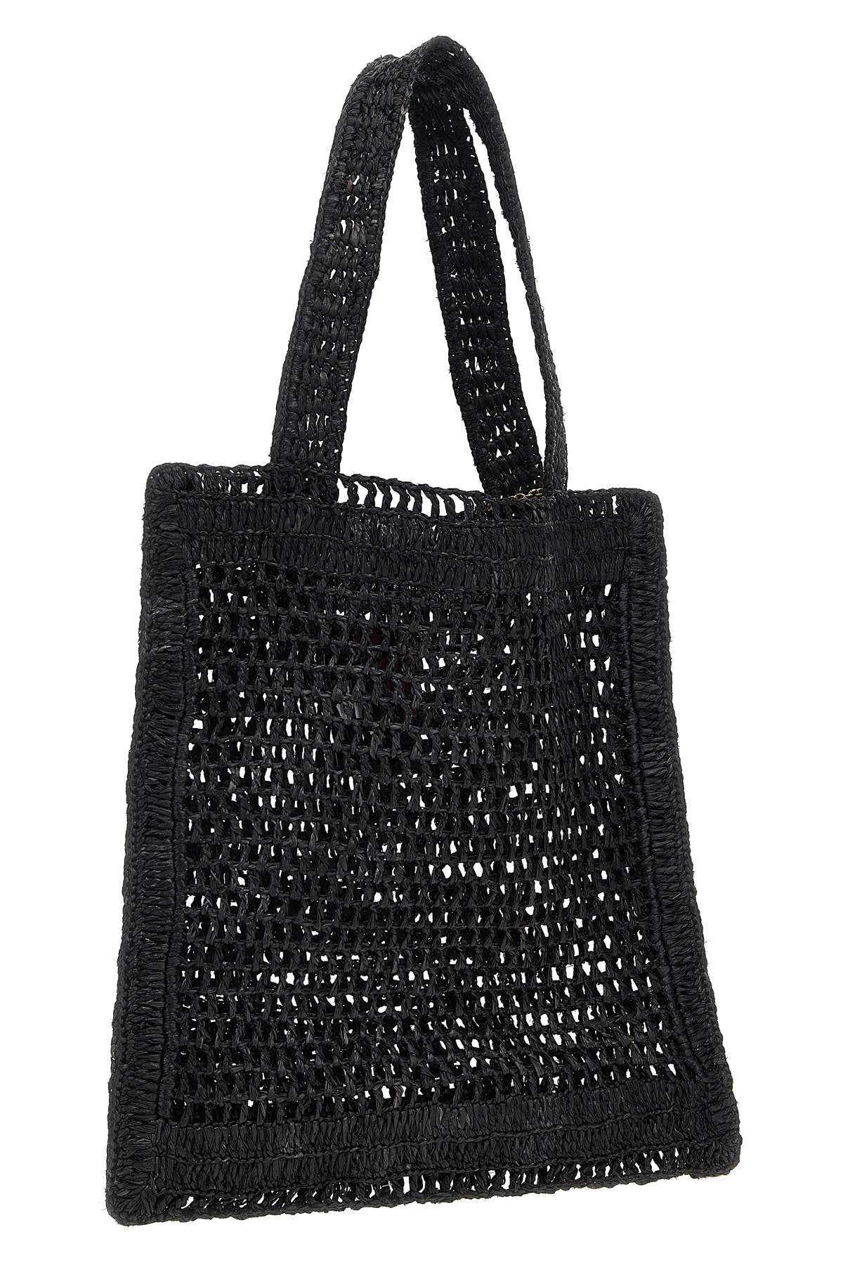 'Summer Banana' raffia shopping bag with water repellent treatment, front logo, double fixed handle, removable metal pendant. In collaboration with Made For A Woman.