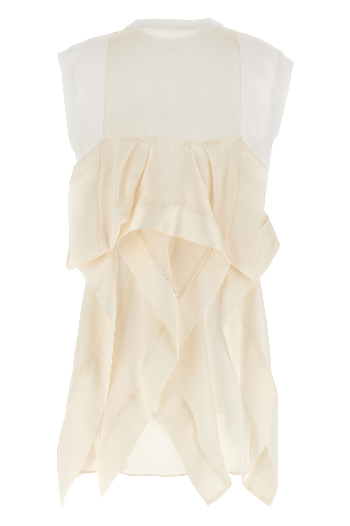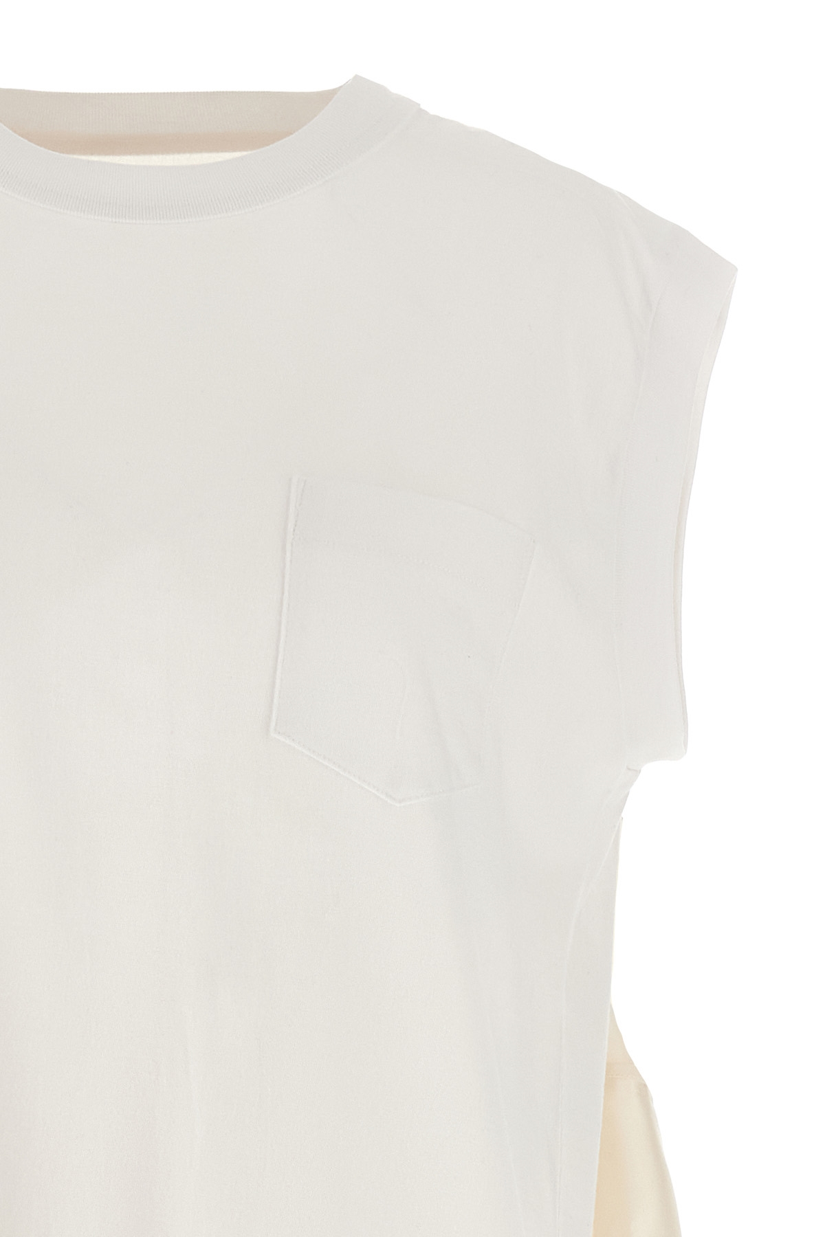 Cotton, crewneck t-shirt, front pocket, back patch ruffles, asymmetric length, short sleeves.