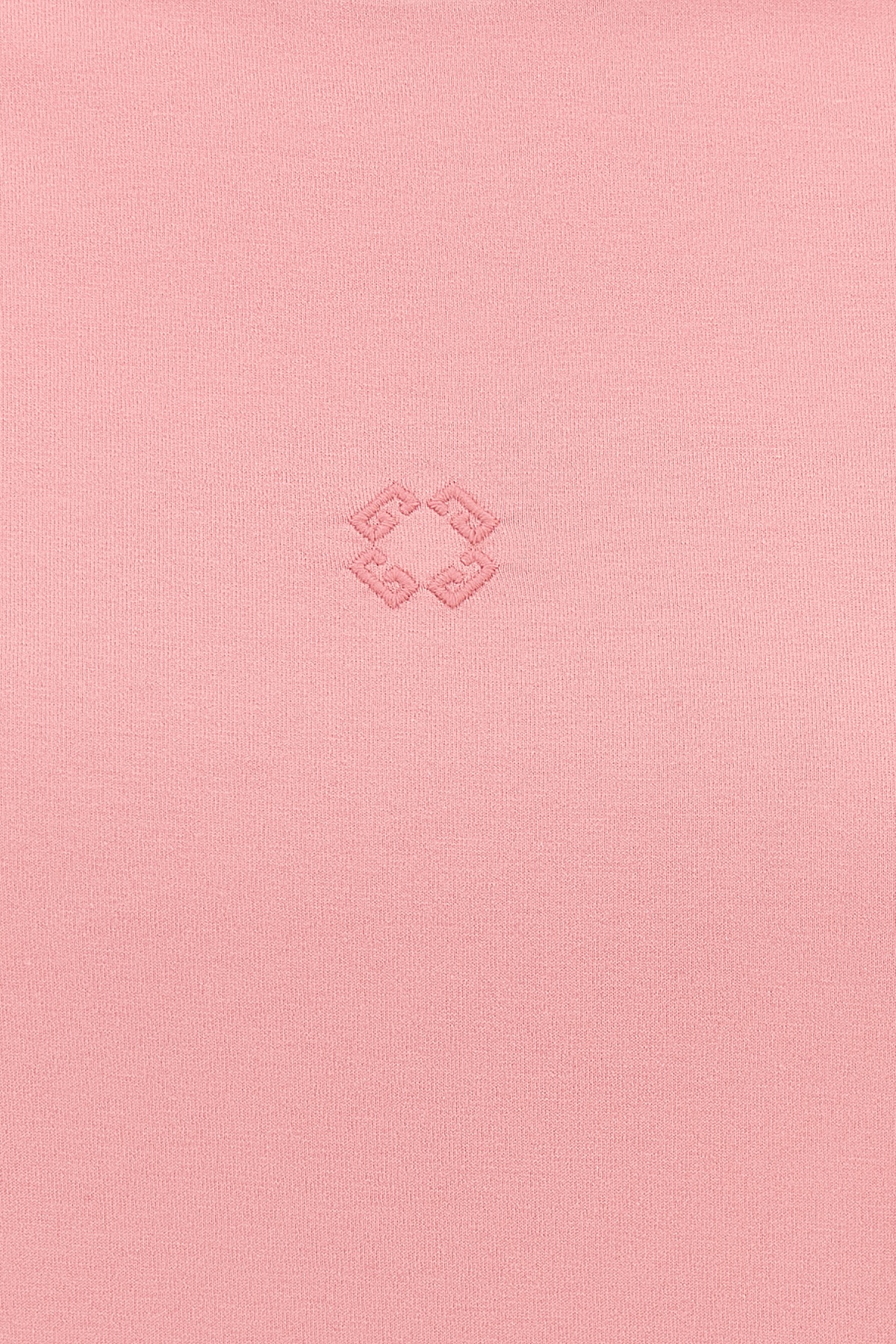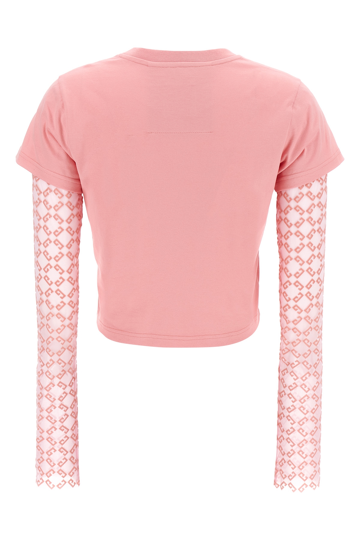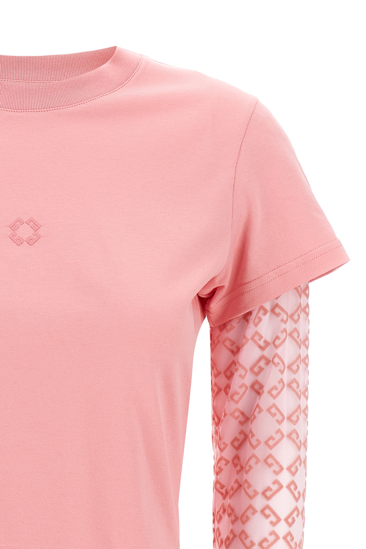 'cropped' cotton crew neck T-shirt with front logo embroidery, semi-transparent tulle long sleeve detail with all-over 'G' detail.