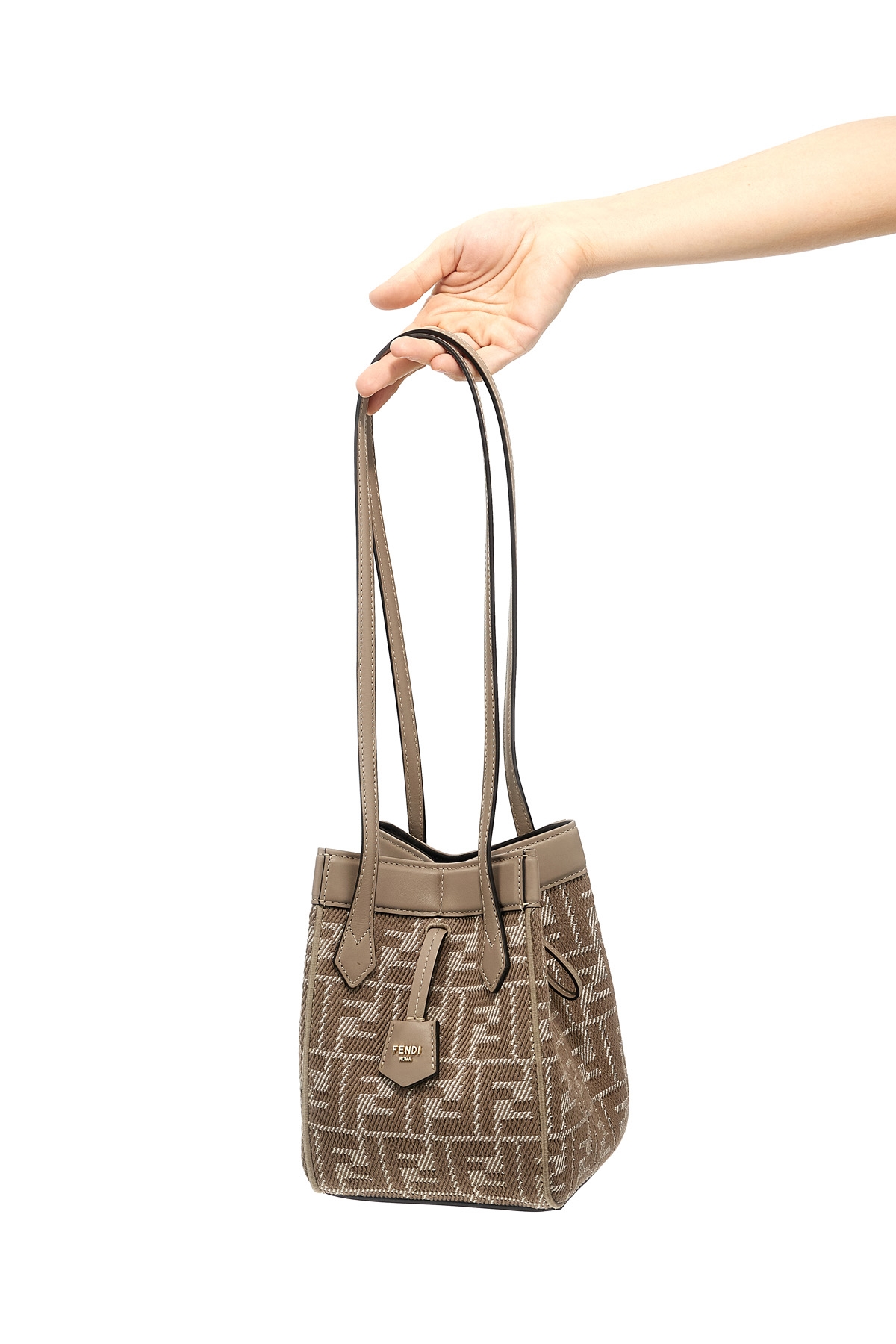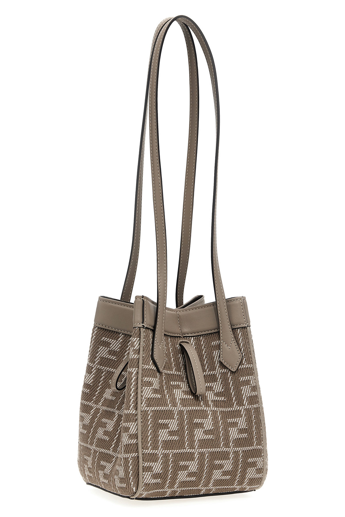 'Fendi Origami Mini' leather shoulder bag with tone-on-tone FF jacquard jacquard side inserts, magnetic closure, drawstring, metal keyring with lettering logo. It can be used as a bucket or shopping bag thanks to magnets and laces.