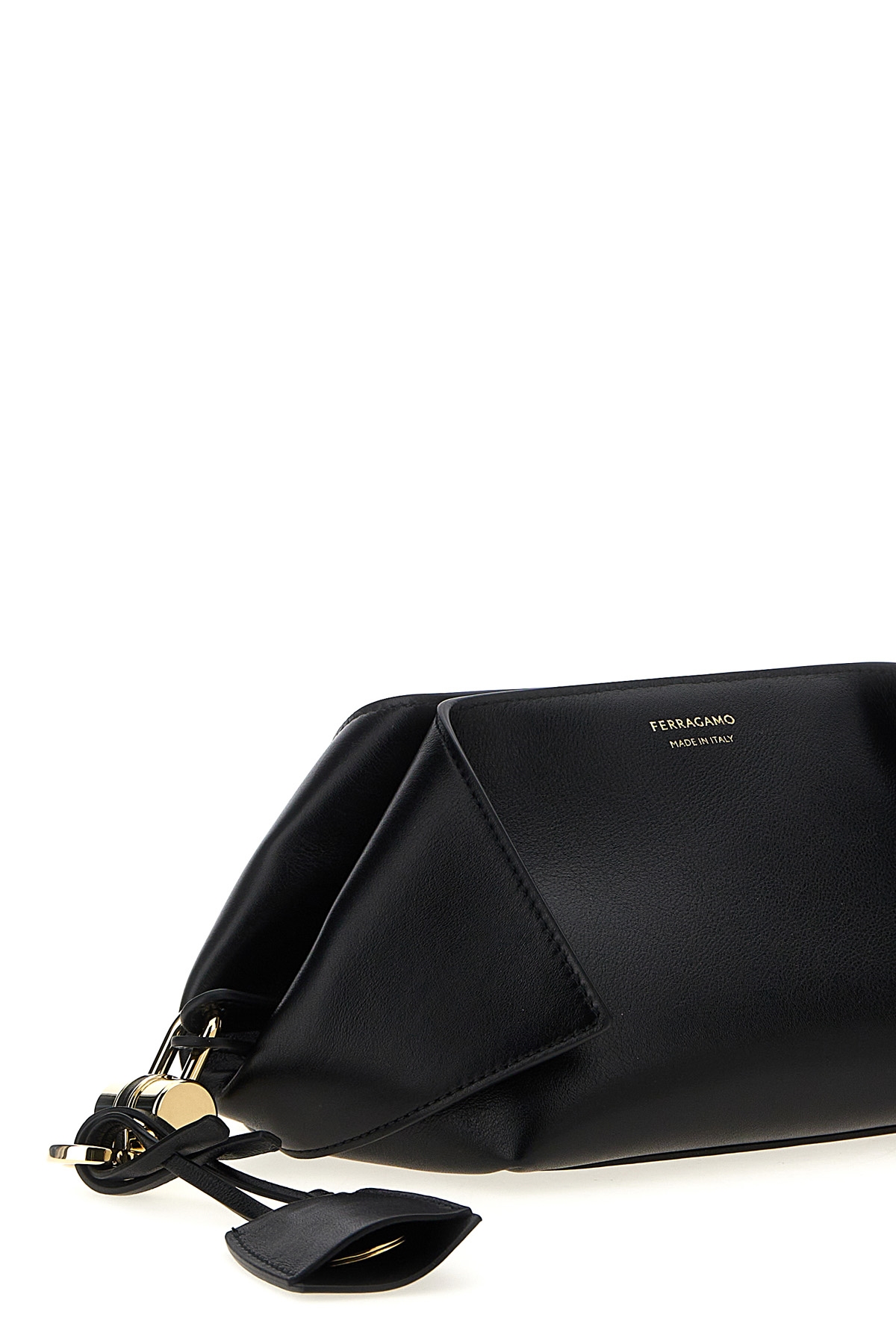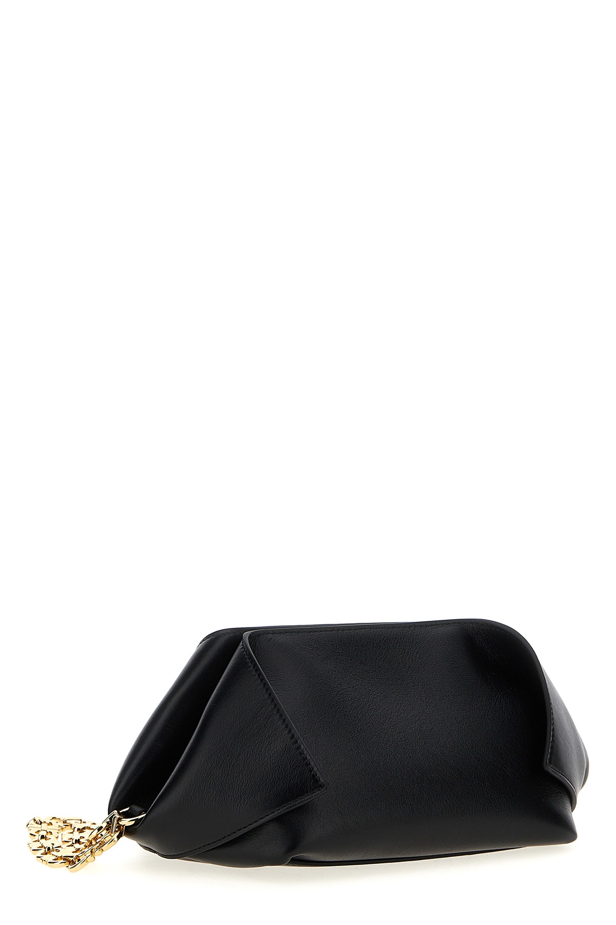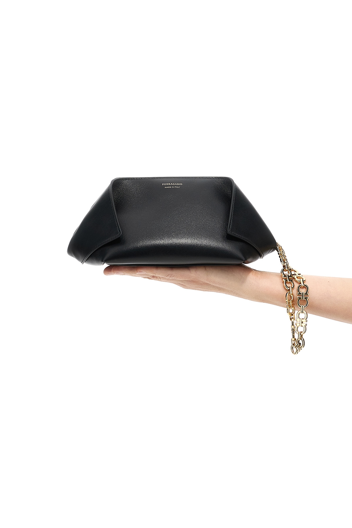 Leather clutch with folded corners, front embossed logo, zip and magnetic closure, logo handle chain, removable keychain.